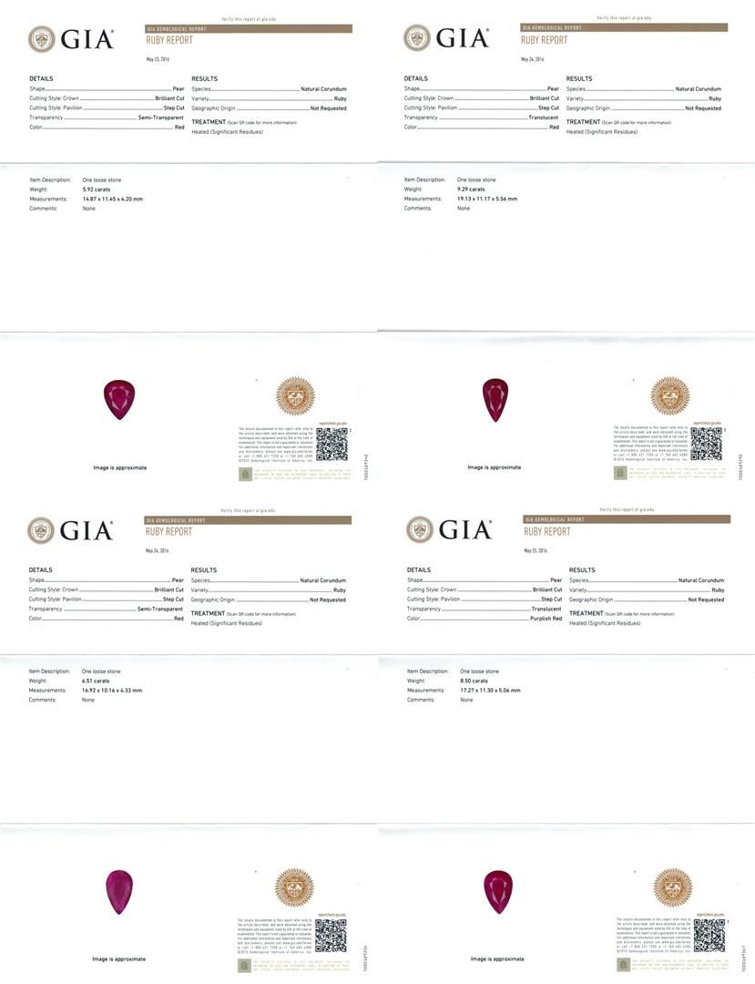 One Suite containing : One pair electronically tested 18KT white gold lady's combination cast & assembled fashion dangle earrings with heavy friction backs with a bright polish finish. Identified with markings of '18K'. Condition is new, good workmanship. Containing: One prong set pear modified mixed cut natural ruby, measuring 14.65 x 9.92 x 4.31mm, (depth est.) approximate weight of 5.08ct., clarity is heavily included, medium dark, moderately strong, red color, (GIA R 6/4), cut is good. Transmitting light somewhat diffusely, semi-transparent to translucent. Indications of laboratory high temperature heat treatment. Colored gemstones are presumed to have been subjected to commonly used enhancement processes. Graded loose prior to setting in the GIA Laboratory, Report #2175603386. One prong set pear modified mixed cut natural ruby, measuring 14.63 x 10.10 x 4.06mm, (depth est.) approximate weight of 4.81ct., clarity is heavily included, medium dark, moderately strong, red color, (GIA R 6/4), cut is good. Transmitting light somewhat diffusely, semi-transparent to translucent. Indications of laboratory high temperature heat treatment. Colored gemstones are presumed to have been subjected to commonly used enhancement processes. Graded loose prior to setting in the GIA Laboratory, Report #1176603518. Forty prong set round brilliant cut diamonds, measuring 2.15 - 2.05 x 1.30mm (depth est.) approximate total weight of 40 Stones = 1.42ct. Graded in the setting. Clarity VS-2 to SI-2. Color: H - I Cut Good Two bezel set round brilliant cut diamonds, measuring 2.50 - 2.40 x 1.52mm (depth est.) approximate total weight of 2 Stones = 0.11ct. Graded in the setting. Clarity SI-1. Color: G - H Cut Good Twelve prong set round brilliant cut diamonds, measuring 1.60 - 1.55 x 0.98mm (depth est.) approximate total weight of 12 Stones = 0.18ct. Graded in the setting. Clarity SI-1 to SI-2. Color: H - I Cut Good. Total Weight of Colored Stones 9.89ct.. Total Weight of Diamonds 1.71ct.. Total Weight of Earrings 12.70gm. One electronically tested 18KT white gold lady's combination cast & assembled fashion necklace with a tongue clasp & foldover safety with a bright polish finish. The featured lady's necklace has a scalloped link motif with five pear shaped halo dangles and measures 17.5 inches in length. Identified with markings of "18K". Condition is new, good workmanship. Containing: One prong set pear modified mixed cut natural ruby, measuring 19.13 x 11.17 x 5.56mm, (depth est.) approximate weight of 9.29ct., clarity is heavily included, medium dark, moderately strong, red color, (GIA R 6/4), cut is good. Transmitting light somewhat diffusely, semi-transparent to translucent. Indications of laboratory high temperature heat treatment. Colored gemstones are presumed to have been subjected to commonly used enhancement processes. Graded loose prior to setting in the GIA Laboratory, Report #2175603522.One prong set pear modified mixed cut natural ruby, measuring 17.27 x 11.30 x 5.06mm, (depth est.) 8%. bulge factor, approximate weight of 8.50ct., clarity is heavily included, medium dark, moderately strong, strongly purplish red color, (GIA stpR 6/4), cut is good. Transmitting light somewhat diffusely, semi-transparent to translucent. Indications of laboratory high temperature heat treatment. Colored gemstones are presumed to have been subjected to commonly used enhancement processes. Graded loose prior to setting in the GIA Laboratory, Report #2175603390.One pave' set pear modified mixed cut natural ruby, measuring 16.92 x 10.16 x 4.33mm, (depth est.) 9%. bulge factor, approximate weight of 6.51ct., clarity is heavily included, medium dark, moderately strong, red color, (GIA R 6/4), cut is good. Transmitting light somewhat diffusely, semi-transparent to translucent. Indications of laboratory high temperature heat treatment. Colored gemstones are presumed to have been subjected to commonly used enhancement processes. Graded loose prior to setting in the GIA Laboratory, Report #2175603589.One prong set pear modified mixed cut natural ruby, measuring 14.87 x 11.45 x 4.20mm, (depth est.) 3%. bulge factor, approximate weight of 5.92ct., clarity is heavily included, medium dark, moderately strong, red color, (GIA R 6/4), cut is good. Transmitting light somewhat diffusely, semi-transparent to translucent. Indications of laboratory high temperature heat treatment. Colored gemstones are presumed to have been subjected to commonly used enhancement processes. Graded loose prior to setting in the GIA Laboratory, Report #1172603533.One prong set pear modified mixed cut natural ruby, measuring 14.69 x 8.75 x 4.70mm, (depth est.) approximate weight of 4.69ct., clarity is heavily included, medium dark, moderately strong, red color, (GIA R 6/4), cut is good. Transmitting light somewhat diffusely, semi-transparent to translucent. Indications of laboratory high temperature heat treatment. Colored gemstones are presumed to have been subjected to commonly used enhancement processes. Graded loose prior to setting in the GIA Laboratory, Report #2171603587.Nine bezel set round brilliant cut diamonds, measuring 2.60 - 2.50 x 1.58mm (depth est.) approximate. Total Weight of 9 Stones = 0.57ct. Graded in the setting. Clarity: SI-1 to SI-2. Color: H - I. Cut Good One Hundred Two prong set round brilliant cut diamonds, measuring 2.15 - 2.10 x 1.32mm (depth est.) approximate. Total Weight of 102 Stones = 3.72ct. Graded in the setting. Clarity: VS-2 to SI-2. Color: H - I. Cut Good Eighty-Two prong set round brilliant cut diamonds, measuring 1.60 - 1.40 x 0.93mm (depth est.) approximate. Total Weight of 82 Stones = 1.04ct. Graded in the setting. Clarity: VS-2 to SI-2. Color: H - I. Cut Good. Total Weight of Colored Stones 34.91ct. Total Weight of Diamonds 5.33ct. Total Weight of Necklace 54.20gm. GAS Appraised at $94,135.00.