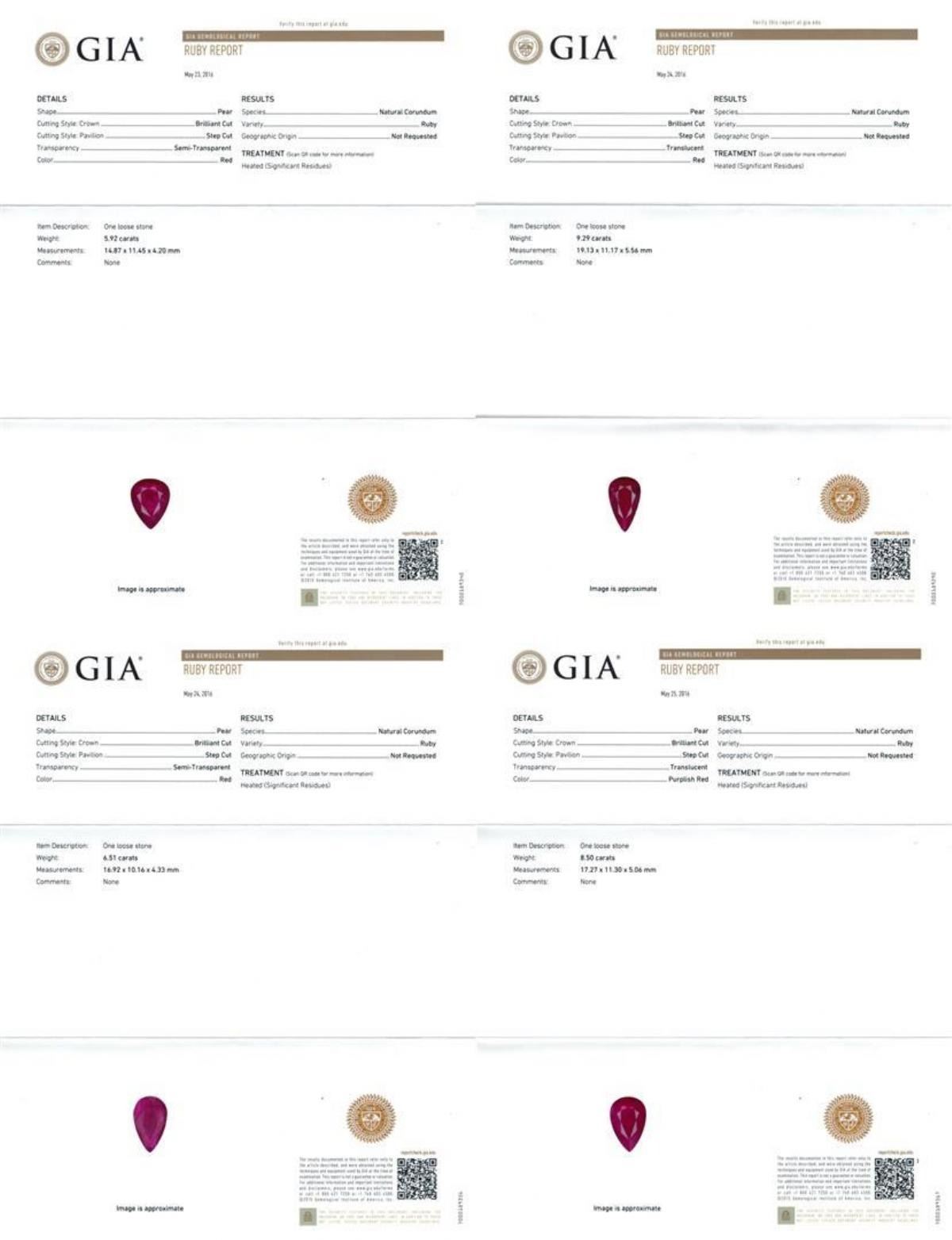 One Suite containing : One pair electronically tested 18KT white gold lady's combination cast & assembled fashion dangle earrings with heavy friction backs with a bright polish finish. Identified with markings of '18K'. Condition is new, good workmanship. Containing: One prong set pear modified mixed cut natural ruby, measuring 14.65 x 9.92 x 4.31mm, (depth est.) approximate weight of 5.08ct., clarity is heavily included, medium dark, moderately strong, red color, (GIA R 6/4), cut is good. Transmitting light somewhat diffusely, semi-transparent to translucent. Indications of laboratory high temperature heat treatment. Colored gemstones are presumed to have been subjected to commonly used enhancement processes. Graded loose prior to setting in the GIA Laboratory, Report #2175603386. One prong set pear modified mixed cut natural ruby, measuring 14.63 x 10.10 x 4.06mm, (depth est.) approximate weight of 4.81ct., clarity is heavily included, medium dark, moderately strong, red color, (GIA R 6/4), cut is good. Transmitting light somewhat diffusely, semi-transparent to translucent. Indications of laboratory high temperature heat treatment. Colored gemstones are presumed to have been subjected to commonly used enhancement processes. Graded loose prior to setting in the GIA Laboratory, Report #1176603518. Forty prong set round brilliant cut diamonds, measuring 2.15 - 2.05 x 1.30mm (depth est.) approximate total weight of 40 Stones = 1.42ct. Graded in the setting. Clarity VS-2 to SI-2. Color: H - I Cut Good Two bezel set round brilliant cut diamonds, measuring 2.50 - 2.40 x 1.52mm (depth est.) approximate total weight of 2 Stones = 0.11ct. Graded in the setting. Clarity SI-1. Color: G - H Cut Good Twelve prong set round brilliant cut diamonds, measuring 1.60 - 1.55 x 0.98mm (depth est.) approximate total weight of 12 Stones = 0.18ct. Graded in the setting. Clarity SI-1 to SI-2. Color: H - I Cut Good. Total Weight of Colored Stones 9.89ct.. Total Weight of Diamonds 1.71ct.. Total Weight of Earrings 12.70gm. One electronically tested 18KT white gold lady's combination cast & assembled fashion necklace with a tongue clasp & foldover safety with a bright polish finish. The featured lady's necklace has a scalloped link motif with five pear shaped halo dangles and measures 17.5 inches in length. Identified with markings of "18K". Condition is new, good workmanship. Containing: One prong set pear modified mixed cut natural ruby, measuring 19.13 x 11.17 x 5.56mm, (depth est.) approximate weight of 9.29ct., clarity is heavily included, medium dark, moderately strong, red color, (GIA R 6/4), cut is good. Transmitting light somewhat diffusely, semi-transparent to translucent. Indications of laboratory high temperature heat treatment. Colored gemstones are presumed to have been subjected to commonly used enhancement processes. Graded loose prior to setting in the GIA Laboratory, Report #2175603522.One prong set pear modified mixed cut natural ruby, measuring 17.27 x 11.30 x 5.06mm, (depth est.) 8%. bulge factor, approximate weight of 8.50ct., clarity is heavily included, medium dark, moderately strong, strongly purplish red color, (GIA stpR 6/4), cut is good. Transmitting light somewhat diffusely, semi-transparent to translucent. Indications of laboratory high temperature heat treatment. Colored gemstones are presumed to have been subjected to commonly used enhancement processes. Graded loose prior to setting in the GIA Laboratory, Report #2175603390.One pave' set pear modified mixed cut natural ruby, measuring 16.92 x 10.16 x 4.33mm, (depth est.) 9%. bulge factor, approximate weight of 6.51ct., clarity is heavily included, medium dark, moderately strong, red color, (GIA R 6/4), cut is good. Transmitting light somewhat diffusely, semi-transparent to translucent. Indications of laboratory high temperature heat treatment. Colored gemstones are presumed to have been subjected to commonly used enhancement processes. Graded loose prior to setting in the GIA Laboratory, Report #2175603589.One prong set pear modified mixed cut natural ruby, measuring 14.87 x 11.45 x 4.20mm, (depth est.) 3%. bulge factor, approximate weight of 5.92ct., clarity is heavily included, medium dark, moderately strong, red color, (GIA R 6/4), cut is good. Transmitting light somewhat diffusely, semi-transparent to translucent. Indications of laboratory high temperature heat treatment. Colored gemstones are presumed to have been subjected to commonly used enhancement processes. Graded loose prior to setting in the GIA Laboratory, Report #1172603533.One prong set pear modified mixed cut natural ruby, measuring 14.69 x 8.75 x 4.70mm, (depth est.) approximate weight of 4.69ct., clarity is heavily included, medium dark, moderately strong, red color, (GIA R 6/4), cut is good. Transmitting light somewhat diffusely, semi-transparent to translucent. Indications of laboratory high temperature heat treatment. Colored gemstones are presumed to have been subjected to commonly used enhancement processes. Graded loose prior to setting in the GIA Laboratory, Report #2171603587.Nine bezel set round brilliant cut diamonds, measuring 2.60 - 2.50 x 1.58mm (depth est.) approximate. Total Weight of 9 Stones = 0.57ct. Graded in the setting. Clarity: SI-1 to SI-2. Color: H - I. Cut Good One Hundred Two prong set round brilliant cut diamonds, measuring 2.15 - 2.10 x 1.32mm (depth est.) approximate. Total Weight of 102 Stones = 3.72ct. Graded in the setting. Clarity: VS-2 to SI-2. Color: H - I. Cut Good Eighty-Two prong set round brilliant cut diamonds, measuring 1.60 - 1.40 x 0.93mm (depth est.) approximate. Total Weight of 82 Stones = 1.04ct. Graded in the setting. Clarity: VS-2 to SI-2. Color: H - I. Cut Good. Total Weight of Colored Stones 34.91ct. Total Weight of Diamonds 5.33ct. Total Weight of Necklace 54.20gm. GAS Appraised.