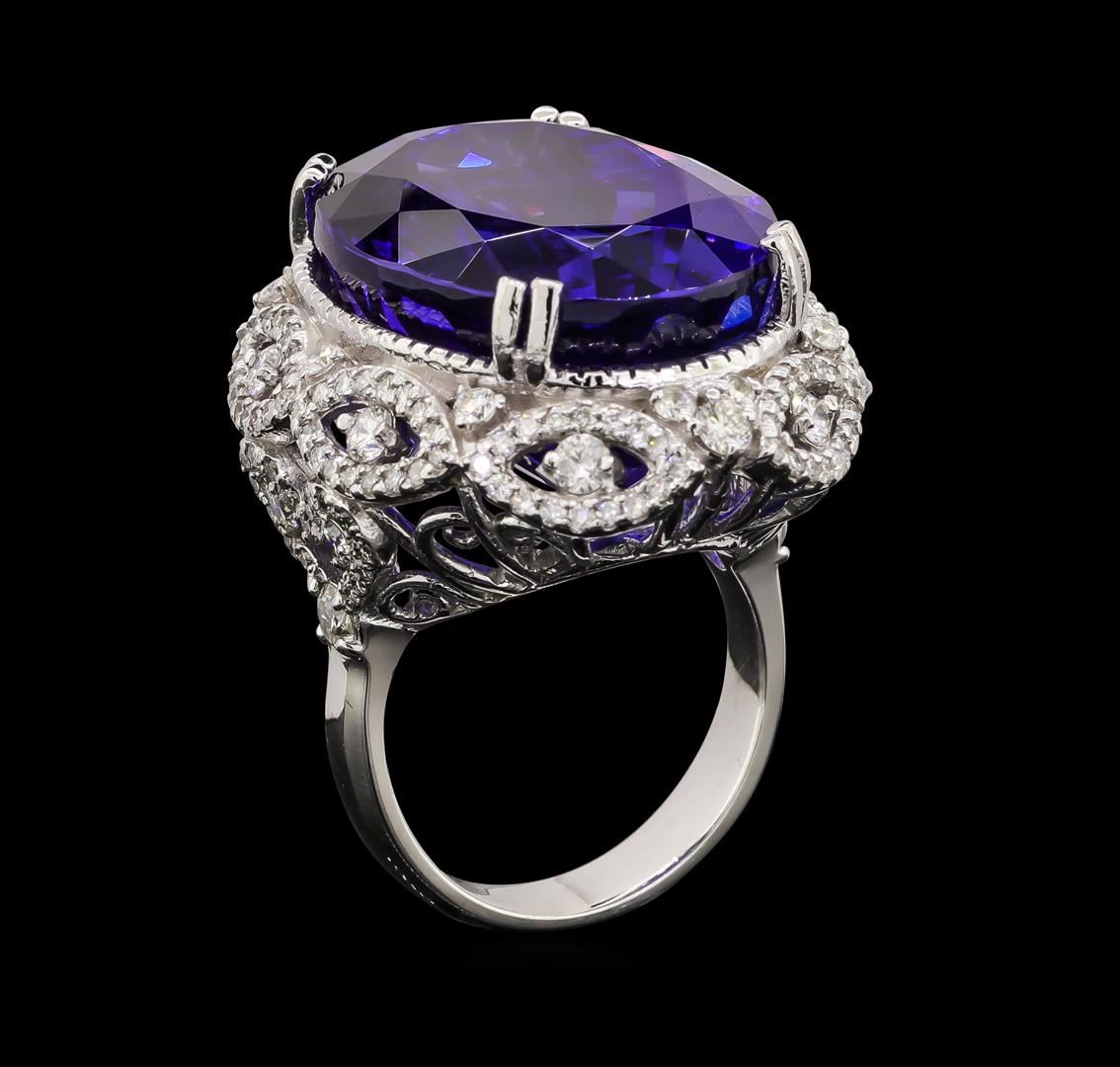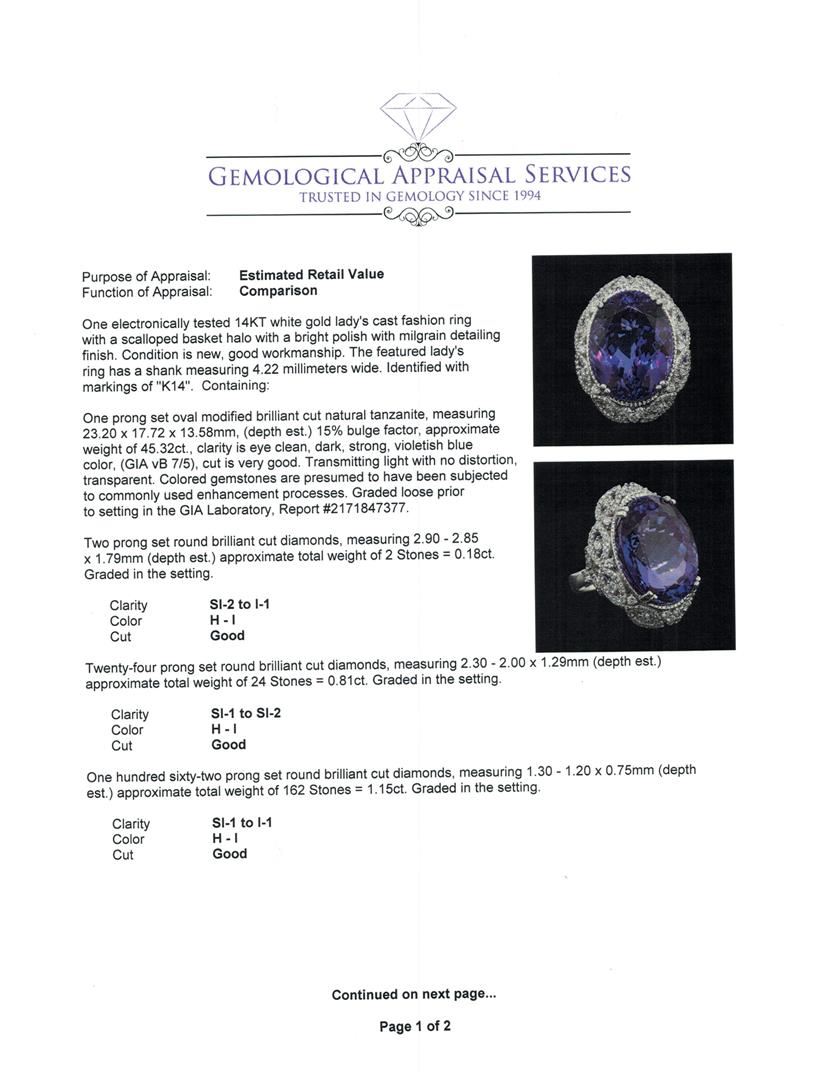One electronically tested 14KT white gold lady's cast fashion ring with a scalloped basket halo with a bright polish with milgrain detailing finish. The featured lady's ring has a shank measuring 4.22 millimeters wide. Identified with markings of 'K14'. Condition is new, good workmanship. Containing: One prong set oval modified brilliant cut natural tanzanite, measuring 23.20 x 17.72 x 13.58mm, (depth est.) 15%. bulge factor, approximate weight of 45.32ct., clarity is eye clean, dark, strong, violetish blue color, (GIA vB 7/5), cut is very good. Transmitting light with no distortion, transparent. Colored gemstones are presumed to have been subjected to commonly used enhancement processes. Graded loose prior to setting in the GIA Laboratory, Report #2171847377. Two prong set round brilliant cut diamonds, measuring 2.90 - 2.85 x 1.79mm (depth est.) approximate total weight of 2 Stones = 0.18ct. Graded in the setting. Clarity SI-2 to I-1. Color: H - I Cut Good Twenty-Four prong set round brilliant cut diamonds, measuring 2.30 - 2.00 x 1.29mm (depth est.) approximate total weight of 24 Stones = 0.81ct. Graded in the setting. Clarity SI-1 to SI-2. Color: H - I Cut Good One Hundred Sixty-Two prong set round brilliant cut diamonds, measuring 1.30 - 1.20 x 0.75mm (depth est.) approximate total weight of 162 Stones = 1.15ct. Graded in the setting. Clarity SI-1 to I-1. Color: H - I Cut Good. Total Weight of Colored Stones 45.32ct.. Total Weight of Diamonds 2.14ct.. Total Weight of Ring 22.90gm. GAS Appraised at $68,465.00.