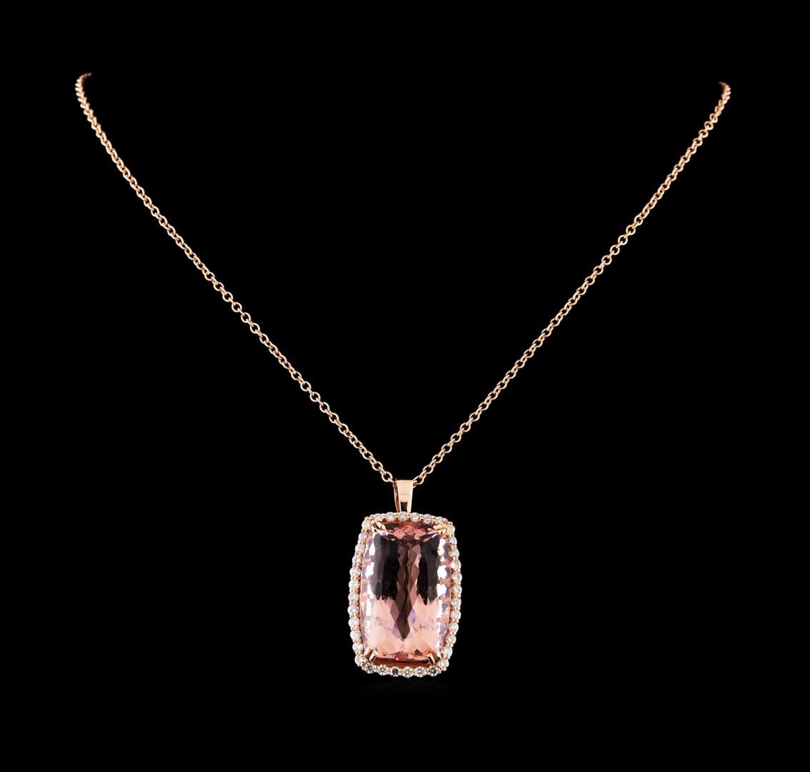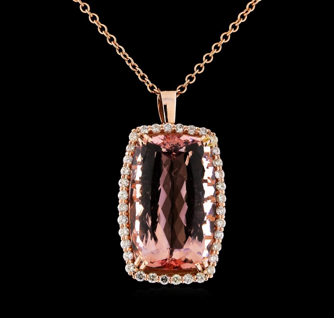 One prong set cushion modified brilliant cut natural morganite, measuring 30.00 x 19.06 x 11.93mm, exact weight 47.80ct., clarity is slightly included, type I, cut is good. Transmitting light with no distortion, transparent. GIA Colored Stone Grading Report attached. Graded loose prior to setting in the GIA Laboratory, Report # 2151957692.Thirty-Six prong set round brilliant cut diamonds, measuring 2.30 - 2.20 x 1.35mm (depth est.) approximate total weight of 36 Stones = 1.60ct. Color & clarity grade are an average for the group. Graded in the setting. Clarity: SI-2 to I-2. Color: G - I. Total Weight of Colored Stones 47.80ct. Total Weight of Diamonds 1.60ct. Total Weight of Pendant With Chain 22.83gm. AIG Appraised at $32,325.00.