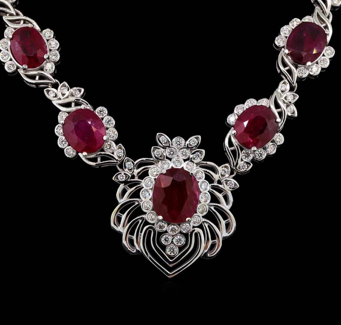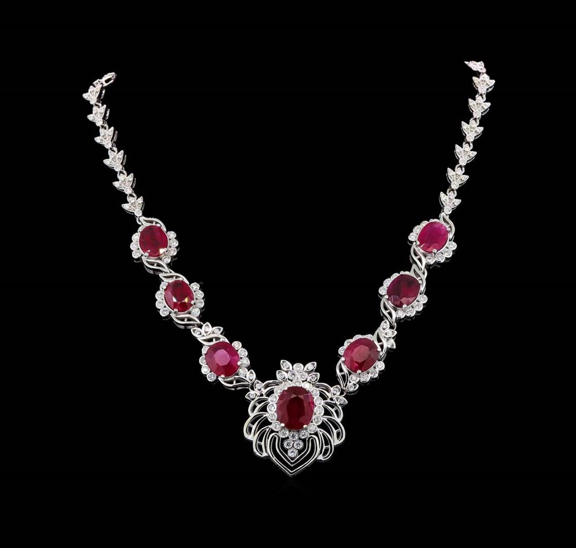One Suite containing : One pair electronically tested 18KT white gold lady's combination cast & assembled fancy fashion earrings with heavy friction backs with a bright polish finish. Identified with markings of '18K'. Condition is new, good workmanship. Containing: One prong set oval modified mixed cut natural ruby, measuring 13.68 x 11.82 x 5.03mm, (depth est.) 10%. bulge factor, approximate weight of 7.63ct., clarity is moderately included, medium dark, moderately strong, red color, (GIA R 6/4), cut is good. Transmitting light somewhat diffusely, transparent to translucent. Indications of laboratory high temperature heat treatment. Colored gemstones are presumed to have been subjected to commonly used enhancement processes. Graded loose prior to setting in the GIA Laboratory, Report #2171603586. One prong set oval modified mixed cut natural ruby, measuring 13.37 x 11.98 x 4.09mm, (depth est.) 20%. bulge factor, approximate weight of 7.01ct., clarity is moderately included, medium dark, moderately strong, red color, (GIA R 6/4), cut is good. Transmitting light somewhat diffusely, transparent to translucent. Indications of laboratory high temperature heat treatment. Colored gemstones are presumed to have been subjected to commonly used enhancement processes. Graded loose prior to setting in the GIA Laboratory, Report #2171603546. Forty-Four bezel set round brilliant cut diamonds, measuring 2.50 - 2.45 x 1.49mm (depth est.) approximate total weight of 44 Stones = 2.45ct. Graded in the setting. Clarity VS-2 to SI-2. Color: H - I Cut Good Sixteen channel set round brilliant cut diamonds, measuring 1.95 - 1.85 x 1.18mm (depth est.) approximate total weight of 16 Stones = 0.42ct. Graded in the setting. Clarity VS-2 to SI-2. Color: H - I Cut Good Sixteen prong set round brilliant cut diamonds, measuring 1.60 - 1.50 x 0.93mm (depth est.) approximate total weight of 16 Stones = 0.21ct. Graded in the setting. Clarity VS-2 to SI-2. Color: H - I Cut Good. Total Weight of Colored Stones 14.64ct.. Total Weight of Diamonds 3.08ct.. Total Weight of Earrings 44.80gm. One electronically tested 18KT white gold lady's combination cast & assembled fancy fashion necklace with a tongue clasp with foldover safety with a bright polish finish. The featured lady's necklace measures approximately 17 inches in length. Identified with markings of "18K". Condition is new, good workmanship. Containing: One prong set oval modified mixed cut natural ruby, measuring 14.14 x 12.11 x 4.82mm, (depth est.) 5%. bulge factor, approximate weight of 7.43ct., clarity is heavily included, medium dark, moderately strong, red color, (GIA R 6/4), cut is good. Transmitting light somewhat diffusely, semi-transparent to translucent. Indications of laboratory high temperature heat treatment. Colored gemstones are presumed to have been subjected to commonly used enhancement processes. Graded loose prior to setting in the GIA Laboratory, Report #6173603580.One prong set oval modified mixed cut natural ruby, measuring 11.97 x 10.47 x 5.31mm, (depth est.) 5%. bulge factor, approximate weight of 6.01ct., clarity is heavily included, medium dark, moderately strong, red color, (GIA R 6/4), cut is good. Transmitting light somewhat diffusely, semi-transparent to translucent. Indications of laboratory high temperature heat treatment. Colored gemstones are presumed to have been subjected to commonly used enhancement processes. Graded loose prior to setting in the GIA Laboratory, Report #1172603387.One prong set oval modified mixed cut natural ruby, measuring 12.05 x 10.45 x 5.17mm, (depth est.) 5%. bulge factor, approximate weight of 5.91ct., clarity is heavily included, medium dark, moderately strong, red color, (GIA R 6/4), cut is good. Transmitting light somewhat diffusely, semi-transparent to translucent. Indications of laboratory high temperature heat treatment. Colored gemstones are presumed to have been subjected to commonly used enhancement processes. Graded loose prior to setting in the GIA Laboratory, Report #6173603577.One prong set oval modified mixed cut natural ruby, measuring 11.98 x 9.82 x 3.93mm, (depth est.) 20%. bulge factor, approximate weight of 4.81ct., clarity is heavily included, medium dark, moderately strong, red color, (GIA R 6/4), cut is good. Transmitting light somewhat diffusely, semi-transparent to translucent. Indications of laboratory high temperature heat treatment. Colored gemstones are presumed to have been subjected to commonly used enhancement processes. Graded loose prior to setting in the GIA Laboratory, Report #1172603576.One prong set oval modified mixed cut natural ruby, measuring 11.61 x 8.84 x 4.18mm, (depth est.) 10%. bulge factor, approximate weight of 3.97ct., clarity is heavily included, medium dark, moderately strong, red color, (GIA R 6/4), cut is good. Transmitting light somewhat diffusely, semi-transparent to translucent. Indications of laboratory high temperature heat treatment. Colored gemstones are presumed to have been subjected to commonly used enhancement processes. Graded loose prior to setting in the GIA Laboratory, Report #2173603552.One prong set oval modified mixed cut natural ruby, measuring 12.12 x 8.98 x 3.58mm, (depth est.) 10%. bulge factor, approximate weight of 3.59ct., clarity is heavily included, medium dark, moderately strong, strongly purplish red color, (GIA stpR 6/4), cut is good. Transmitting light somewhat diffusely, semi-transparent to translucent. Indications of laboratory high temperature heat treatment. Colored gemstones are presumed to have been subjected to commonly used enhancement processes. Graded loose prior to setting in the GIA Laboratory, Report #1172603137.One prong set oval modified mixed cut natural ruby, measuring 12.16 x 8.88 x 2.88mm, (depth est.) 20%. bulge factor, approximate weight of 3.34ct., clarity is heavily included, medium dark, moderately strong, strongly purplish red color, (GIA stpR 6/4), cut is good. Transmitting light somewhat diffusely,