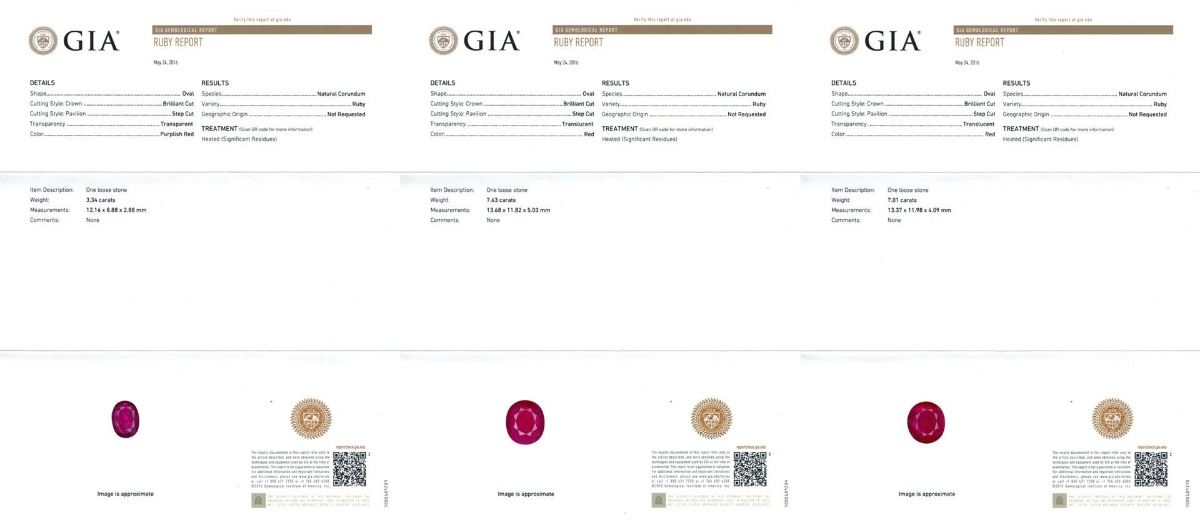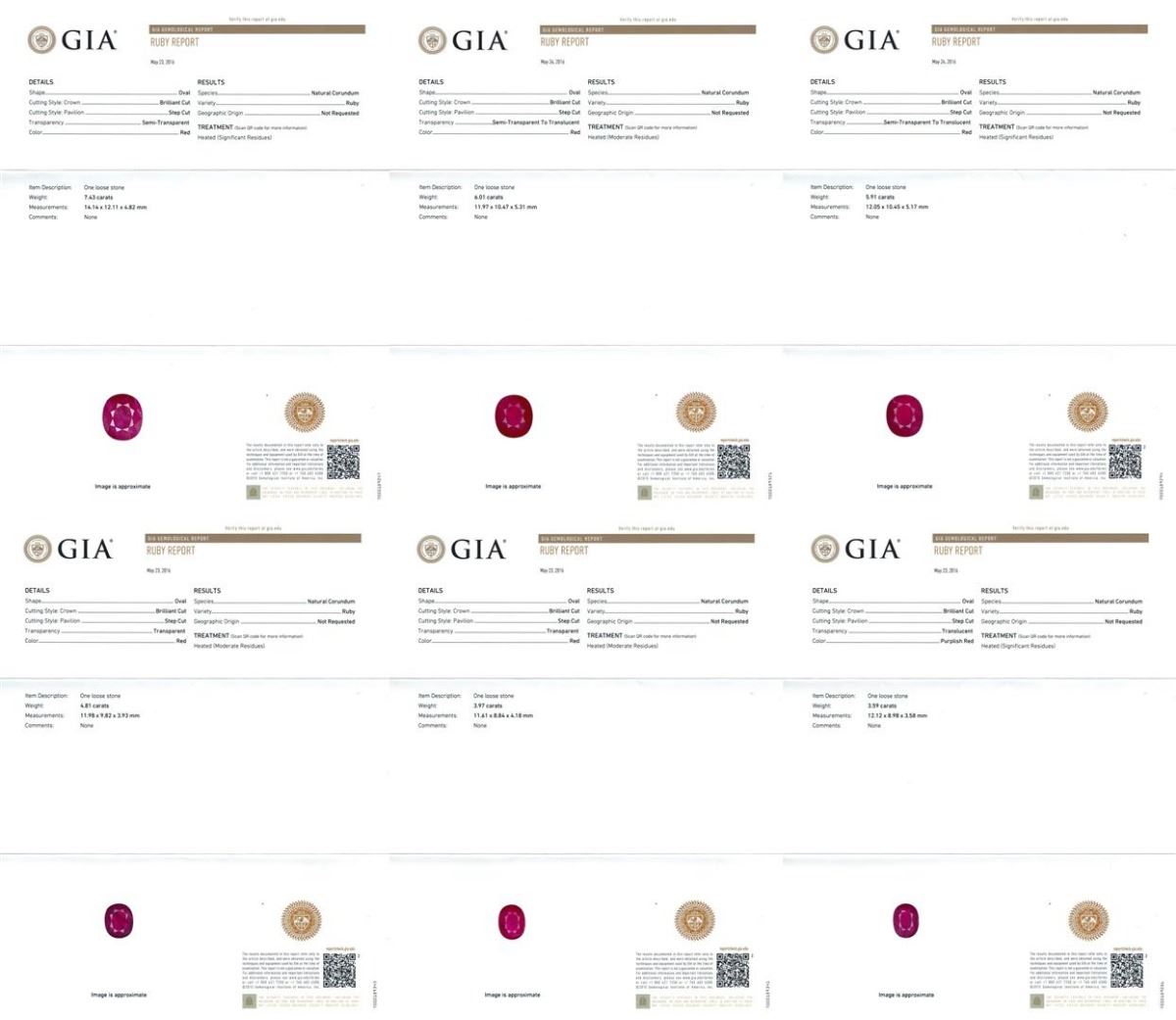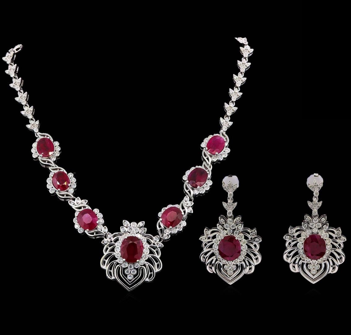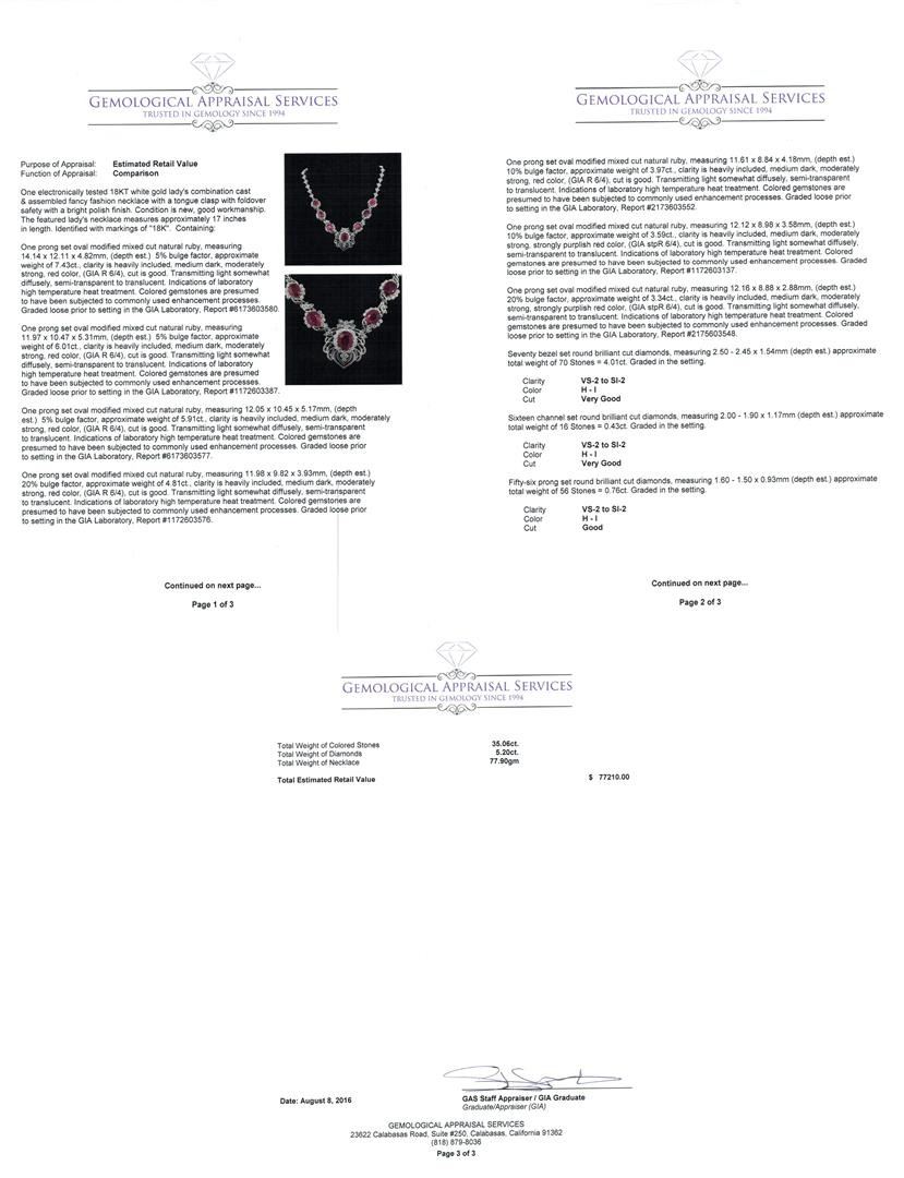 One Suite containing : One pair electronically tested 18KT white gold lady's combination cast & assembled fancy fashion earrings with heavy friction backs with a bright polish finish. Identified with markings of '18K'. Condition is new, good workmanship. Containing: One prong set oval modified mixed cut natural ruby, measuring 13.68 x 11.82 x 5.03mm, (depth est.) 10%. bulge factor, approximate weight of 7.63ct., clarity is moderately included, medium dark, moderately strong, red color, (GIA R 6/4), cut is good. Transmitting light somewhat diffusely, transparent to translucent. Indications of laboratory high temperature heat treatment. Colored gemstones are presumed to have been subjected to commonly used enhancement processes. Graded loose prior to setting in the GIA Laboratory, Report #2171603586. One prong set oval modified mixed cut natural ruby, measuring 13.37 x 11.98 x 4.09mm, (depth est.) 20%. bulge factor, approximate weight of 7.01ct., clarity is moderately included, medium dark, moderately strong, red color, (GIA R 6/4), cut is good. Transmitting light somewhat diffusely, transparent to translucent. Indications of laboratory high temperature heat treatment. Colored gemstones are presumed to have been subjected to commonly used enhancement processes. Graded loose prior to setting in the GIA Laboratory, Report #2171603546. Forty-Four bezel set round brilliant cut diamonds, measuring 2.50 - 2.45 x 1.49mm (depth est.) approximate total weight of 44 Stones = 2.45ct. Graded in the setting. Clarity VS-2 to SI-2. Color: H - I Cut Good Sixteen channel set round brilliant cut diamonds, measuring 1.95 - 1.85 x 1.18mm (depth est.) approximate total weight of 16 Stones = 0.42ct. Graded in the setting. Clarity VS-2 to SI-2. Color: H - I Cut Good Sixteen prong set round brilliant cut diamonds, measuring 1.60 - 1.50 x 0.93mm (depth est.) approximate total weight of 16 Stones = 0.21ct. Graded in the setting. Clarity VS-2 to SI-2. Color: H - I Cut Good. Total Weight of Colored Stones 14.64ct.. Total Weight of Diamonds 3.08ct.. Total Weight of Earrings 44.80gm. One electronically tested 18KT white gold lady's combination cast & assembled fancy fashion necklace with a tongue clasp with foldover safety with a bright polish finish. The featured lady's necklace measures approximately 17 inches in length. Identified with markings of "18K". Condition is new, good workmanship. Containing: One prong set oval modified mixed cut natural ruby, measuring 14.14 x 12.11 x 4.82mm, (depth est.) 5%. bulge factor, approximate weight of 7.43ct., clarity is heavily included, medium dark, moderately strong, red color, (GIA R 6/4), cut is good. Transmitting light somewhat diffusely, semi-transparent to translucent. Indications of laboratory high temperature heat treatment. Colored gemstones are presumed to have been subjected to commonly used enhancement processes. Graded loose prior to setting in the GIA Laboratory, Report #6173603580.One prong set oval modified mixed cut natural ruby, measuring 11.97 x 10.47 x 5.31mm, (depth est.) 5%. bulge factor, approximate weight of 6.01ct., clarity is heavily included, medium dark, moderately strong, red color, (GIA R 6/4), cut is good. Transmitting light somewhat diffusely, semi-transparent to translucent. Indications of laboratory high temperature heat treatment. Colored gemstones are presumed to have been subjected to commonly used enhancement processes. Graded loose prior to setting in the GIA Laboratory, Report #1172603387.One prong set oval modified mixed cut natural ruby, measuring 12.05 x 10.45 x 5.17mm, (depth est.) 5%. bulge factor, approximate weight of 5.91ct., clarity is heavily included, medium dark, moderately strong, red color, (GIA R 6/4), cut is good. Transmitting light somewhat diffusely, semi-transparent to translucent. Indications of laboratory high temperature heat treatment. Colored gemstones are presumed to have been subjected to commonly used enhancement processes. Graded loose prior to setting in the GIA Laboratory, Report #6173603577.One prong set oval modified mixed cut natural ruby, measuring 11.98 x 9.82 x 3.93mm, (depth est.) 20%. bulge factor, approximate weight of 4.81ct., clarity is heavily included, medium dark, moderately strong, red color, (GIA R 6/4), cut is good. Transmitting light somewhat diffusely, semi-transparent to translucent. Indications of laboratory high temperature heat treatment. Colored gemstones are presumed to have been subjected to commonly used enhancement processes. Graded loose prior to setting in the GIA Laboratory, Report #1172603576.One prong set oval modified mixed cut natural ruby, measuring 11.61 x 8.84 x 4.18mm, (depth est.) 10%. bulge factor, approximate weight of 3.97ct., clarity is heavily included, medium dark, moderately strong, red color, (GIA R 6/4), cut is good. Transmitting light somewhat diffusely, semi-transparent to translucent. Indications of laboratory high temperature heat treatment. Colored gemstones are presumed to have been subjected to commonly used enhancement processes. Graded loose prior to setting in the GIA Laboratory, Report #2173603552.One prong set oval modified mixed cut natural ruby, measuring 12.12 x 8.98 x 3.58mm, (depth est.) 10%. bulge factor, approximate weight of 3.59ct., clarity is heavily included, medium dark, moderately strong, strongly purplish red color, (GIA stpR 6/4), cut is good. Transmitting light somewhat diffusely, semi-transparent to translucent. Indications of laboratory high temperature heat treatment. Colored gemstones are presumed to have been subjected to commonly used enhancement processes. Graded loose prior to setting in the GIA Laboratory, Report #1172603137.One prong set oval modified mixed cut natural ruby, measuring 12.16 x 8.88 x 2.88mm, (depth est.) 20%. bulge factor, approximate weight of 3.34ct., clarity is heavily included, medium dark, moderately strong, strongly purplish red color, (GIA stpR 6/4), cut is good. Transmitting light somewhat diffusely,