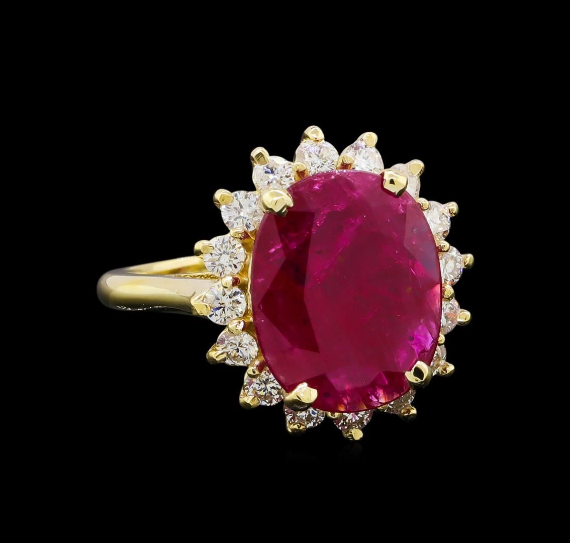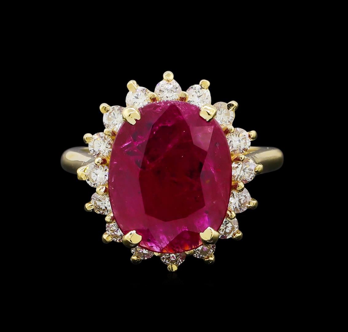 One electronically tested 14KT yellow gold lady's cast fashion ring with a basket halo with a bright polish finish. The featured lady's ring has a shank measuring 1.89 millimeters wide. Identified with markings of '14K'. Condition is new, good workmanship. Containing: One prong set oval modified mixed cut natural ruby, measuring 14.06 x 11.35 x 2.91mm, (depth est.) 15%. bulge factor, approximate weight of 5.13ct., clarity is severely included, medium dark, very slightly brownish, strongly purplish red color, (GIA stpR 6/3), cut is good. Transmitting light somewhat diffusely, semi-transparent to translucent. Naturally occurring internal & external characteristics are present. Colored gemstones are presumed to have been subjected to commonly used enhancement processes. Graded loose prior to setting in the GIA Laboratory, Report #2173603579. Sixteen prong set round brilliant cut diamonds, measuring 2.50 - 2.45 x 1.54mm (depth est.) approximate total weight of 16 Stones = 0.91ct. Graded in the setting. Clarity SI-1 to SI-2. Color: H - I Cut Good. Total Weight of Colored Stones 5.13ct.. Total Weight of Diamonds 0.91ct.. Total Weight of Ring 6.60gm. GAS Appraised at $11,860.00.