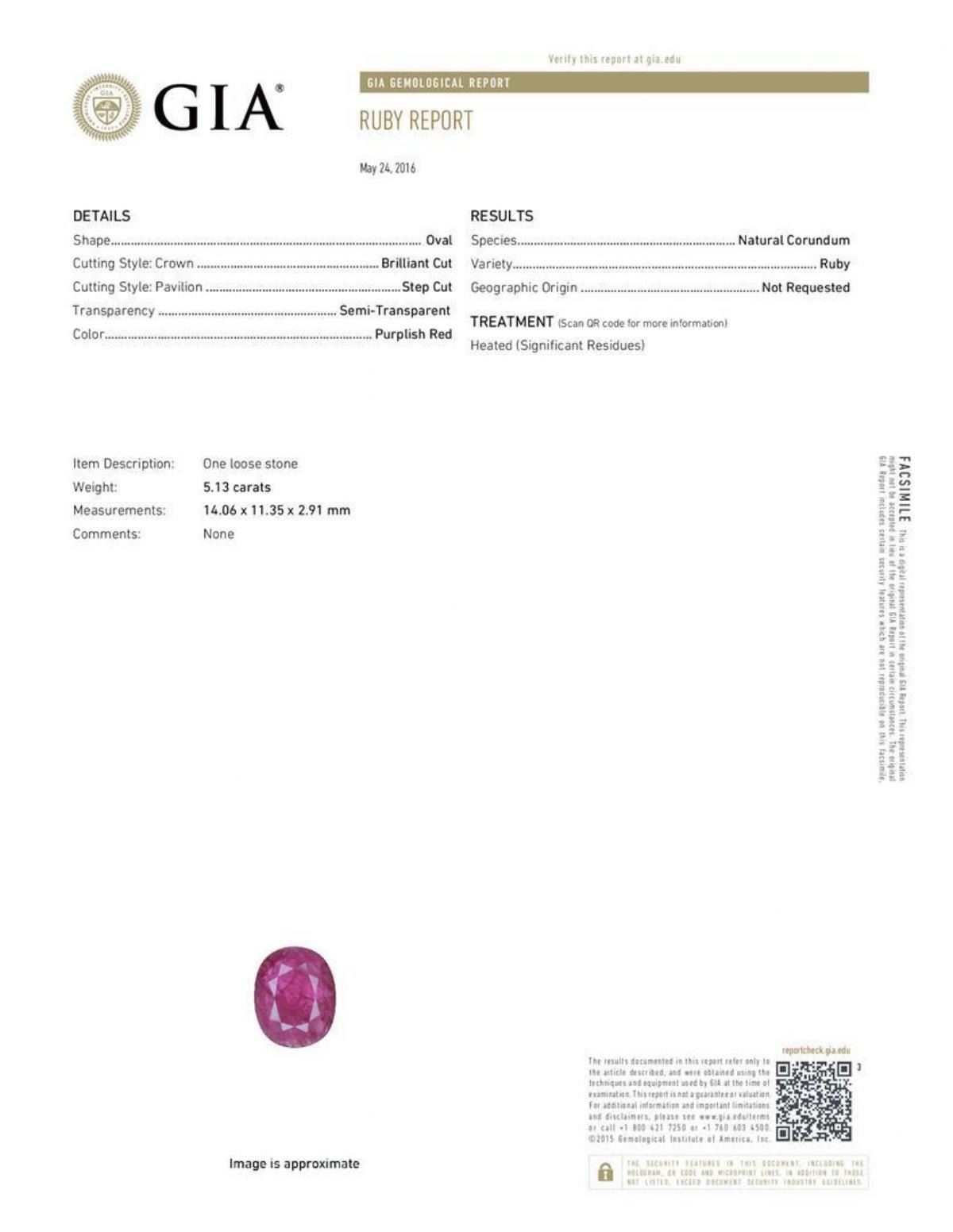 One electronically tested 14KT yellow gold lady's cast fashion ring with a basket halo with a bright polish finish. The featured lady's ring has a shank measuring 1.89 millimeters wide. Identified with markings of '14K'. Condition is new, good workmanship. Containing: One prong set oval modified mixed cut natural ruby, measuring 14.06 x 11.35 x 2.91mm, (depth est.) 15%. bulge factor, approximate weight of 5.13ct., clarity is severely included, medium dark, very slightly brownish, strongly purplish red color, (GIA stpR 6/3), cut is good. Transmitting light somewhat diffusely, semi-transparent to translucent. Naturally occurring internal & external characteristics are present. Colored gemstones are presumed to have been subjected to commonly used enhancement processes. Graded loose prior to setting in the GIA Laboratory, Report #2173603579. Sixteen prong set round brilliant cut diamonds, measuring 2.50 - 2.45 x 1.54mm (depth est.) approximate total weight of 16 Stones = 0.91ct. Graded in the setting. Clarity SI-1 to SI-2. Color: H - I Cut Good. Total Weight of Colored Stones 5.13ct.. Total Weight of Diamonds 0.91ct.. Total Weight of Ring 6.60gm. GAS Appraised.