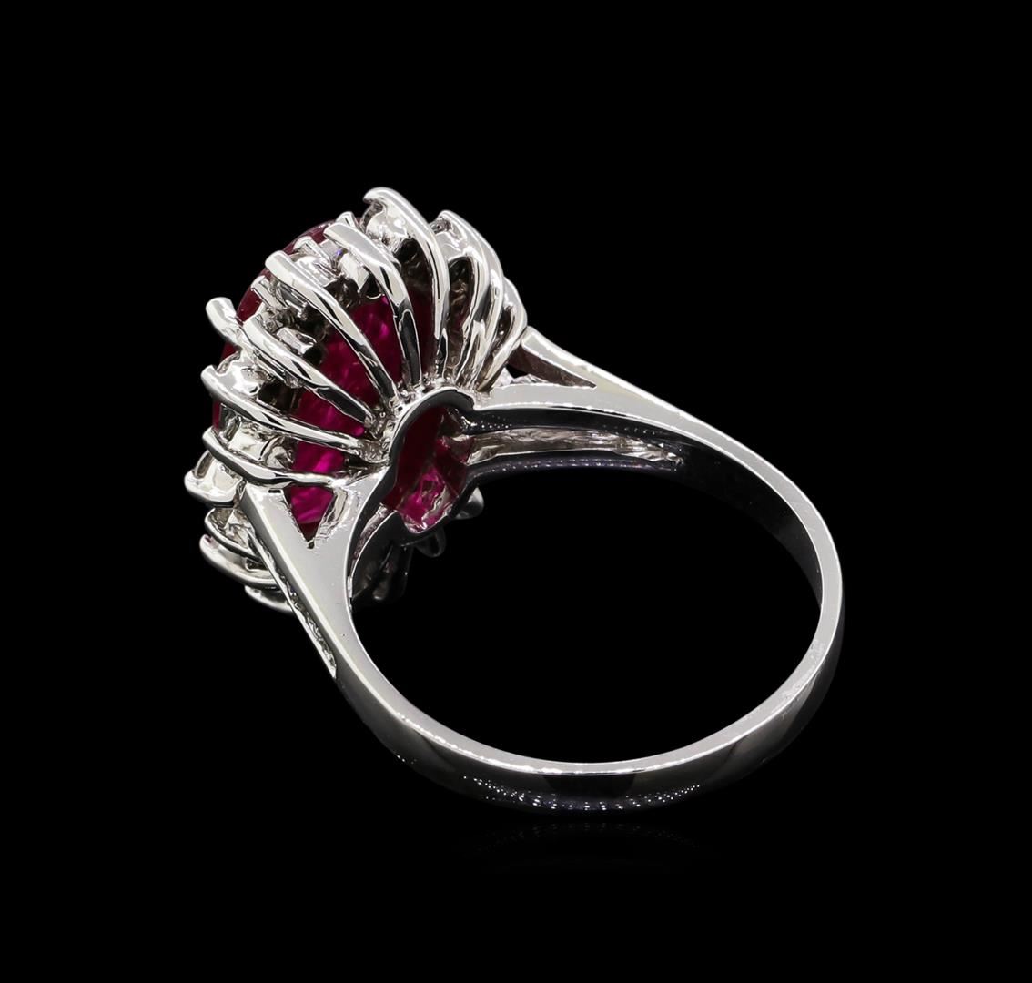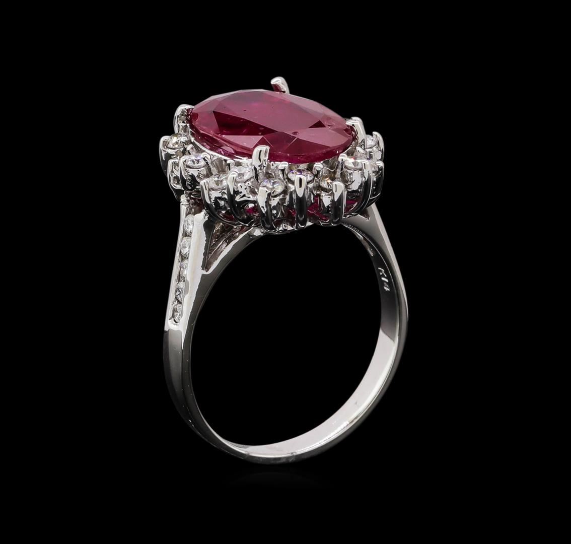 One electronically tested 14KT white gold lady's cast fashion ring with a basket halo with a bright polish finish. The featured lady's ring has a shank measuring 2.46 millimeters in width. Identified with markings of 'K14'. Condition is new, good workmanship. Containing: One prong set oval modified step cut natural ruby, measuring 14.91 x 9.09 x 3.61mm, (depth est.) 15%. bulge factor, approximate weight of 5.16ct., clarity is heavily included, medium, moderately strong, slightly purplish red color, (GIA slpR 5/4), cut is very good. Transmitting light somewhat diffusely, transparent to translucent. Indications of laboratory high temperature heat treatment. Naturally occurring internal & external characteristics are present. Colored gemstones are presumed to have been subjected to commonly used enhancement processes. Graded loose prior to setting in the GIA Laboratory, Report #2175603578. Twenty prong set round brilliant cut diamonds, measuring 1.95 - 1.85 x 1.16mm (depth est.) approximate total weight of 20 Stones = 0.50ct. Graded in the setting. Clarity SI-1 to SI-2. Color: G - H Cut Good Ten channel set round brilliant cut diamonds, measuring 1.60 - 1.55 x 0.98mm (depth est.) approximate total weight of 10 Stones = 0.15ct. Graded in the setting. Clarity SI-1 to SI-2. Color: H - I Cut Good. Total Weight of Colored Stones 5.16ct.. Total Weight of Diamonds 0.65ct.. Total Weight of Ring 6.80gm. GAS Appraised at $15,490.00.