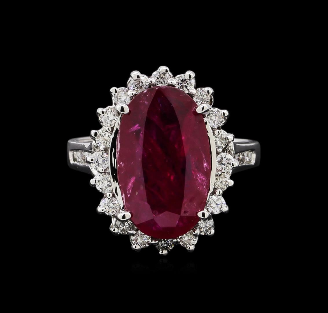 One electronically tested 14KT white gold lady's cast fashion ring with a basket halo with a bright polish finish. The featured lady's ring has a shank measuring 2.46 millimeters in width. Identified with markings of 'K14'. Condition is new, good workmanship. Containing: One prong set oval modified step cut natural ruby, measuring 14.91 x 9.09 x 3.61mm, (depth est.) 15%. bulge factor, approximate weight of 5.16ct., clarity is heavily included, medium, moderately strong, slightly purplish red color, (GIA slpR 5/4), cut is very good. Transmitting light somewhat diffusely, transparent to translucent. Indications of laboratory high temperature heat treatment. Naturally occurring internal & external characteristics are present. Colored gemstones are presumed to have been subjected to commonly used enhancement processes. Graded loose prior to setting in the GIA Laboratory, Report #2175603578. Twenty prong set round brilliant cut diamonds, measuring 1.95 - 1.85 x 1.16mm (depth est.) approximate total weight of 20 Stones = 0.50ct. Graded in the setting. Clarity SI-1 to SI-2. Color: G - H Cut Good Ten channel set round brilliant cut diamonds, measuring 1.60 - 1.55 x 0.98mm (depth est.) approximate total weight of 10 Stones = 0.15ct. Graded in the setting. Clarity SI-1 to SI-2. Color: H - I Cut Good. Total Weight of Colored Stones 5.16ct.. Total Weight of Diamonds 0.65ct.. Total Weight of Ring 6.80gm. GAS Appraised at $15,490.00.
