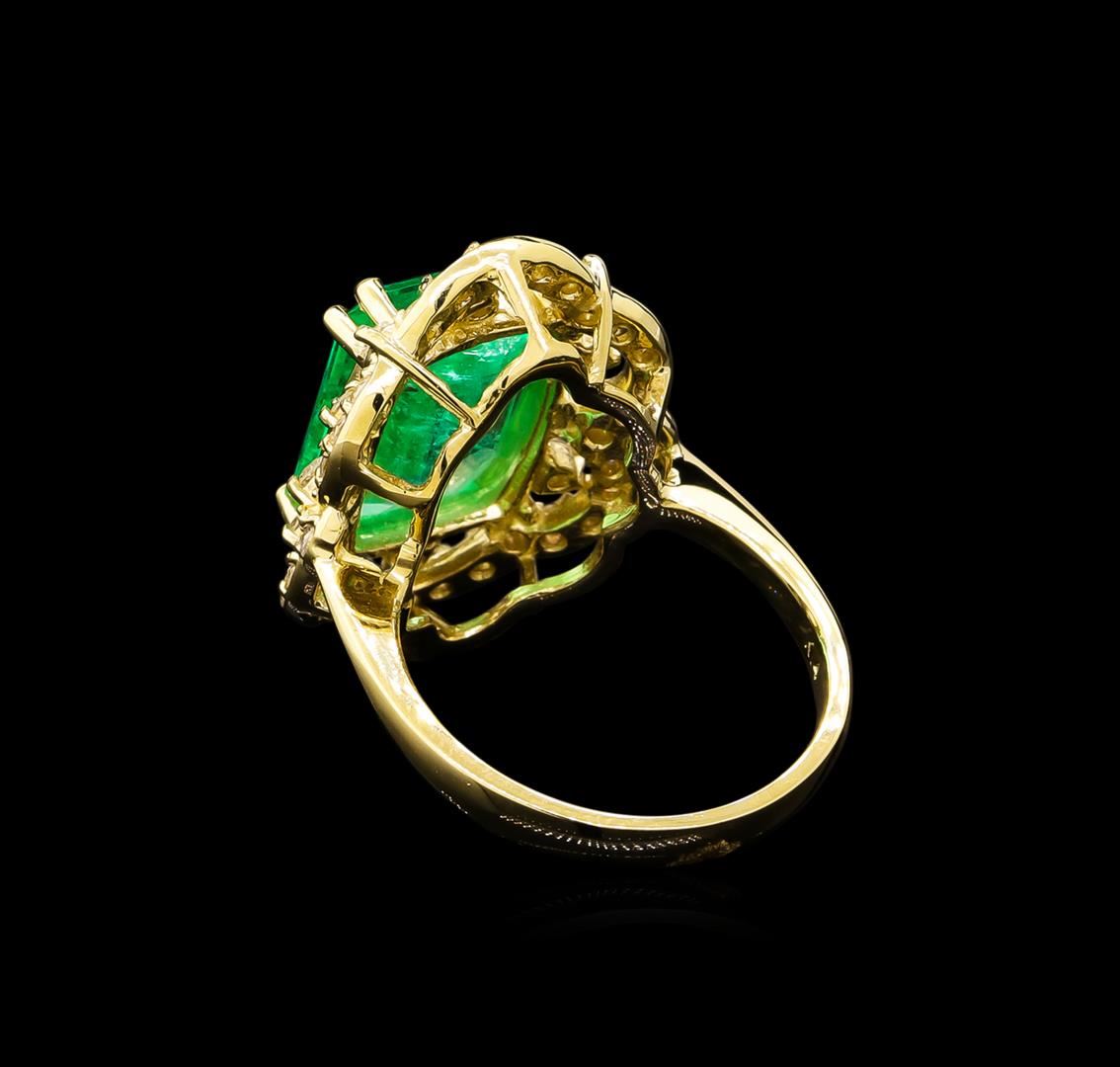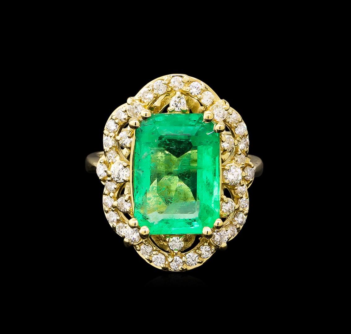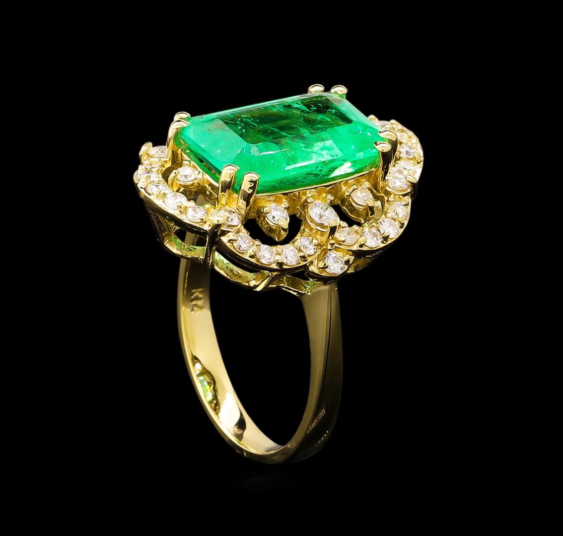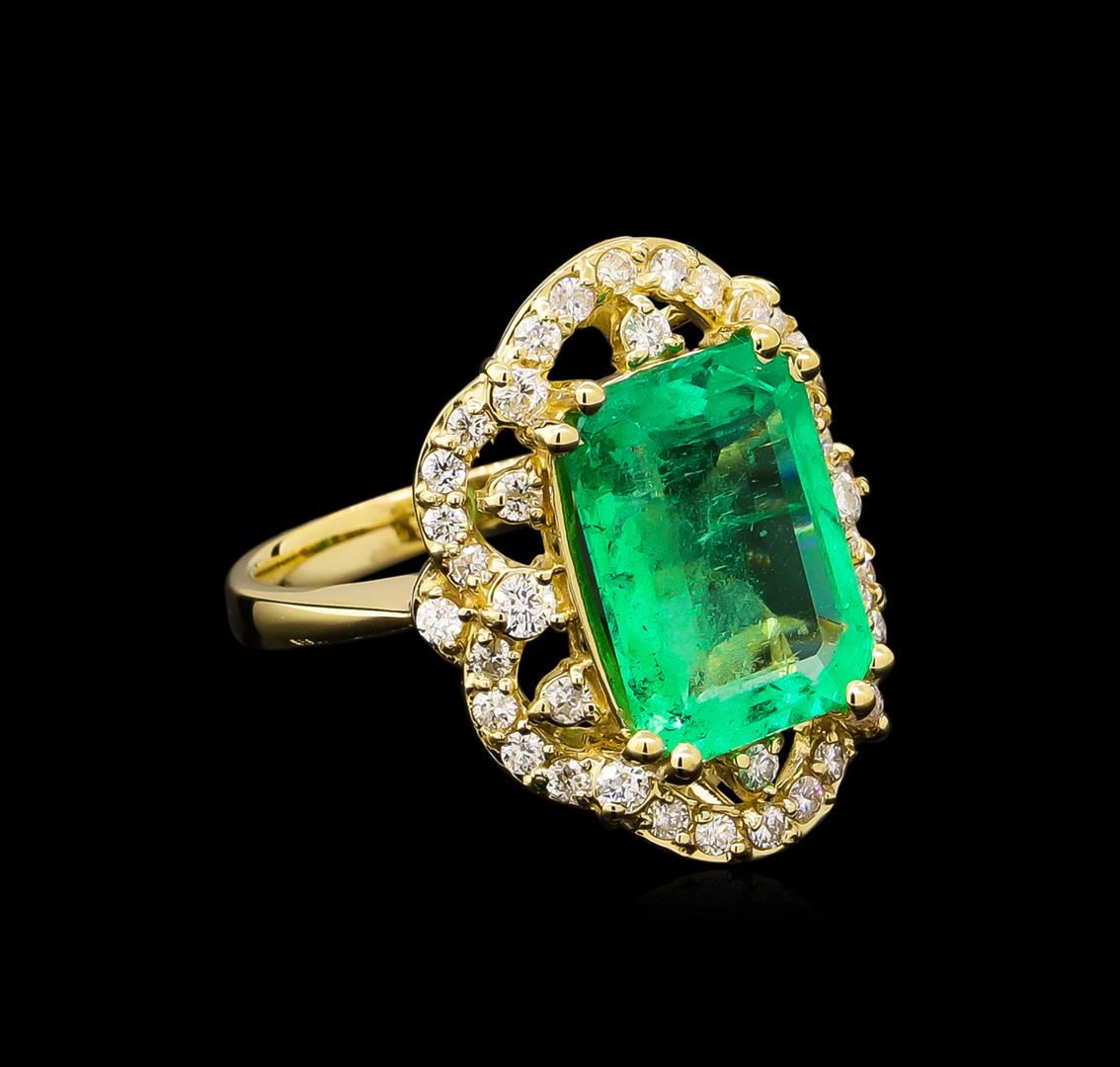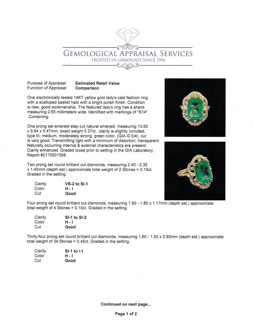 One electronically tested 14KT yellow gold lady's cast fashion ring with a scalloped basket halo with a bright polish finish. The featured lady's ring has a shank measuring 2.65 millimeters wide. Identified with markings of "K14". Condition is new, good workmanship. Containing: One prong set emerald step cut natural emerald, measuring 13.62 x 9.64 x 5.47mm, exact weight 5.37ct., clarity is slightly included, type III, medium, moderately strong, green color, (GIA G 5/4), cut is very good. Transmitting light with a minimum of distortion, transparent. Naturally occurring internal & external characteristics are present. Clarity enhanced. Graded loose prior to setting in the GIA Laboratory, Report #2175501598.Two prong set round brilliant cut diamonds, measuring 2.40 - 2.35 x 1.45mm (depth est.) approximate total weight of 2 Stones = 0.10ct. Graded in the setting. Clarity: VS-2 to SI-1. Color: H - I. Cut Good Four prong set round brilliant cut diamonds, measuring 1.90 - 1.85 x 1.17mm (depth est.) approximate total weight of 4 Stones = 0.10ct. Graded in the setting. Clarity: SI-1 to SI-2. Color: H - I. Cut Good Thirty-Four prong set round brilliant cut diamonds, measuring 1.60 - 1.50 x 0.93mm (depth est.) approximate total weight of 34 Stones = 0.45ct. Graded in the setting. Clarity: SI-1 to I-1. Color: H - I. Cut Good. Total Weight of Colored Stones 5.37ct. Total Weight of Diamonds 0.65ct. Total Weight of Ring 7.30gm. GAS Appraised at $21,315.00.