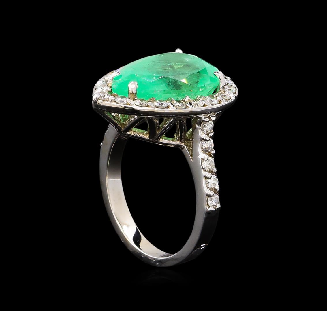 One electronically tested 14KT white gold lady's cast fashion ring with a basket halo with a bright polish finish. The featured lady's ring has a shank measuring 2.55 millimeters wide. Identified with markings of "14K". Condition is new, good workmanship. Containing: One prong set pear modified brilliant cut natural emerald, measuring 15.11 x 9.96 x 7.21mm, exact weight 5.49ct., clarity is moderately included, type III, medium, very slightly grayish, green color, (GIA G 5/3), cut is good. Transmitting light somewhat diffusely, transparent to translucent. Naturally occurring internal & external characteristics are present. Clarity enhanced. Graded loose prior to setting in the GIA Laboratory, Report #2175501837.Thirty prong set round brilliant cut diamonds, measuring 1.90 - 1.80 x 1.13mm (depth est.) approximate total weight of 30 Stones = 0.70ct. Graded in the setting. Clarity: SI-1 to I-1. Color: G - I. Cut Good. Total Weight of Colored Stones 5.49ct. Total Weight of Diamonds 0.70ct. Total Weight of Ring 6.70gm. GAS Appraised at $10,805.00.