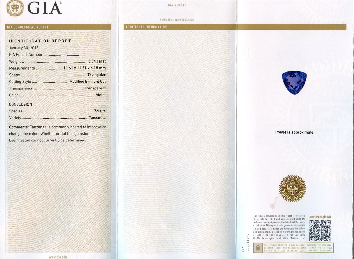 One electronically tested platinum ladies cast tanzanite and diamond ring with a bright polish finish. The featured tanzanite is set within a diamond bezel supported by a lattice under gallery and diamond set shoulders, completed by a two and one-half millimeter wide band. Trademark is Orianne. Identified with markings of "PT950". Condition is new, good workmanship. Containing: One prong set triangular modified brilliant cut natural tanzanite, measuring 11.61 x 11.51 x 6.18mm, exact weight 5.54ct., clarity is eye clean, type I, dark, moderately strong, violet color, (GIA V 7/4), cut is good. Transmitting light with no distortion, transparent. GIA Gemological Report attached. Graded loose prior to setting in the GIA Laboratory, Report #2161949843.Tanzanite is a very rare gemstone that is only found in the country of Tanzania. Originally discovered in 1967. Tiffany & Company, named the stone Tanzanite. It is found in the Usumburu Mountains that border the Umba Valley of northern Tanzania. Tanzanite occurs in gray, brown, violet, blue, reddish-purple, & green. The gem is interesting because of its exceptional pleochroism. Rotated in different directions a tanzanite will exhibit multiple changes of color. Tanzanite has a low tolerance to ultrasonic cleaning, and should not be cleaned using this method. Thirty-Seven prong set round brilliant cut diamonds approximate total weight of 37 Stones = 0.42ct. Graded in the setting. Clarity: SI-1 to I-1. Color: G - I. Total Weight of Colored Stones 5.54ct. Total Weight of Diamonds 0.42ct. Total Weight of Ring 8.12gm. AIG Appraised at $16,170.00.