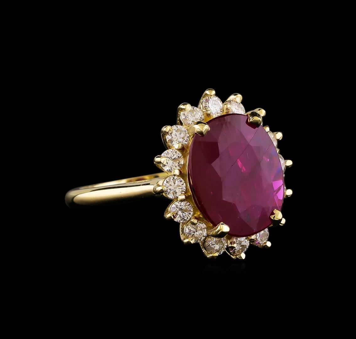 One electronically tested 14KT yellow gold lady's cast fashion ring with a basket halo with a bright polish finish. The featured lady's ring has a shank measuring 2.11 millimeters wide. Identified with markings of '14K'. Condition is new, good workmanship. Containing: One prong set oval modified mixed cut natural ruby, measuring 13.16 x 11.15 x 3.93mm, (depth est.) 15%. bulge factor, approximate weight of 5.56ct., clarity is severely included, medium dark, very slightly brownish, strongly purplish red color, (GIA stpR 6/3), cut is good. Transmitting light somewhat diffusely, transparent to translucent. Naturally occurring internal & external characteristics are present. Colored gemstones are presumed to have been subjected to commonly used enhancement processes. Graded loose prior to setting in the GIA Laboratory, Report #1172603401. Sixteen prong set round brilliant cut diamonds, measuring 2.50 - 2.40 x 1.52mm (depth est.) approximate total weight of 16 Stones = 0.90ct. Graded in the setting. Clarity VS-2 to SI-2. Color: H - I Cut Good. Total Weight of Colored Stones 5.56ct.. Total Weight of Diamonds 0.90ct.. Total Weight of Ring 6.70gm. GAS Appraised at $12,765.00.