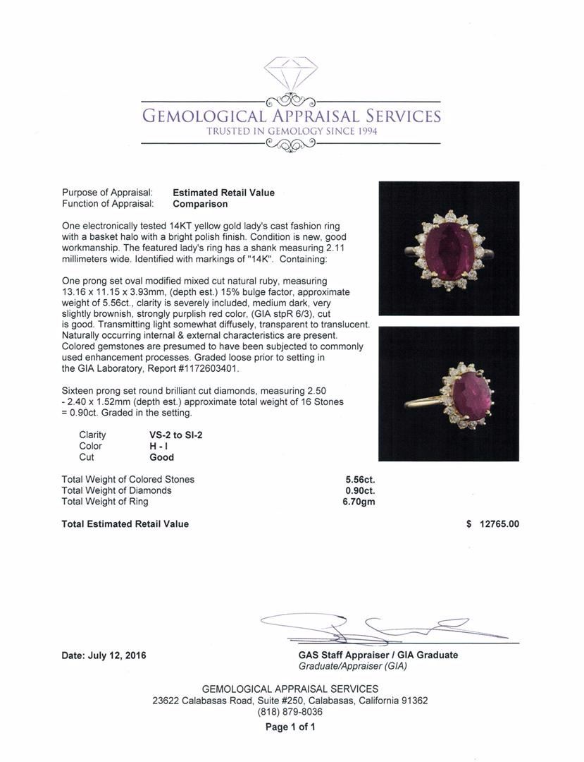 One electronically tested 14KT yellow gold lady's cast fashion ring with a basket halo with a bright polish finish. The featured lady's ring has a shank measuring 2.11 millimeters wide. Identified with markings of '14K'. Condition is new, good workmanship. Containing: One prong set oval modified mixed cut natural ruby, measuring 13.16 x 11.15 x 3.93mm, (depth est.) 15%. bulge factor, approximate weight of 5.56ct., clarity is severely included, medium dark, very slightly brownish, strongly purplish red color, (GIA stpR 6/3), cut is good. Transmitting light somewhat diffusely, transparent to translucent. Naturally occurring internal & external characteristics are present. Colored gemstones are presumed to have been subjected to commonly used enhancement processes. Graded loose prior to setting in the GIA Laboratory, Report #1172603401. Sixteen prong set round brilliant cut diamonds, measuring 2.50 - 2.40 x 1.52mm (depth est.) approximate total weight of 16 Stones = 0.90ct. Graded in the setting. Clarity VS-2 to SI-2. Color: H - I Cut Good. Total Weight of Colored Stones 5.56ct.. Total Weight of Diamonds 0.90ct.. Total Weight of Ring 6.70gm. GAS Appraised at $12,765.00.
