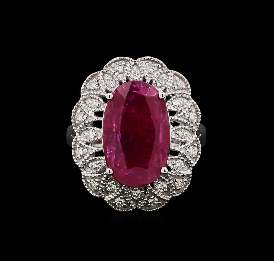 One electronically tested 14KT white gold lady's cast fashion ring with a basket halo with a bright polish finish. The featured lady's ring has a shank measuring 2.89 millimeters in width. Identified with markings of 'K14'. Condition is new, good workmanship. Containing: One prong set oval modified step cut natural ruby, measuring 15.32 x 9.74 x 3.61mm, (depth est.) 20%. bulge factor, approximate weight of 5.81ct., clarity is heavily included, medium, moderately strong, strongly purplish red color, (GIA stpR 5/4), cut is very good. Transmitting light somewhat diffusely, transparent to translucent. Indications of laboratory high temperature heat treatment. Naturally occurring internal & external characteristics are present. Colored gemstones are presumed to have been subjected to commonly used enhancement processes. Graded loose prior to setting in the GIA Laboratory, Report #1172603384. Twenty-Four prong set round brilliant cut diamonds, measuring 1.65 - 1.55 x 0.99mm (depth est.) approximate total weight of 24 Stones = 0.38ct. Graded in the setting. Clarity VS-2 to SI-2. Color: G - H Cut Good. Total Weight of Colored Stones 5.81ct.. Total Weight of Diamonds 0.38ct.. Total Weight of Ring 9.40gm. GAS Appraised at $16,195.00.