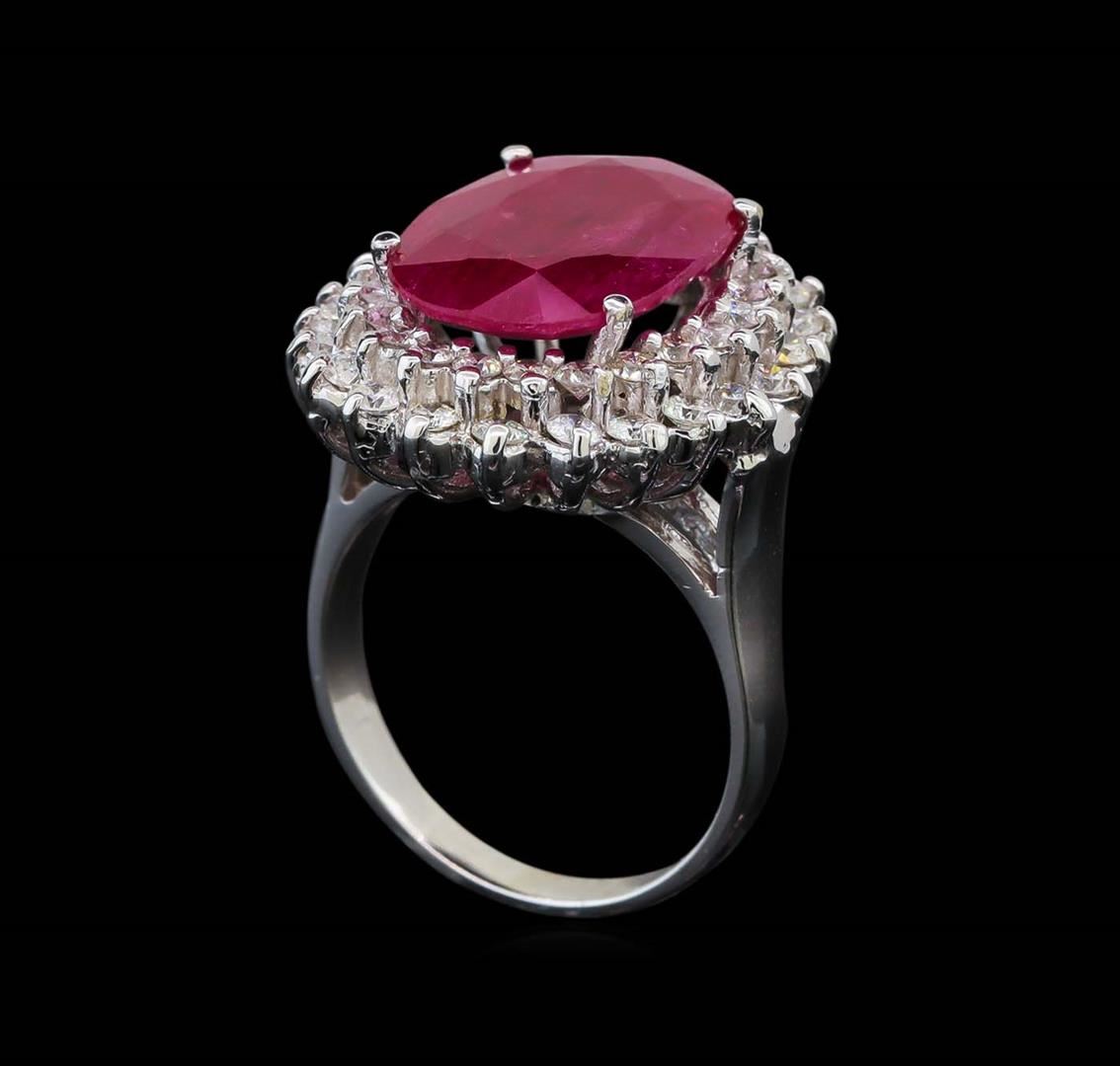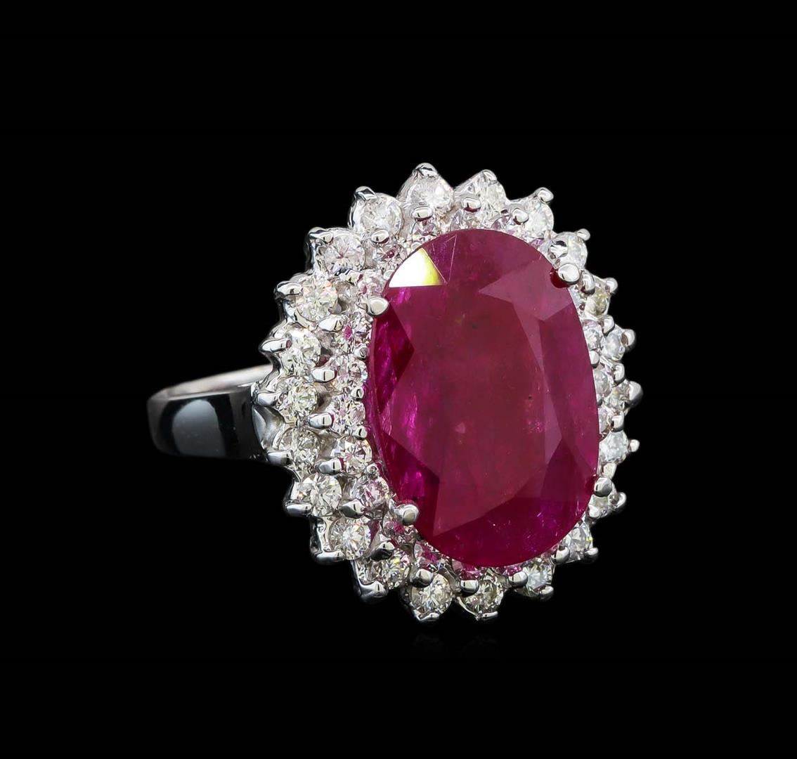 One electronically tested 14KT white gold lady's cast fashion ring with a double basket halo with a bright polish finish. The featured lady's ring has a shank measuring 2.41 millimeters wide. Identified with markings of '14K'. Condition is new, good workmanship. Containing: One prong set oval modified mixed cut natural ruby, measuring 15.86 x 11.04 x 2.83mm, (depth est.) 20%. bulge factor, approximate weight of 5.86ct., clarity is heavily included, medium dark, moderately strong, strongly purplish red color, (GIA stpR 6/4), cut is good. Transmitting light somewhat diffusely, semi-transparent to translucent. Indications of laboratory high temperature heat treatment. Colored gemstones are presumed to have been subjected to commonly used enhancement processes. Graded loose prior to setting in the GIA Laboratory, Report #2173603527. Twenty-Two prong set round brilliant cut diamonds, measuring 2.10 - 2.05 x 1.29mm (depth est.) approximate total weight of 22 Stones = 0.75ct. Graded in the setting. Clarity SI-1 to SI-2. Color: H - I Cut Good Twenty-Two prong set round brilliant cut diamonds, measuring 1.90 - 1.80 x 1.15mm (depth est.) approximate total weight of 22 Stones = 0.55ct. Graded in the setting. Clarity SI-1 to SI-2. Color: H - I Cut Good. Total Weight of Colored Stones 5.86ct.. Total Weight of Diamonds 1.30ct.. Total Weight of Ring 8.20gm. GAS Appraised at $15,485.00.