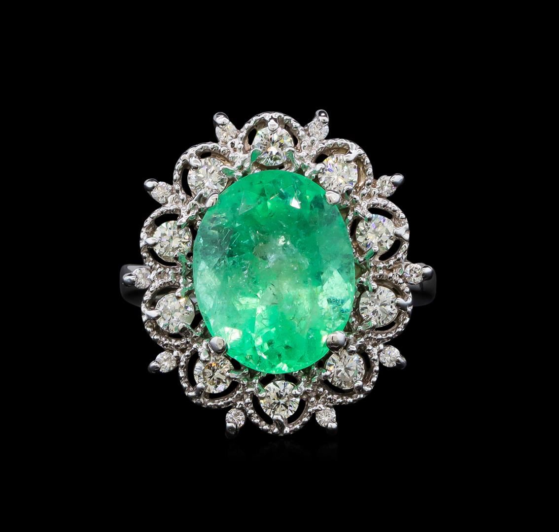 One electronically tested 14KT white gold lady's cast fashion ring with a scalloped basket halo with a bright polish with milgrain detailing finish. The featured lady's ring has a shank measuring 2.90 millimeters wide. Identified with markings of 'K14'. Condition is new, good workmanship. Containing: One prong set oval modified brilliant cut natural emerald, measuring 13.04 x 10.43 x 7.92mm, (depth est.) approximate weight of 5.88ct., clarity is heavily included, medium, moderately strong, green color, (GIA G 5/4), cut is very good. Transmitting light somewhat diffusely, transparent to translucent. Naturally occurring internal & external characteristics are present. Indications of oil residue. Colored gemstones are presumed to have been subjected to commonly used enhancement processes. Graded loose prior to setting in the GIA Laboratory, Report #2171665084. Ten prong set round brilliant cut diamonds, measuring 2.60 - 2.50 x 1.58mm (depth est.) approximate total weight of 10 Stones = 0.65ct. Graded in the setting. Clarity SI-1 to I-1. Color: H - I Cut Good Ten prong set round brilliant cut diamonds, measuring 1.30 - 1.25 x 0.79mm (depth est.) approximate total weight of 10 Stones = 0.08ct. Graded in the setting. Clarity SI-1 to SI-2. Color: H - I Cut Good. Total Weight of Colored Stones 5.88ct.. Total Weight of Diamonds 0.73ct.. Total Weight of Ring 7.90gm. GAS Appraised at $11,275.00.