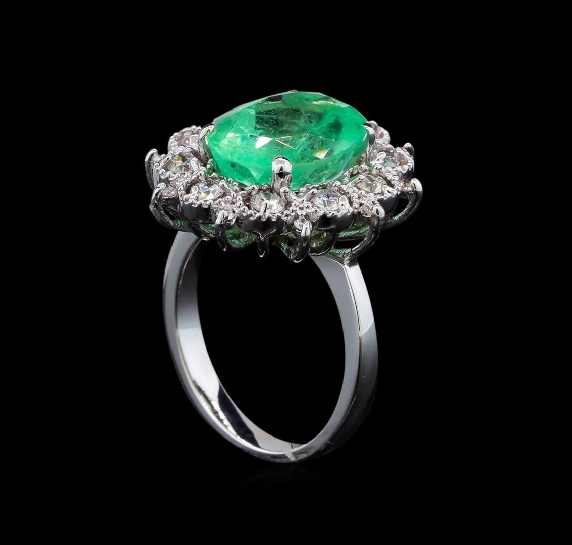 One electronically tested 14KT white gold lady's cast fashion ring with a scalloped basket halo with a bright polish with milgrain detailing finish. The featured lady's ring has a shank measuring 2.90 millimeters wide. Identified with markings of 'K14'. Condition is new, good workmanship. Containing: One prong set oval modified brilliant cut natural emerald, measuring 13.04 x 10.43 x 7.92mm, (depth est.) approximate weight of 5.88ct., clarity is heavily included, medium, moderately strong, green color, (GIA G 5/4), cut is very good. Transmitting light somewhat diffusely, transparent to translucent. Naturally occurring internal & external characteristics are present. Indications of oil residue. Colored gemstones are presumed to have been subjected to commonly used enhancement processes. Graded loose prior to setting in the GIA Laboratory, Report #2171665084. Ten prong set round brilliant cut diamonds, measuring 2.60 - 2.50 x 1.58mm (depth est.) approximate total weight of 10 Stones = 0.65ct. Graded in the setting. Clarity SI-1 to I-1. Color: H - I Cut Good Ten prong set round brilliant cut diamonds, measuring 1.30 - 1.25 x 0.79mm (depth est.) approximate total weight of 10 Stones = 0.08ct. Graded in the setting. Clarity SI-1 to SI-2. Color: H - I Cut Good. Total Weight of Colored Stones 5.88ct.. Total Weight of Diamonds 0.73ct.. Total Weight of Ring 7.90gm. GAS Appraised at $11,275.00.