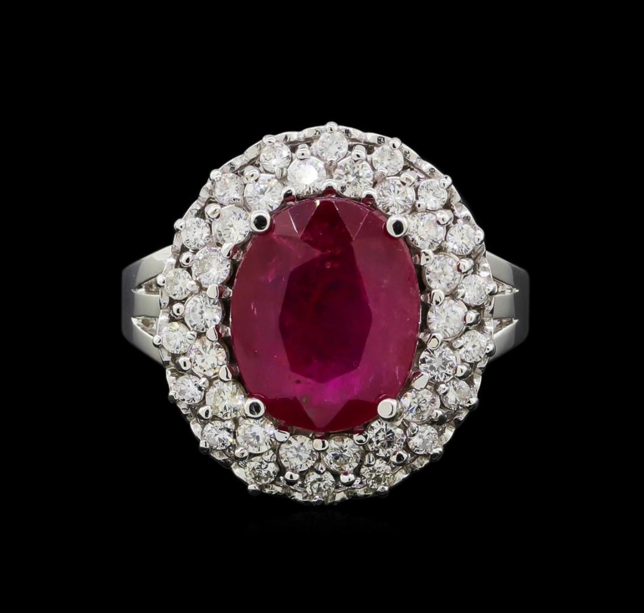 One electronically tested 14KT white gold lady's cast fashion ring with a double basket halo with a bright polish finish. The featured lady's ring has a shank measuring 2.79 millimeters wide. Identified with markings of '14K'. Condition is new, good workmanship. Containing: One prong set oval modified mixed cut natural ruby, measuring 12.49 x 10.04 x 4.94mm, (depth est.) 14%. bulge factor, approximate weight of 5.91ct., clarity is severely included, medium dark, very slightly brownish, red color, (GIA R 6/3), cut is very good. Transmitting light somewhat diffusely, semi-transparent to translucent. Naturally occurring internal & external characteristics are present. Colored gemstones are presumed to have been subjected to commonly used enhancement processes. Graded loose prior to setting in the GIA Laboratory, Report #1172603098. Eighteen prong set round brilliant cut diamonds, measuring 2.10 - 2.00 x 1.27mm (depth est.) approximate total weight of 18 Stones = 0.60ct. Graded in the setting. Clarity SI-1 to SI-2. Color: H - I Cut Good Eighteen prong set round brilliant cut diamonds, measuring 1.75 - 1.65 x 1.04mm (depth est.) approximate total weight of 18 Stones = 0.33ct. Graded in the setting. Clarity SI-1 to SI-2. Color: H - I Cut Good. Total Weight of Colored Stones 5.91ct.. Total Weight of Diamonds 0.93ct.. Total Weight of Ring 10.40gm. GAS Appraised.
