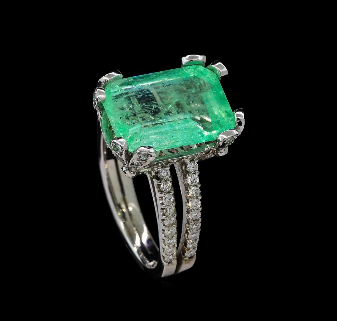 One electronically tested 14KT white gold ladies cast emerald and diamond ring with a bright polish finish. The featured emerald is set within a diamond accented basket supported by diamond set split shoulders, completed by a two and one-half millimeter wide band. Identified with markings of '14K'. Condition is new, good workmanship. Containing: One prong set octagonal step cut natural emerald, measuring 13.50 x 9.84 x 6.12mm, exact weight 5.99ct., clarity is moderately included, type III, medium light, very slightly grayish, green color, (GIA G 4/3), cut is good. Transmitting light with a minimum of distortion, transparent. Naturally occurring internal & external characteristics are present. Minor resin is present in surface cavities. GIA Gemological Report attached. Graded loose prior to setting in the GIA Laboratory, Report #2175665550. Thirty-Six prong set round brilliant cut diamonds, measuring 1.40 - 1.30 x 0.81mm (depth est.) approximate total weight of 36 Stones = 0.36ct. Graded in the setting. Clarity I-1 to I-2. Color: F - H Fifty-Two bead set round brilliant cut diamonds, measuring 1.10 - 1.00 x 0.63mm (depth est.) approximate total weight of 52 Stones = 0.24ct. Graded in the setting. Clarity I-1 to I-2. Color: F - H. Total Weight of Colored Stones 5.99ct.. Total Weight of Diamonds 0.60ct.. Total Weight of Ring 6.62gm. AIG Appraised at $8,420.00.