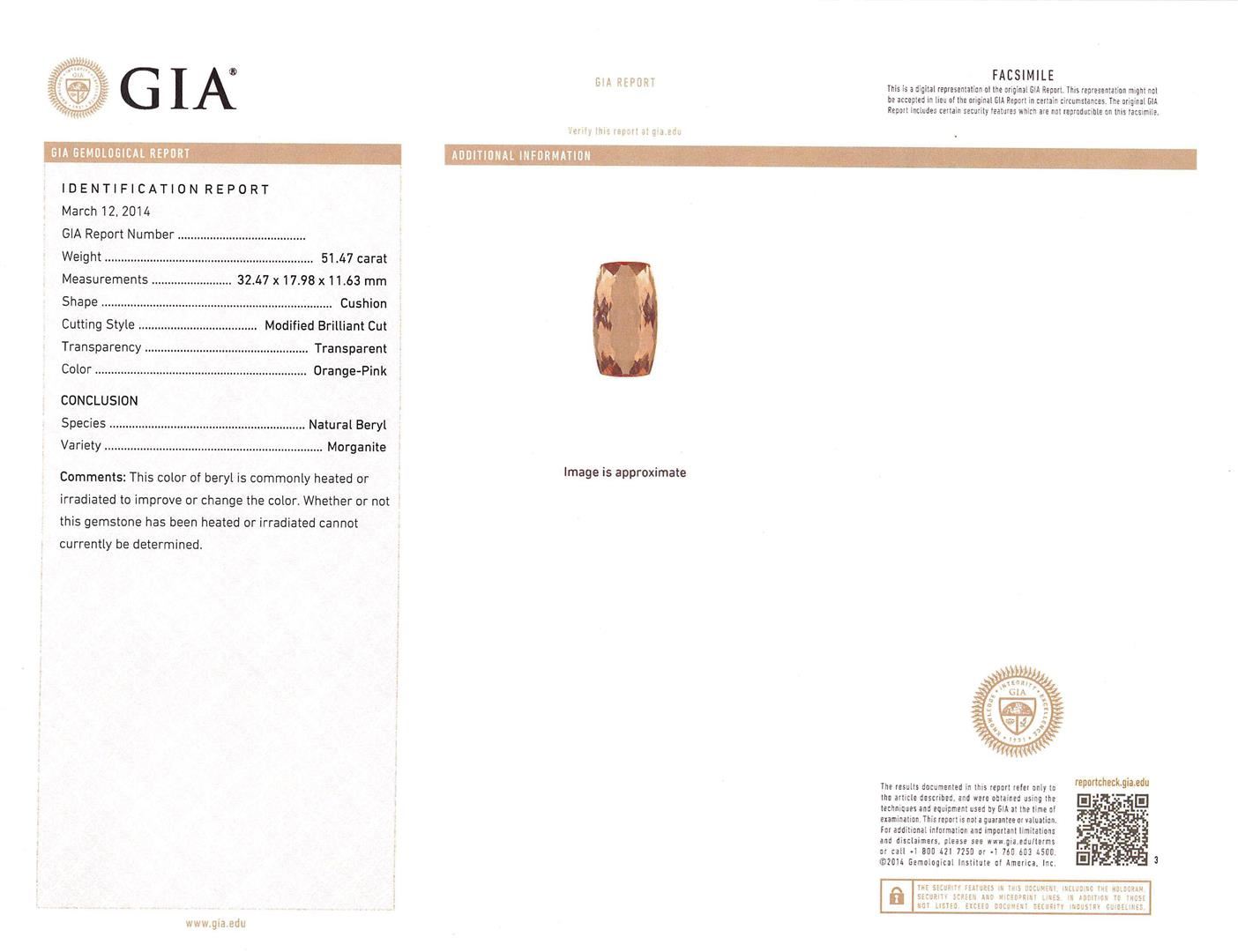 One prong set cushion modified brilliant cut natural morganite, measuring 32.47 x 17.98 x 11.63mm, exact weight 51.47ct., clarity is slightly included, type I, cut is good. Transmitting light with no distortion, transparent. GIA Colored Stone Grading Report attached. Graded loose prior to setting in the GIA Laboratory, Report # 2151952529.Thirty-Six prong set round brilliant cut diamonds, measuring 2.30 - 2.20 x 1.35mm (depth est.) approximate total weight of 36 Stones = 1.60ct. Color & clarity grade are an average for the group. Graded in the setting. Clarity: SI-2 to I-2. Color: G - I Forty-Six prong set round brilliant cut diamonds, measuring 2.10 - 2.00 x 1.23mm (depth est.) approximate total weight of 46 Stones = 1.52ct. Color & clarity grade are an average for the group. Graded in the setting. Clarity: SI-2 to I-2. Color: G - I. Total Weight of Colored Stones 51.47ct. Total Weight of Diamonds 3.12ct. Total Weight of Pendant With Chain 27.89gm. AIG Appraised at $38,405.00.