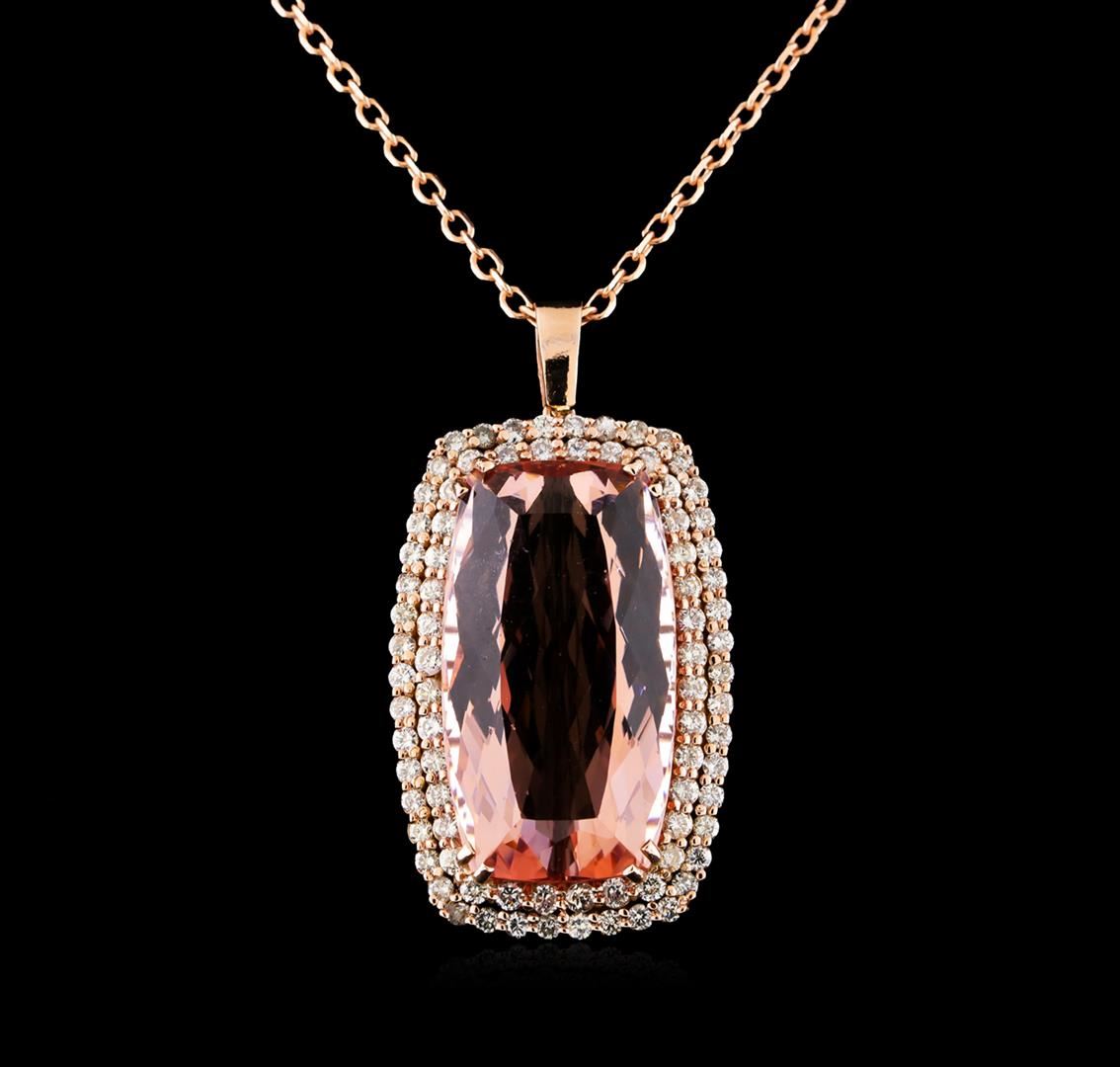 One prong set cushion modified brilliant cut natural morganite, measuring 32.47 x 17.98 x 11.63mm, exact weight 51.47ct., clarity is slightly included, type I, cut is good. Transmitting light with no distortion, transparent. GIA Colored Stone Grading Report attached. Graded loose prior to setting in the GIA Laboratory, Report # 2151952529.Thirty-Six prong set round brilliant cut diamonds, measuring 2.30 - 2.20 x 1.35mm (depth est.) approximate total weight of 36 Stones = 1.60ct. Color & clarity grade are an average for the group. Graded in the setting. Clarity: SI-2 to I-2. Color: G - I Forty-Six prong set round brilliant cut diamonds, measuring 2.10 - 2.00 x 1.23mm (depth est.) approximate total weight of 46 Stones = 1.52ct. Color & clarity grade are an average for the group. Graded in the setting. Clarity: SI-2 to I-2. Color: G - I. Total Weight of Colored Stones 51.47ct. Total Weight of Diamonds 3.12ct. Total Weight of Pendant With Chain 27.89gm. AIG Appraised at $38,405.00.