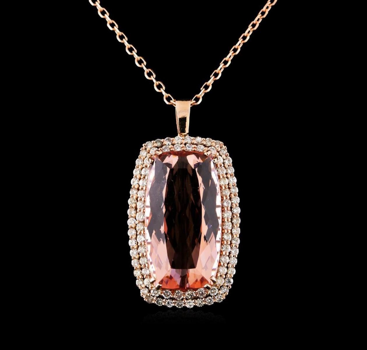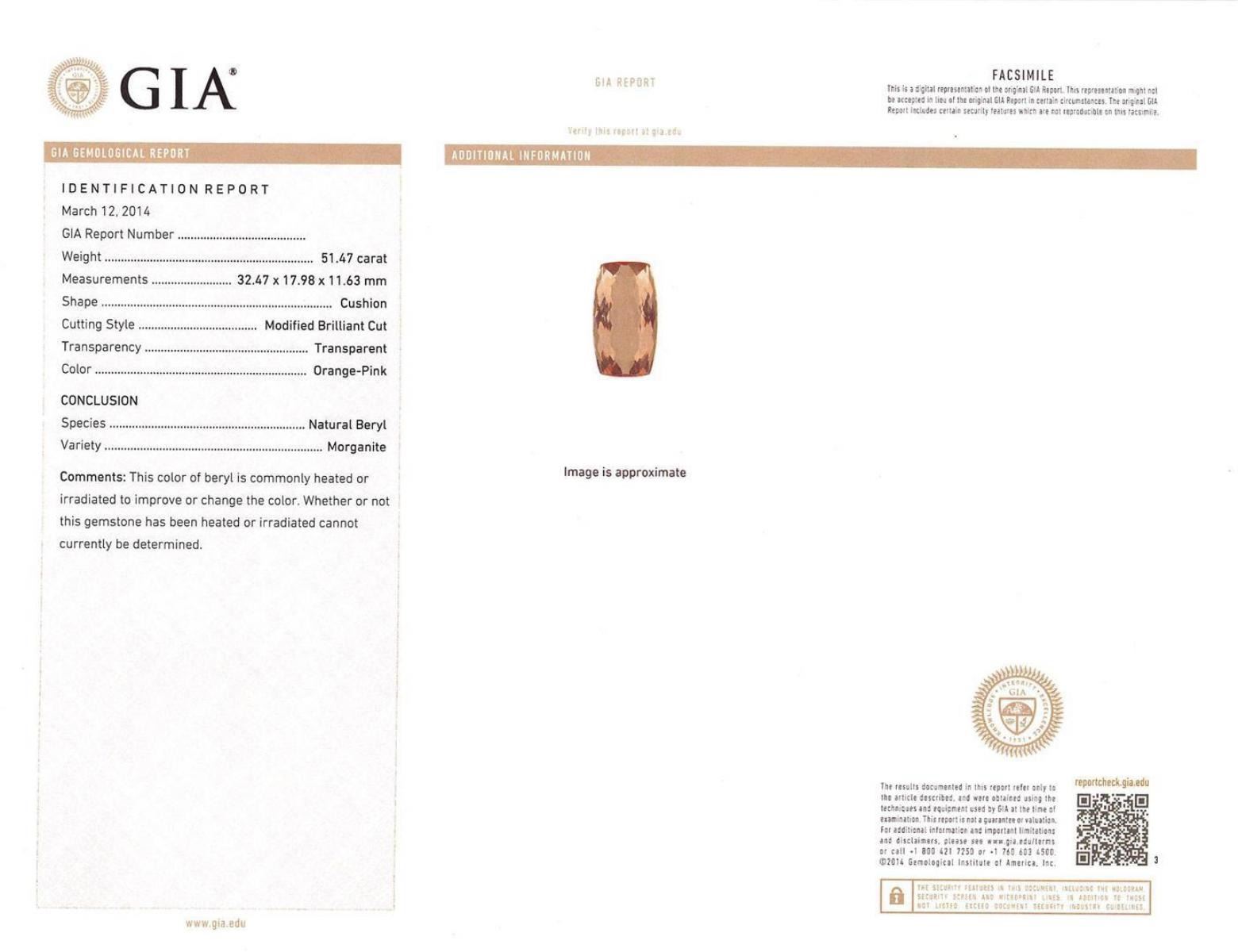 One prong set cushion modified brilliant cut natural morganite, measuring 32.47 x 17.98 x 11.63mm, exact weight 51.47ct., clarity is slightly included, type I, cut is good. Transmitting light with no distortion, transparent. GIA Colored Stone Grading Report attached. Graded loose prior to setting in the GIA Laboratory, Report # 2151952529.Thirty-Six prong set round brilliant cut diamonds, measuring 2.30 - 2.20 x 1.35mm (depth est.) approximate total weight of 36 Stones = 1.60ct. Color & clarity grade are an average for the group. Graded in the setting. Clarity: SI-2 to I-2. Color: G - I Forty-Six prong set round brilliant cut diamonds, measuring 2.10 - 2.00 x 1.23mm (depth est.) approximate total weight of 46 Stones = 1.52ct. Color & clarity grade are an average for the group. Graded in the setting. Clarity: SI-2 to I-2. Color: G - I. Total Weight of Colored Stones 51.47ct. Total Weight of Diamonds 3.12ct. Total Weight of Pendant With Chain 27.89gm. AIG Appraised.