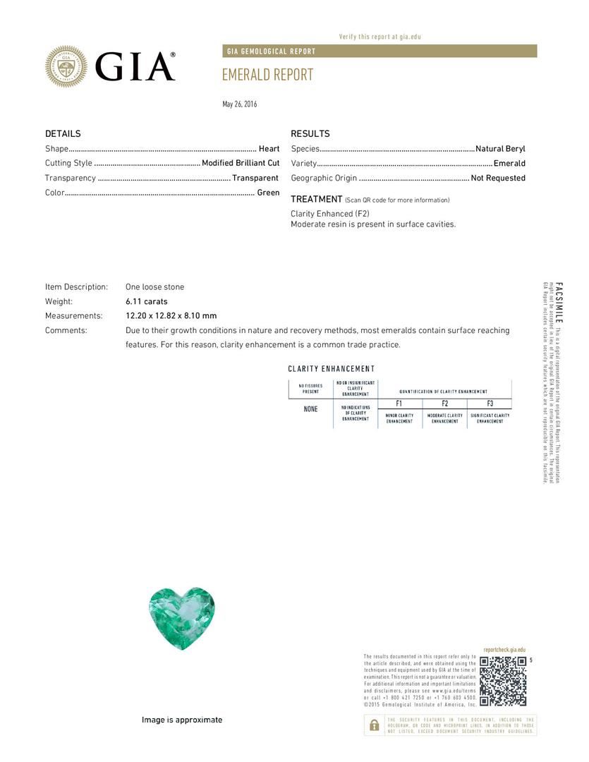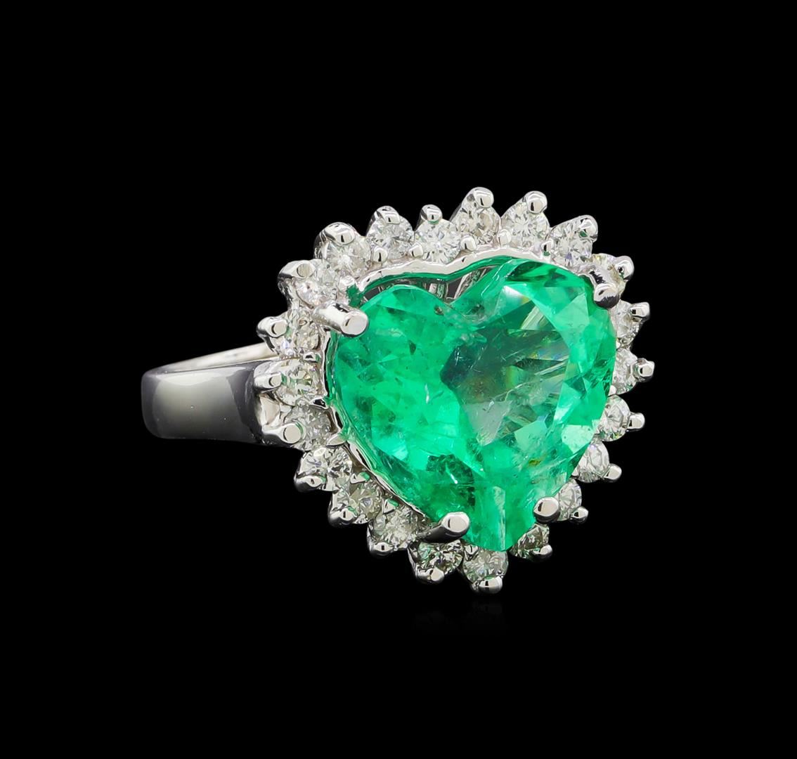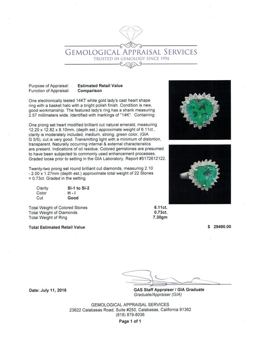 One electronically tested 14KT white gold lady's cast heart shape ring with a basket halo with a bright polish finish. The featured lady's ring has a shank measuring 2.57 millimeters wide. Identified with markings of '14K'. Condition is new, good workmanship. Containing: One prong set heart modified brilliant cut natural emerald, measuring 12.20 x 12.82 x 8.10mm, (depth est.) approximate weight of 6.11ct., clarity is moderately included, medium, strong, green color, (GIA G 5/5), cut is very good. Transmitting light with a minimum of distortion, transparent. Naturally occurring internal & external characteristics are present. Indications of oil residue. Colored gemstones are presumed to have been subjected to commonly used enhancement processes. Graded loose prior to setting in the GIA Laboratory, Report #5172612122. Twenty-Two prong set round brilliant cut diamonds, measuring 2.10 - 2.00 x 1.27mm (depth est.) approximate total weight of 22 Stones = 0.73ct. Graded in the setting. Clarity SI-1 to SI-2. Color: H - I Cut Good. Total Weight of Colored Stones 6.11ct.. Total Weight of Diamonds 0.73ct.. Total Weight of Ring 7.30gm. GAS Appraised at $29,490.00.