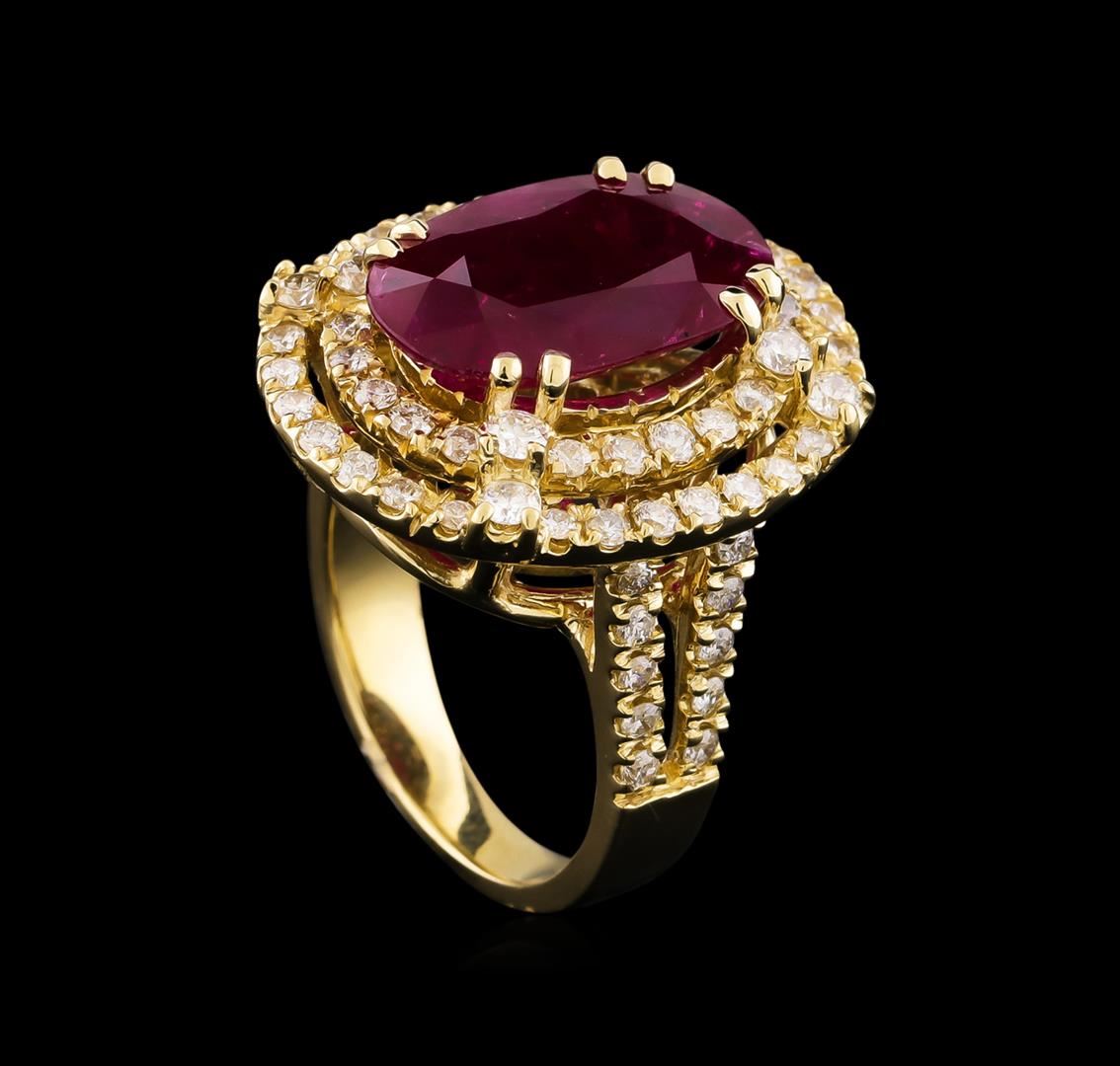 One electronically tested 14KT yellow gold lady's cast fashion ring with a double basket halo with a bright polish finish. The featured lady's ring has a shank measuring 3.25 millimeters wide. Identified with markings of "K14". Condition is new, good workmanship. Containing: One prong set oval modified brilliant cut natural ruby, measuring 16.33 x 10.06 x 3.58mm, 30%. bulge factor, approximate weight of 6.38ct., clarity is heavily included, medium dark, moderately strong, slightly purplish red color, (GIA slpR 6/4), cut is very good. Transmitting light somewhat diffusely, semi-transparent to translucent. Naturally occurring internal & external characteristics are present. Indications of laboratory high temperature heat treatment with significant residues. Graded loose prior to setting in the GIA Laboratory, Report #2175501587.Eight prong set round brilliant cut diamonds, measuring 2.30 - 2.25 x 1.41mm (depth est.) approximate total weight of 8 Stones = 0.36ct. Graded in the setting. Clarity: SI-1 to SI-2. Color: H - I. Cut Very Good Sixty-Eight prong set round brilliant cut diamonds, measuring 1.70 - 1.65 x 1.04mm (depth est.) approximate total weight of 68 Stones = 1.22ct. Graded in the setting. Clarity: SI-1 to I-1. Color: H - I. Cut Good. Total Weight of Colored Stones 6.38ct. Total Weight of Diamonds 1.58ct. Total Weight of Ring 12.30gm. GAS Appraised at $35,255.00.