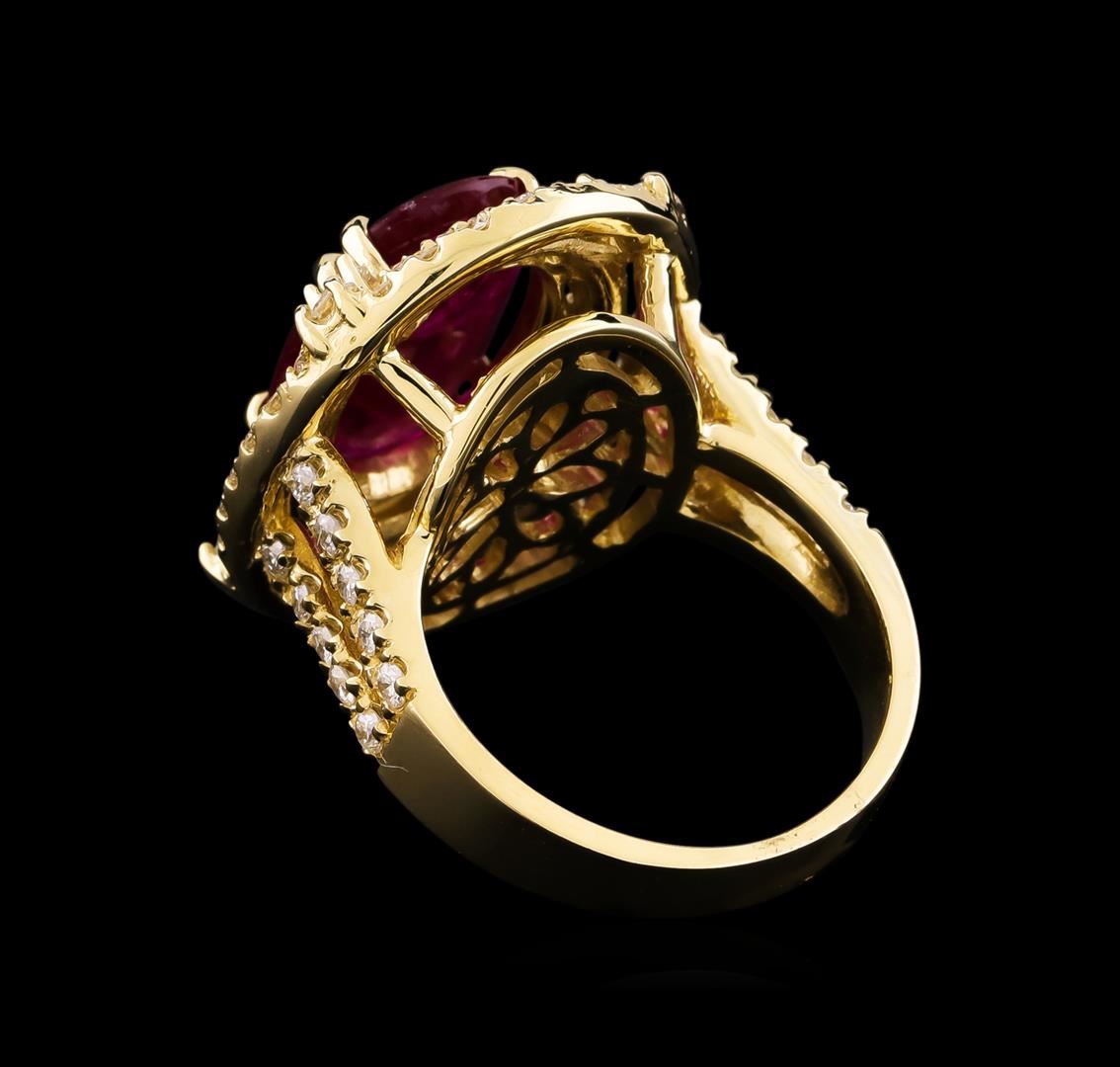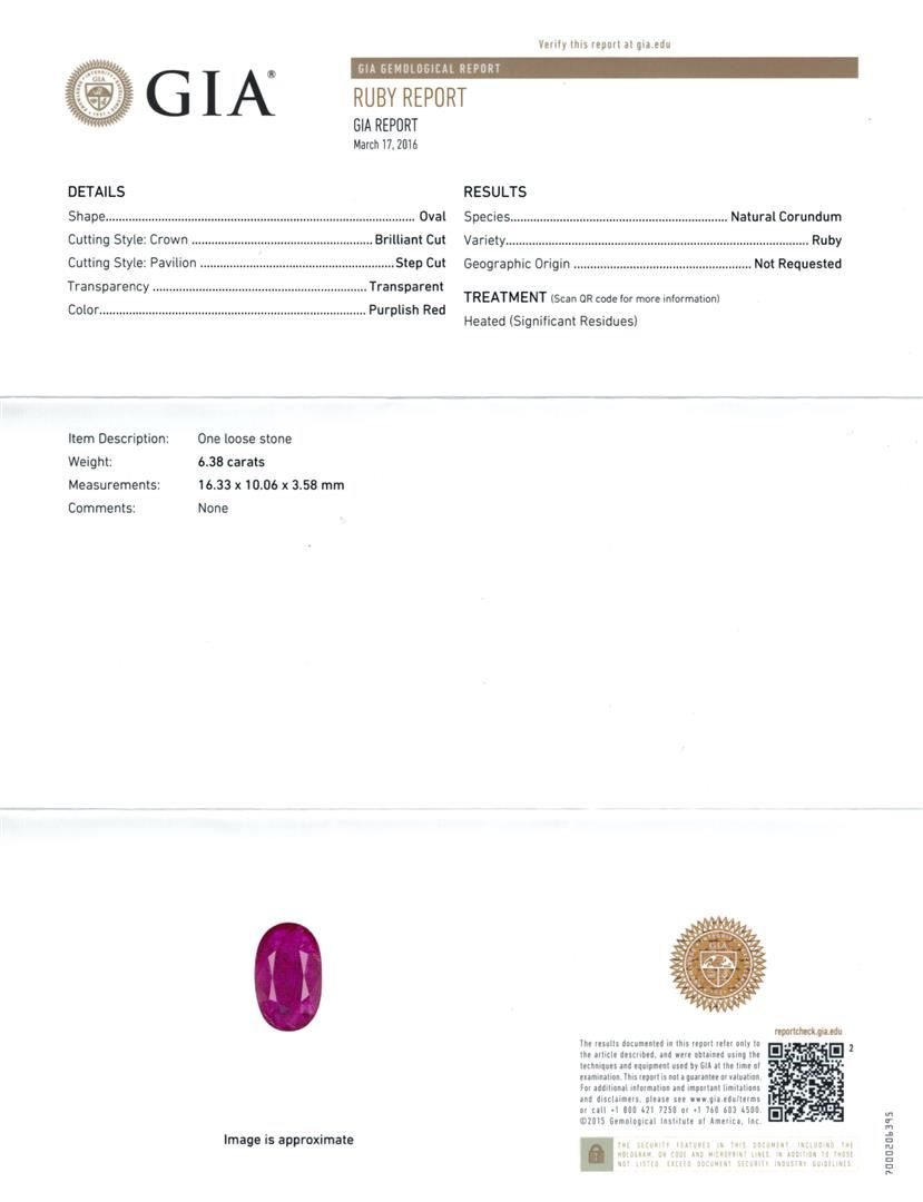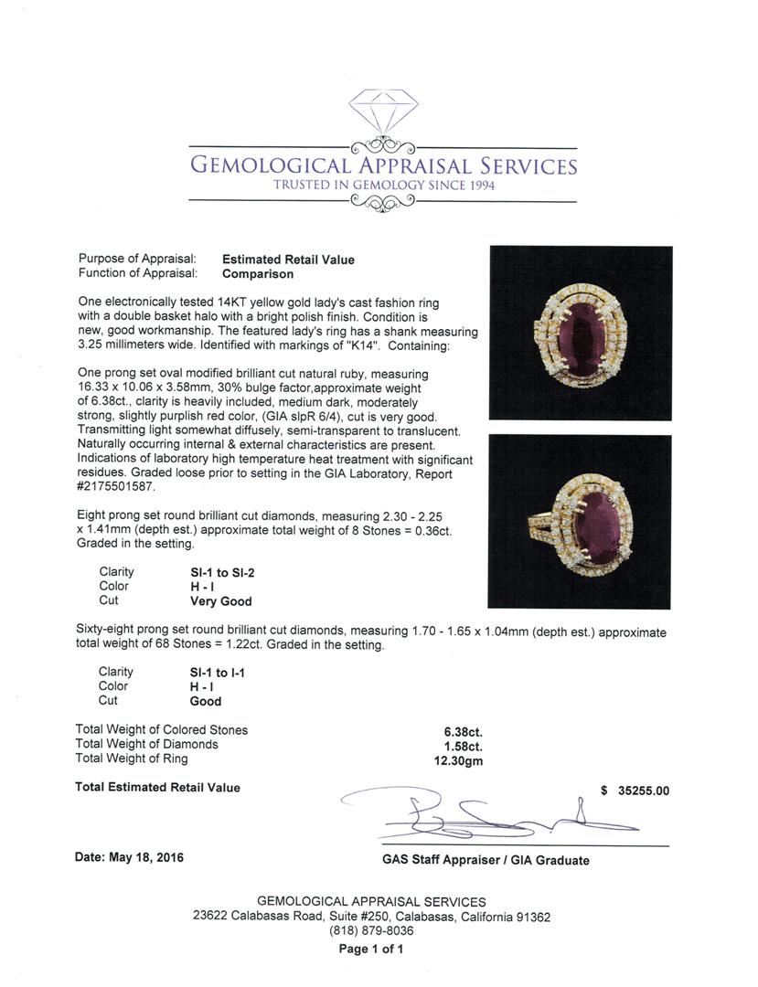 One electronically tested 14KT yellow gold lady's cast fashion ring with a double basket halo with a bright polish finish. The featured lady's ring has a shank measuring 3.25 millimeters wide. Identified with markings of "K14". Condition is new, good workmanship. Containing: One prong set oval modified brilliant cut natural ruby, measuring 16.33 x 10.06 x 3.58mm, 30%. bulge factor, approximate weight of 6.38ct., clarity is heavily included, medium dark, moderately strong, slightly purplish red color, (GIA slpR 6/4), cut is very good. Transmitting light somewhat diffusely, semi-transparent to translucent. Naturally occurring internal & external characteristics are present. Indications of laboratory high temperature heat treatment with significant residues. Graded loose prior to setting in the GIA Laboratory, Report #2175501587.Eight prong set round brilliant cut diamonds, measuring 2.30 - 2.25 x 1.41mm (depth est.) approximate total weight of 8 Stones = 0.36ct. Graded in the setting. Clarity: SI-1 to SI-2. Color: H - I. Cut Very Good Sixty-Eight prong set round brilliant cut diamonds, measuring 1.70 - 1.65 x 1.04mm (depth est.) approximate total weight of 68 Stones = 1.22ct. Graded in the setting. Clarity: SI-1 to I-1. Color: H - I. Cut Good. Total Weight of Colored Stones 6.38ct. Total Weight of Diamonds 1.58ct. Total Weight of Ring 12.30gm. GAS Appraised at $35,255.00.