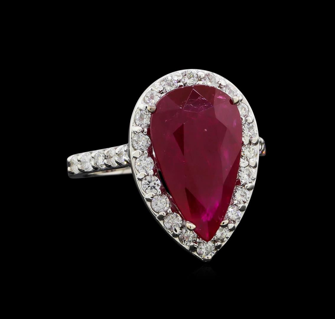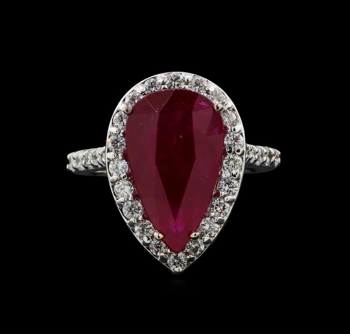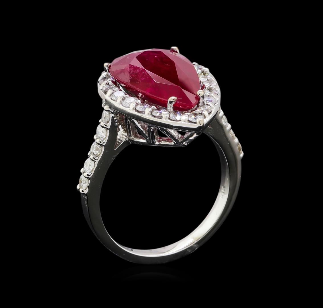 One electronically tested 14KT white gold lady's cast fashion ring with a basket halo with a bright polish finish. The featured lady's ring has a shank measuring 2.16 millimeters wide. Identified with markings of '14K'. Condition is new, good workmanship. Containing: One prong set pear modified mixed cut natural ruby, measuring 16.48 x 9.94 x 5.10mm, (depth est.) approximate weight of 6.46ct., clarity is heavily included, medium dark, very slightly brownish, strongly purplish red color, (GIA stpR 6/3), cut is very good. Transmitting light somewhat diffusely, semi-transparent to translucent. Naturally occurring internal & external characteristics are present. Colored gemstones are presumed to have been subjected to commonly used enhancement processes. Graded loose prior to setting in the GIA Laboratory, Report #2175603398. Thirty prong set round brilliant cut diamonds, measuring 2.00 - 1.90 x 1.21mm (depth est.) approximate total weight of 30 Stones = 0.85ct. Graded in the setting. Clarity SI-1 to SI-2. Color: H - I Cut Good. Total Weight of Colored Stones 6.46ct.. Total Weight of Diamonds 0.85ct.. Total Weight of Ring 7.20gm. GAS Appraised at $15,925.00.