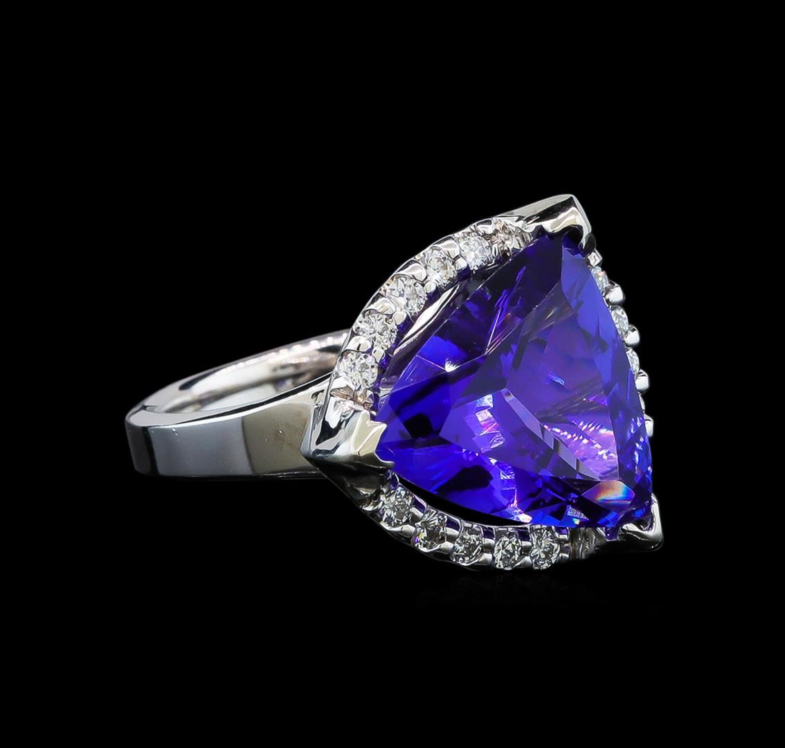 One electronically tested 14KT white gold lady's cast fashion ring with a halo with a bright polish finish. The featured lady's ring has a shank measuring 3.15 millimeters wide. Identified with markings of '14K'. Condition is new, good workmanship. Containing: One prong set triangle modified brilliant cut natural tanzanite, measuring 13.19 x 14.44 x 6.68mm, (depth est.) approximate weight of 6.52ct., clarity is eye clean, medium dark, strong, violetish blue color, (GIA vB 6/5), cut is very good. Transmitting light with no distortion, transparent. Colored gemstones are presumed to have been subjected to commonly used enhancement processes. Graded loose prior to setting in the GIA Laboratory, Report #1172665821. Fifteen prong set round brilliant cut diamonds, measuring 1.80 - 1.70 x 1.09mm (depth est.) approximate total weight of 15 Stones = 0.31ct. Graded in the setting. Clarity SI-1 to I-1. Color: H - I Cut Good. Total Weight of Colored Stones 6.52ct.. Total Weight of Diamonds 0.31ct.. Total Weight of Ring 9.50gm. GAS Appraised at $13,395.00.