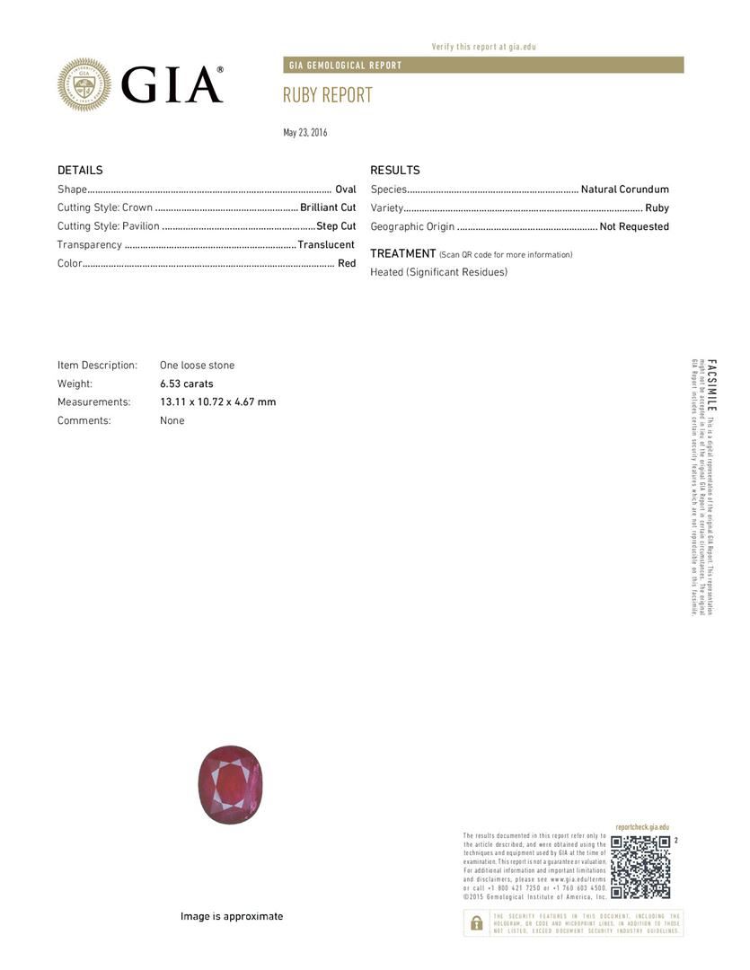 One electronically tested 14KT white gold lady's cast fashion ring with a basket double halo with a bright polish finish. The featured lady's ring has a shank measuring 2.06 millimeters wide. Identified with markings of '14K'. Condition is new, good workmanship. Containing: One prong set oval modified mixed cut natural ruby, measuring 13.11 x 10.72 x 4.67mm, (depth est.) 15%. bulge factor, approximate weight of 6.53ct., clarity is moderately included, medium dark, very slightly brownish, red color, (GIA R 6/3), cut is very good. Transmitting light somewhat diffusely, transparent to translucent. Naturally occurring internal & external characteristics are present. Colored gemstones are presumed to have been subjected to commonly used enhancement processes. Graded loose prior to setting in the GIA Laboratory, Report #1172603095. Twenty-Two prong set round brilliant cut diamonds, measuring 2.10 - 2.00 x 1.23mm (depth est.) approximate total weight of 22 Stones = 0.70ct. Graded in the setting. Clarity SI-1 to SI-2. Color: G - I Cut Good Twenty-Two prong set round brilliant cut diamonds, measuring 1.80 - 1.75 x 1.10mm (depth est.) approximate total weight of 22 Stones = 0.48ct. Graded in the setting. Clarity SI-1 to I-1. Color: G - I Cut Good. Total Weight of Colored Stones 6.53ct.. Total Weight of Diamonds 1.18ct.. Total Weight of Ring 8.00gm. GAS Appraised at $16,725.00.