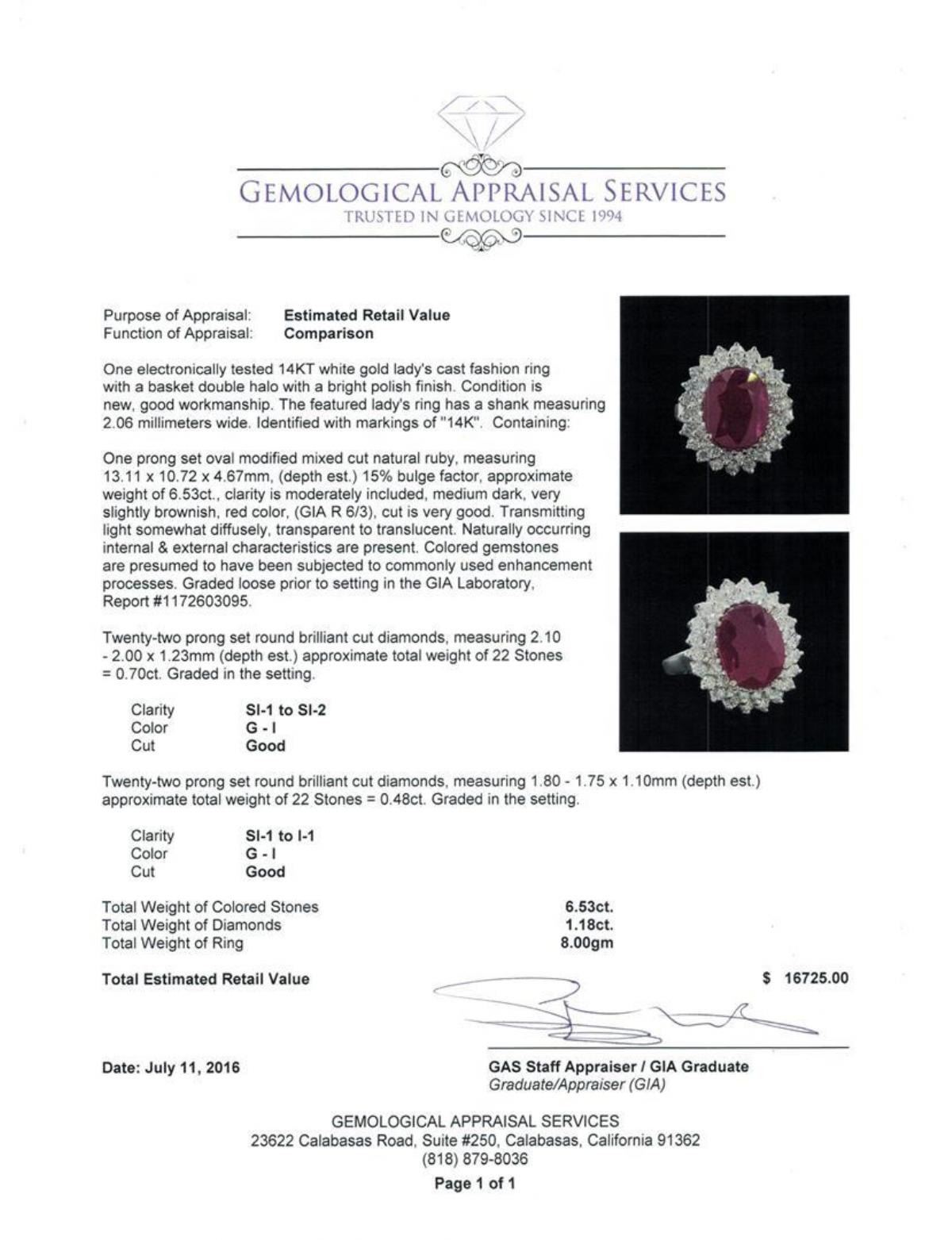One electronically tested 14KT white gold lady's cast fashion ring with a basket double halo with a bright polish finish. The featured lady's ring has a shank measuring 2.06 millimeters wide. Identified with markings of '14K'. Condition is new, good workmanship. Containing: One prong set oval modified mixed cut natural ruby, measuring 13.11 x 10.72 x 4.67mm, (depth est.) 15%. bulge factor, approximate weight of 6.53ct., clarity is moderately included, medium dark, very slightly brownish, red color, (GIA R 6/3), cut is very good. Transmitting light somewhat diffusely, transparent to translucent. Naturally occurring internal & external characteristics are present. Colored gemstones are presumed to have been subjected to commonly used enhancement processes. Graded loose prior to setting in the GIA Laboratory, Report #1172603095. Twenty-Two prong set round brilliant cut diamonds, measuring 2.10 - 2.00 x 1.23mm (depth est.) approximate total weight of 22 Stones = 0.70ct. Graded in the setting. Clarity SI-1 to SI-2. Color: G - I Cut Good Twenty-Two prong set round brilliant cut diamonds, measuring 1.80 - 1.75 x 1.10mm (depth est.) approximate total weight of 22 Stones = 0.48ct. Graded in the setting. Clarity SI-1 to I-1. Color: G - I Cut Good. Total Weight of Colored Stones 6.53ct.. Total Weight of Diamonds 1.18ct.. Total Weight of Ring 8.00gm. GAS Appraised.