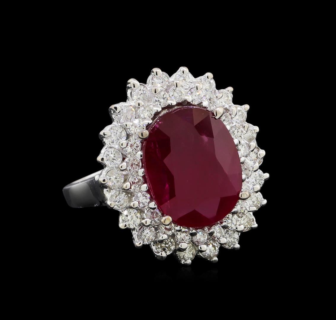 One electronically tested 14KT white gold lady's cast fashion ring with a basket double halo with a bright polish finish. The featured lady's ring has a shank measuring 2.06 millimeters wide. Identified with markings of '14K'. Condition is new, good workmanship. Containing: One prong set oval modified mixed cut natural ruby, measuring 13.11 x 10.72 x 4.67mm, (depth est.) 15%. bulge factor, approximate weight of 6.53ct., clarity is moderately included, medium dark, very slightly brownish, red color, (GIA R 6/3), cut is very good. Transmitting light somewhat diffusely, transparent to translucent. Naturally occurring internal & external characteristics are present. Colored gemstones are presumed to have been subjected to commonly used enhancement processes. Graded loose prior to setting in the GIA Laboratory, Report #1172603095. Twenty-Two prong set round brilliant cut diamonds, measuring 2.10 - 2.00 x 1.23mm (depth est.) approximate total weight of 22 Stones = 0.70ct. Graded in the setting. Clarity SI-1 to SI-2. Color: G - I Cut Good Twenty-Two prong set round brilliant cut diamonds, measuring 1.80 - 1.75 x 1.10mm (depth est.) approximate total weight of 22 Stones = 0.48ct. Graded in the setting. Clarity SI-1 to I-1. Color: G - I Cut Good. Total Weight of Colored Stones 6.53ct.. Total Weight of Diamonds 1.18ct.. Total Weight of Ring 8.00gm. GAS Appraised.