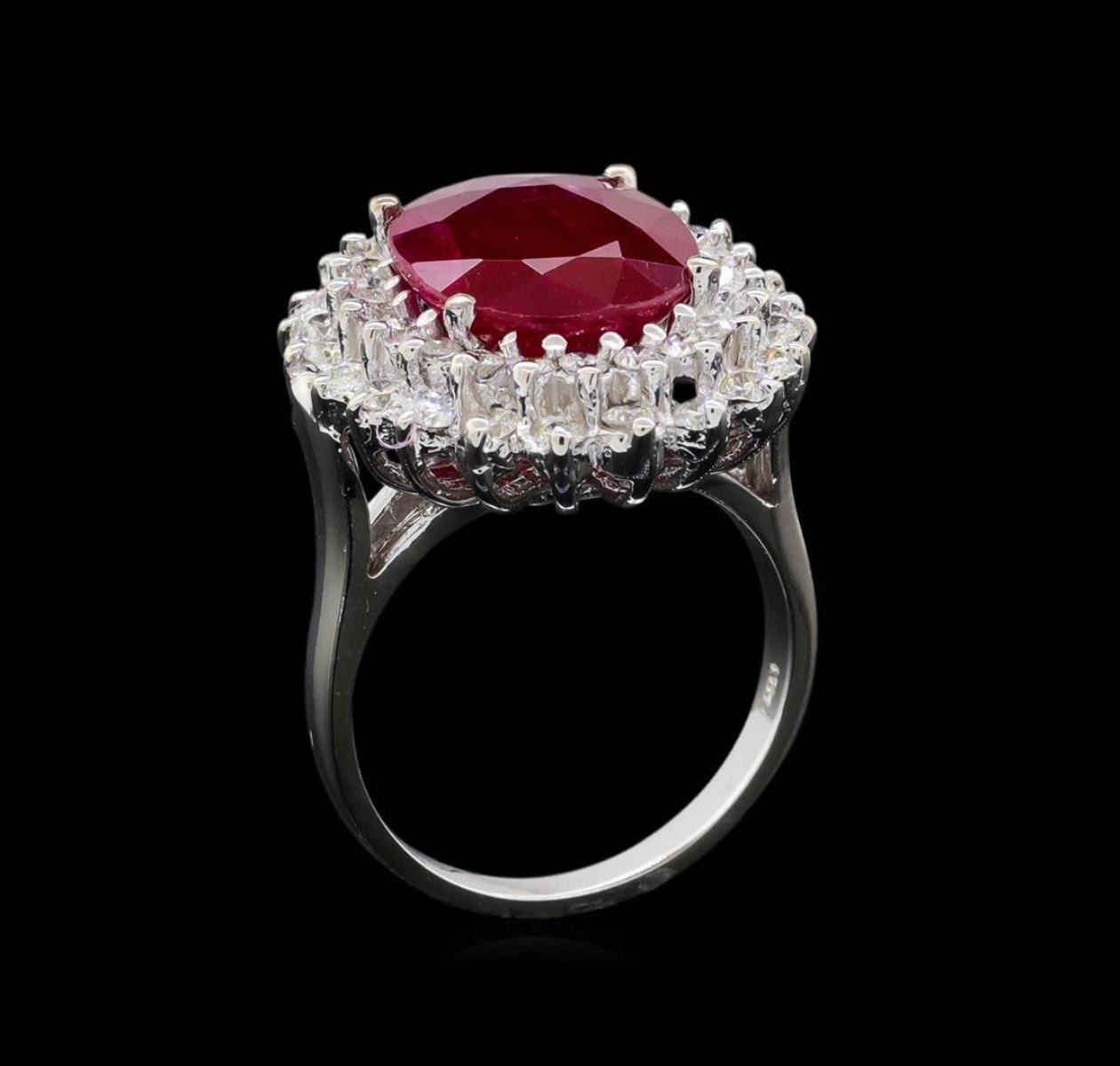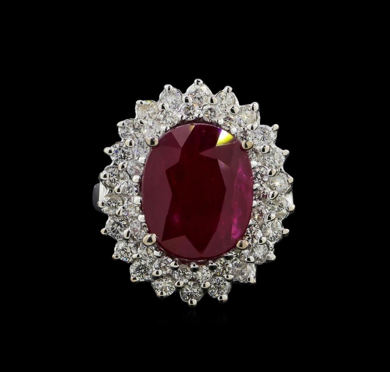 One electronically tested 14KT white gold lady's cast fashion ring with a basket double halo with a bright polish finish. The featured lady's ring has a shank measuring 2.06 millimeters wide. Identified with markings of '14K'. Condition is new, good workmanship. Containing: One prong set oval modified mixed cut natural ruby, measuring 13.11 x 10.72 x 4.67mm, (depth est.) 15%. bulge factor, approximate weight of 6.53ct., clarity is moderately included, medium dark, very slightly brownish, red color, (GIA R 6/3), cut is very good. Transmitting light somewhat diffusely, transparent to translucent. Naturally occurring internal & external characteristics are present. Colored gemstones are presumed to have been subjected to commonly used enhancement processes. Graded loose prior to setting in the GIA Laboratory, Report #1172603095. Twenty-Two prong set round brilliant cut diamonds, measuring 2.10 - 2.00 x 1.23mm (depth est.) approximate total weight of 22 Stones = 0.70ct. Graded in the setting. Clarity SI-1 to SI-2. Color: G - I Cut Good Twenty-Two prong set round brilliant cut diamonds, measuring 1.80 - 1.75 x 1.10mm (depth est.) approximate total weight of 22 Stones = 0.48ct. Graded in the setting. Clarity SI-1 to I-1. Color: G - I Cut Good. Total Weight of Colored Stones 6.53ct.. Total Weight of Diamonds 1.18ct.. Total Weight of Ring 8.00gm. GAS Appraised.