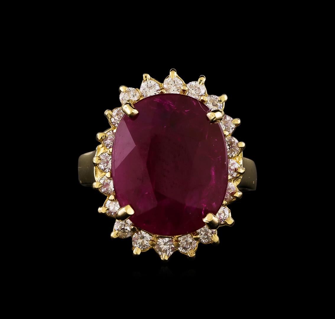 One electronically tested 14KT yellow gold lady's cast fashion ring with a basket halo with a bright polish finish. The featured lady's ring has a shank measuring 3.04 millimeters wide. Identified with markings of '14K'. Condition is new, good workmanship. Containing: One prong set oval modified mixed cut natural ruby, measuring 14.17 x 11.59 x 4.39mm, (depth est.) 15%. bulge factor, approximate weight of 6.96ct., clarity is severely included, medium dark, very slightly brownish, red color, (GIA R 6/3), cut is good. Transmitting light somewhat diffusely, semi-transparent to translucent. Naturally occurring internal & external characteristics are present. Colored gemstones are presumed to have been subjected to commonly used enhancement processes. Graded loose prior to setting in the GIA Laboratory, Report #5171603102. Twenty prong set round brilliant cut diamonds, measuring 2.10 - 2.00 x 1.28mm (depth est.) approximate total weight of 20 Stones = 0.68ct. Graded in the setting. Clarity SI-1 to SI-2. Color: H - I Cut Good. Total Weight of Colored Stones 6.96ct.. Total Weight of Diamonds 0.68ct.. Total Weight of Ring 6.60gm. GAS Appraised at $15,720.00.