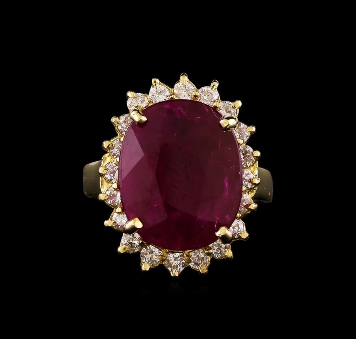 One electronically tested 14KT yellow gold lady's cast fashion ring with a basket halo with a bright polish finish. The featured lady's ring has a shank measuring 3.04 millimeters wide. Identified with markings of '14K'. Condition is new, good workmanship. Containing: One prong set oval modified mixed cut natural ruby, measuring 14.17 x 11.59 x 4.39mm, (depth est.) 15%. bulge factor, approximate weight of 6.96ct., clarity is severely included, medium dark, very slightly brownish, red color, (GIA R 6/3), cut is good. Transmitting light somewhat diffusely, semi-transparent to translucent. Naturally occurring internal & external characteristics are present. Colored gemstones are presumed to have been subjected to commonly used enhancement processes. Graded loose prior to setting in the GIA Laboratory, Report #5171603102. Twenty prong set round brilliant cut diamonds, measuring 2.10 - 2.00 x 1.28mm (depth est.) approximate total weight of 20 Stones = 0.68ct. Graded in the setting. Clarity SI-1 to SI-2. Color: H - I Cut Good. Total Weight of Colored Stones 6.96ct.. Total Weight of Diamonds 0.68ct.. Total Weight of Ring 6.60gm. GAS Appraised.