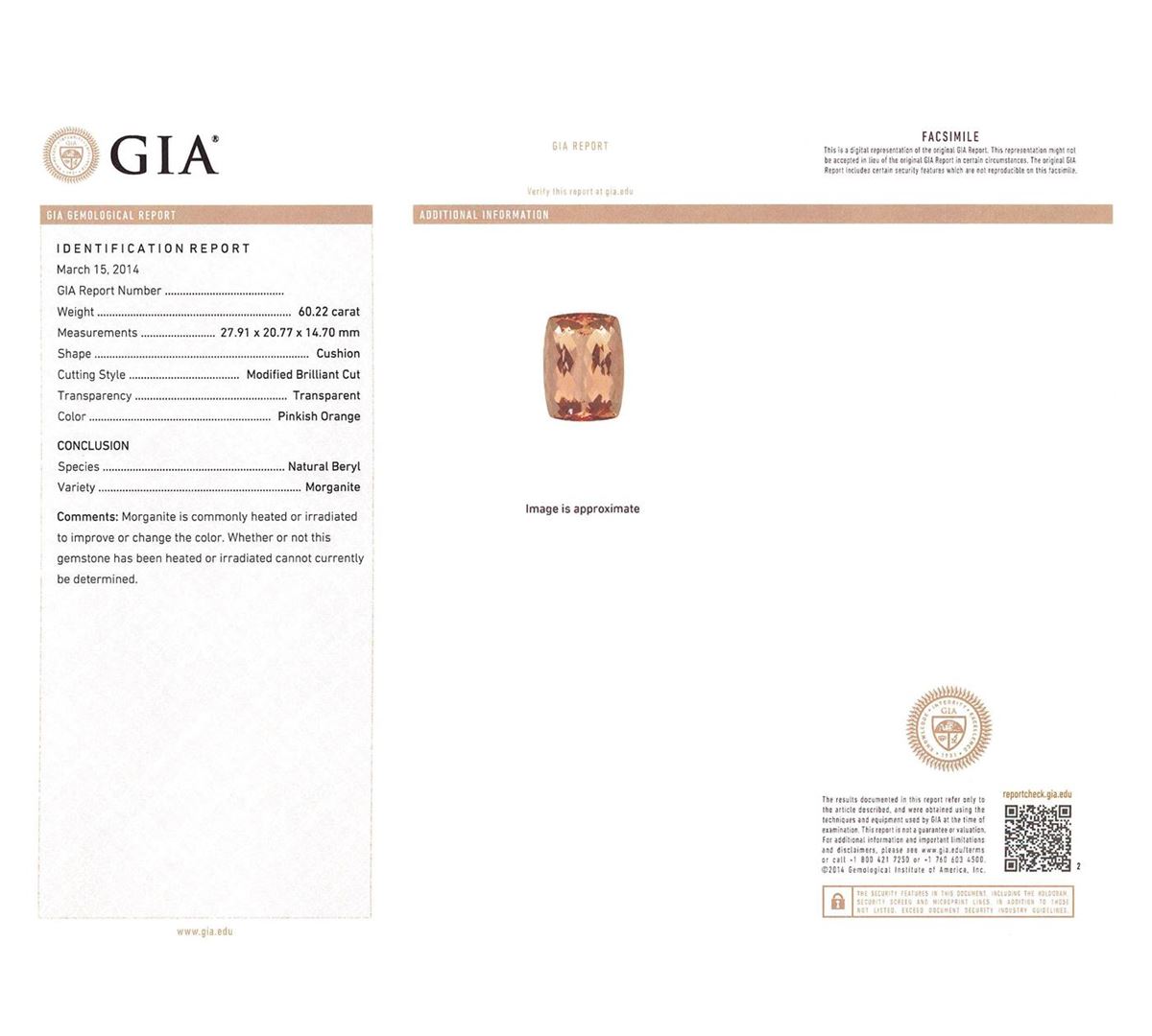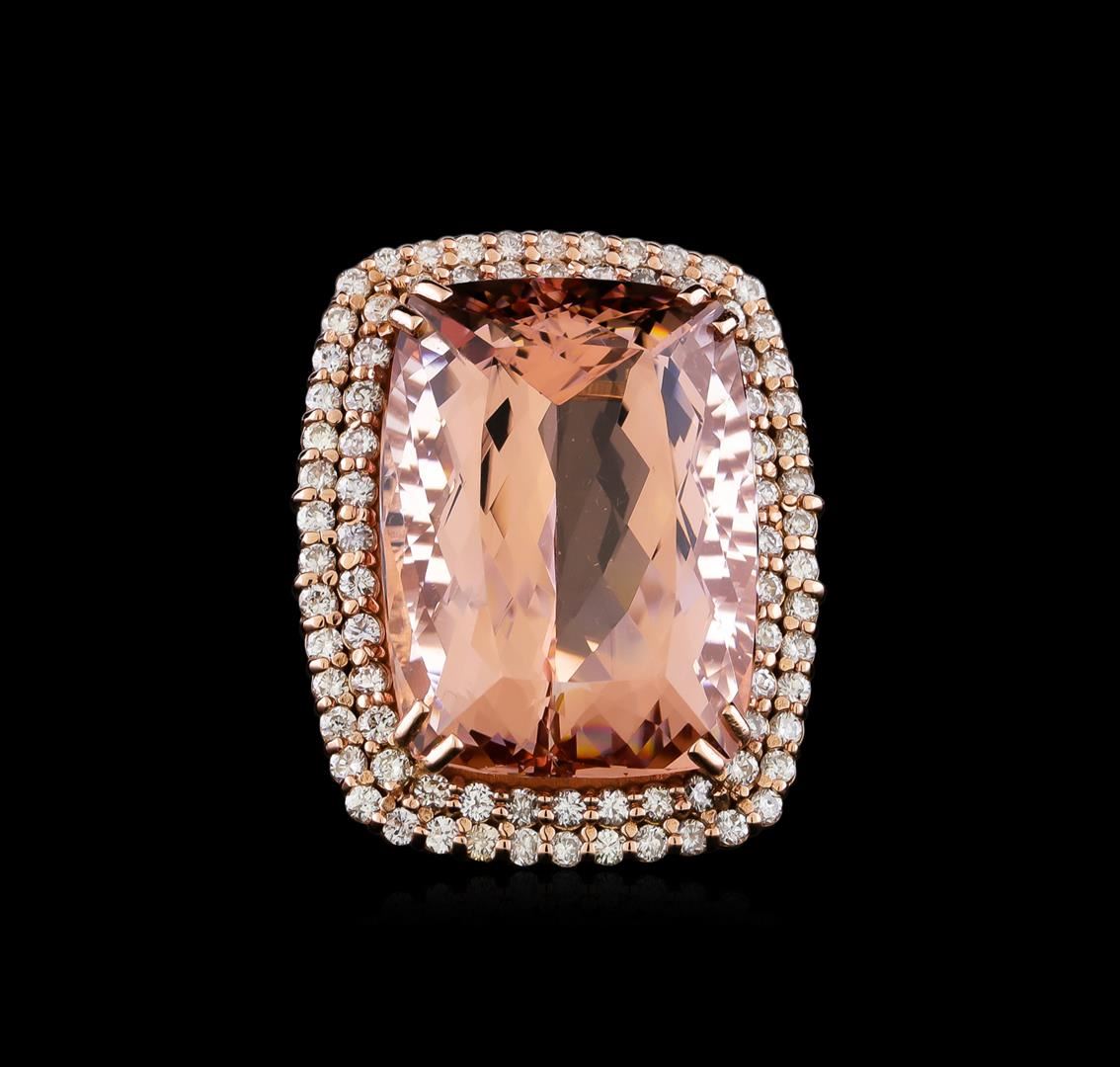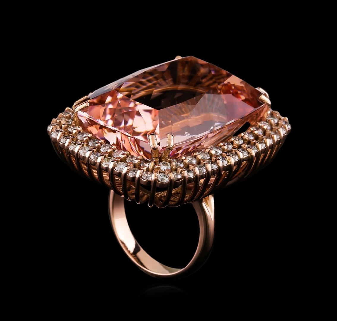 One prong set cushion modified brilliant cut natural morganite, measuring 27.91 x 20.77 x 14.70mm, exact weight 60.22ct., clarity is eye clean, type I, light, very slightly brownish, cut is good. Transmitting light with no distortion, transparent. GIA Colored Stone Grading Report attached. Graded loose prior to setting in the GIA Laboratory, Report #6157961117.Eighty-Two prong set round brilliant cut diamonds, measuring 2.20 - 2.00 x 1.26mm (depth est.) approximate total weight of 82 Stones = 2.68ct. Color & clarity grade are an average for the group. Graded in the setting. Clarity: SI-2 to I-1. Color: F - H. Total Weight of Colored Stones 60.22ct. Total Weight of Diamonds 2.68ct. Total Weight of Ring 28.37gm. AIG Appraised at $43,580.00.