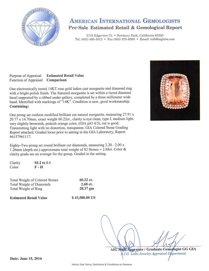 One prong set cushion modified brilliant cut natural morganite, measuring 27.91 x 20.77 x 14.70mm, exact weight 60.22ct., clarity is eye clean, type I, light, very slightly brownish, cut is good. Transmitting light with no distortion, transparent. GIA Colored Stone Grading Report attached. Graded loose prior to setting in the GIA Laboratory, Report #6157961117.Eighty-Two prong set round brilliant cut diamonds, measuring 2.20 - 2.00 x 1.26mm (depth est.) approximate total weight of 82 Stones = 2.68ct. Color & clarity grade are an average for the group. Graded in the setting. Clarity: SI-2 to I-1. Color: F - H. Total Weight of Colored Stones 60.22ct. Total Weight of Diamonds 2.68ct. Total Weight of Ring 28.37gm. AIG Appraised at $43,580.00.