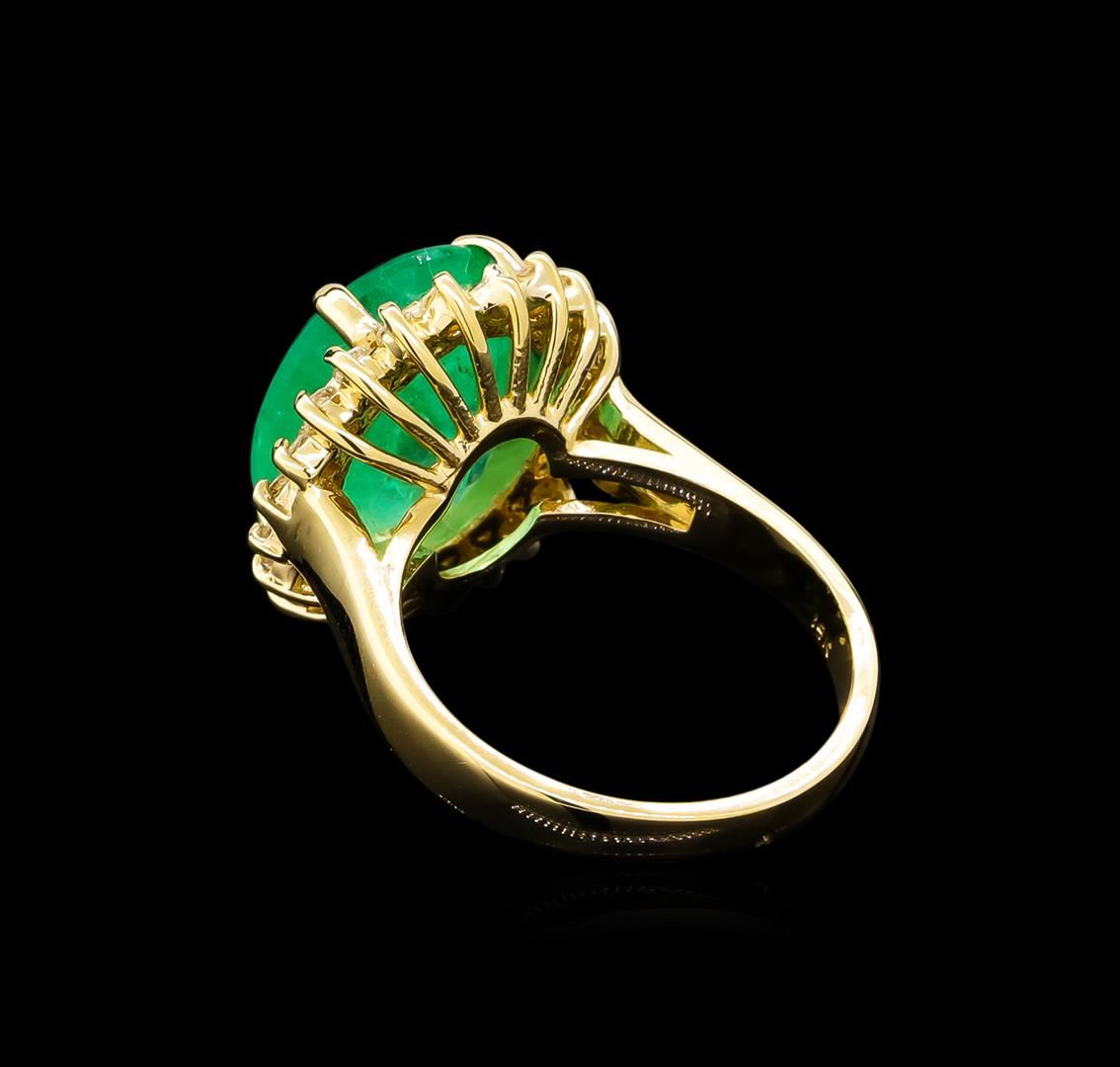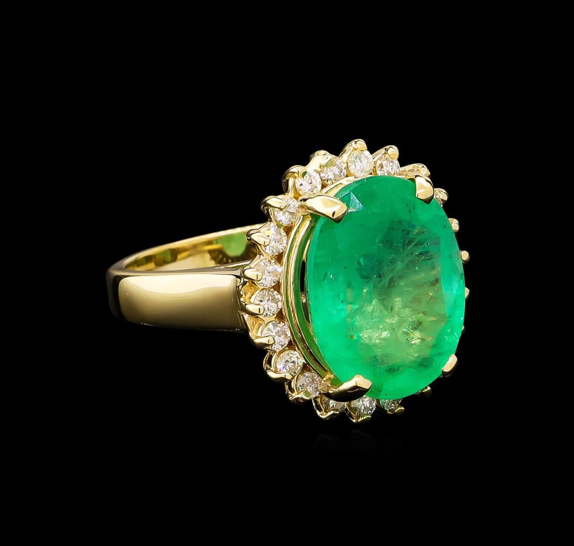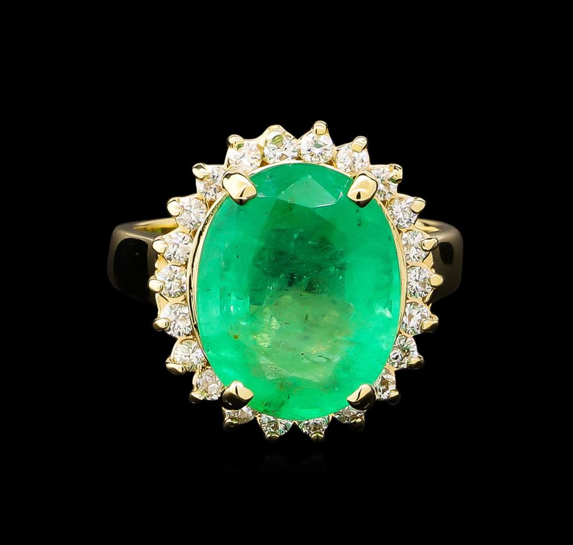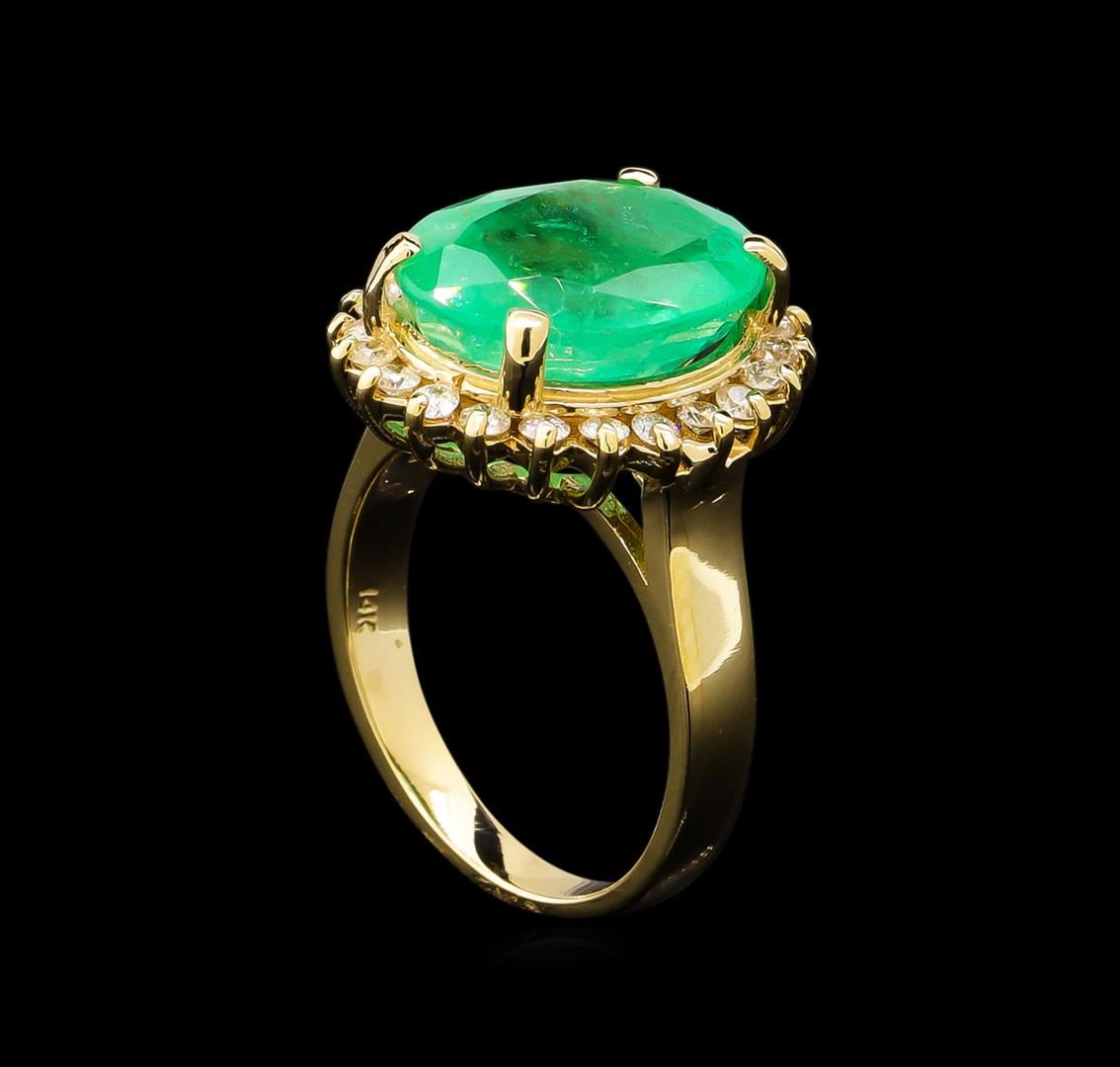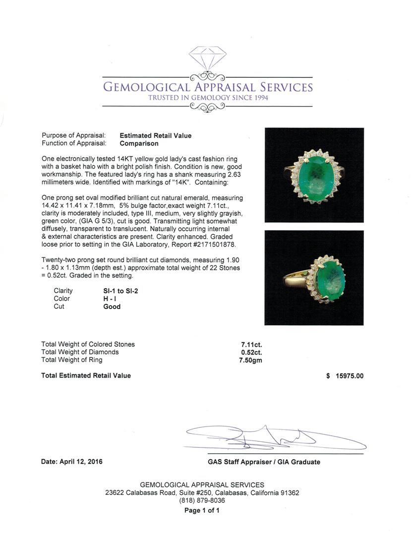 One electronically tested 14KT yellow gold lady's cast fashion ring with a basket halo with a bright polish finish. The featured lady's ring has a shank measuring 2.63 millimeters wide. Identified with markings of "14K". Condition is new, good workmanship. Containing: One prong set oval modified brilliant cut natural emerald, measuring 14.42 x 11.41 x 7.18mm, 5%. bulge factor, exact weight 7.11ct., clarity is moderately included, type III, medium, very slightly grayish, green color, (GIA G 5/3), cut is good. Transmitting light somewhat diffusely, transparent to translucent. Naturally occurring internal & external characteristics are present. Clarity enhanced. Graded loose prior to setting in the GIA Laboratory, Report #2171501878.Twenty-Two prong set round brilliant cut diamonds, measuring 1.90 - 1.80 x 1.13mm (depth est.) approximate total weight of 22 Stones = 0.52ct. Graded in the setting. Clarity: SI-1 to SI-2. Color: H - I. Cut Good. Total Weight of Colored Stones 7.11ct. Total Weight of Diamonds 0.52ct. Total Weight of Ring 7.50gm. GAS Appraised at $15,975.00.