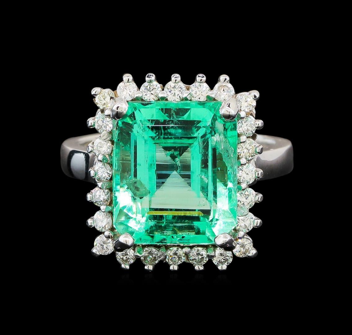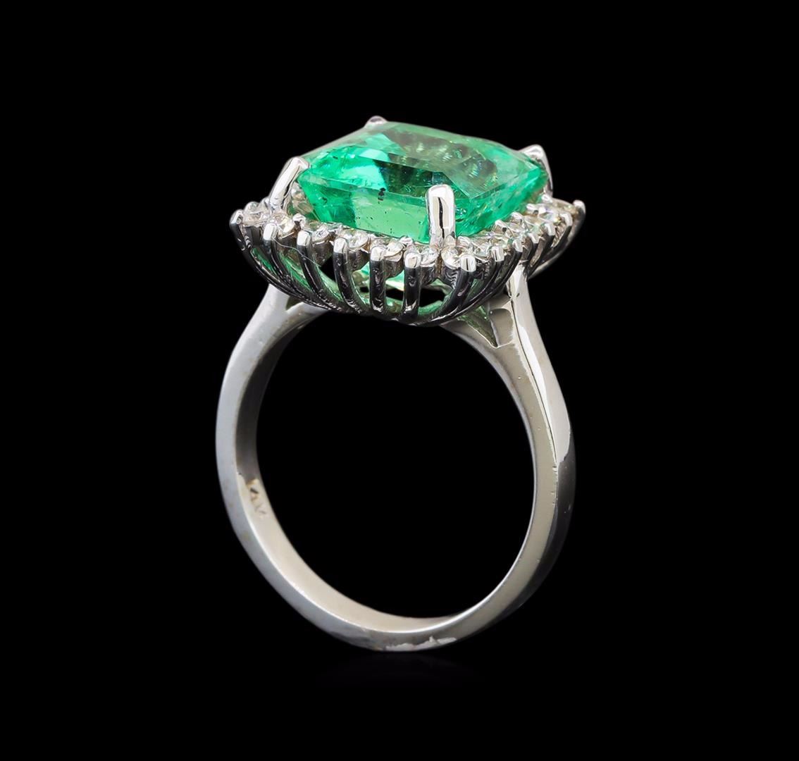 One electronically tested 14KT white gold ladies cast emerald and diamond ring with a bright polish finish. The featured emerald is set within a diamond floret supported by a ribbed under gallery, completed by a two and one-half millimeter wide band. Identified with markings of '14K'. Condition is new, good workmanship. Containing: One prong set octagonal step cut natural emerald, measuring 12.23 x 10.62 x 8.08mm, exact weight 7.13ct., clarity is slightly included, type III, medium light, very slightly grayish, green color, (GIA G 4/3), cut is good. Transmitting light with a minimum of distortion, transparent. Naturally occurring internal & external characteristics are present. Moderate clarity enhancement. GIA Gemological Report attached. Graded loose prior to setting in the GIA Laboratory, Report #1172664647. Twenty-Four prong set round brilliant cut diamonds, measuring 1.80 - 1.80 x 1.08mm (depth est.) approximate total weight of 24 Stones = 0.56ct. Graded in the setting. Clarity SI-2 to I-2. Color: G - I. Total Weight of Colored Stones 7.13ct.. Total Weight of Diamonds 0.56ct.. Total Weight of Ring 7.41gm. AIG Appraised at $12,925.00.