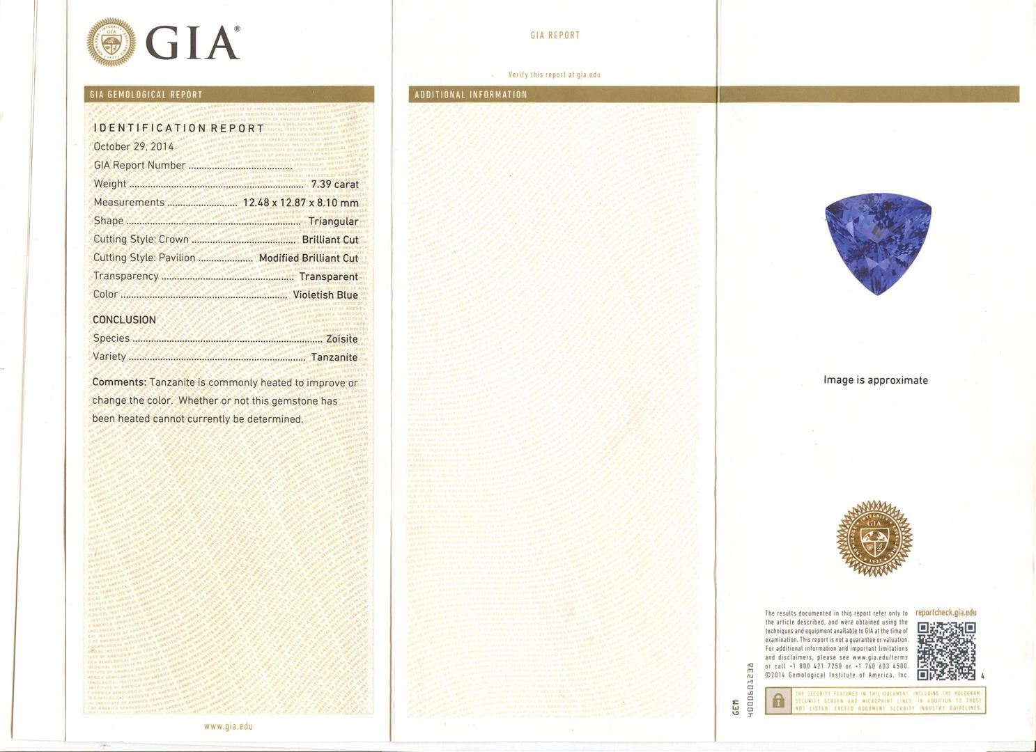 One electronically tested 14KT white gold ladies cast tanzanite and diamond ring with a bright polish finish. The featured tanzanite is set within a diamond bezel supported by diamond set three-way split shoulders, completed by a two millimeter wide band. Trademark is Orianne. Identified with markings of "14K". Condition is new, good workmanship. Containing: One prong set triangular modified brilliant cut natural tanzanite, measuring 12.48 x 12.87 x 8.10mm, exact weight 7.39ct., clarity is eye clean, type I, dark, moderately strong, violetish blue color, (GIA vB 7/4), cut is good. Transmitting light with no distortion, transparent. GIA Gemological Report attached. Graded loose prior to setting in the GIA Laboratory, Report #2161724381.Tanzanite is a very rare gemstone that is only found in the country of Tanzania. Originally discovered in 1967. Tiffany & Company, named the stone Tanzanite. It is found in the Usumburu Mountains that border the Umba Valley of northern Tanzania. Tanzanite occurs in gray, brown, violet, blue, reddish-purple, & green. The gem is interesting because of its exceptional pleochroism. Rotated in different directions a tanzanite will exhibit multiple changes of color. Tanzanite has a low tolerance to ultrasonic cleaning, and should not be cleaned using this method. Ninety prong set round brilliant cut diamonds approximate total weight of 90 Stones = 0.65ct. Graded in the setting. Clarity: I-1 to I-2. Color: H - J. Total Weight of Colored Stones 7.39ct. Total Weight of Diamonds 0.65c AIG Appraised at $21,485.00.
