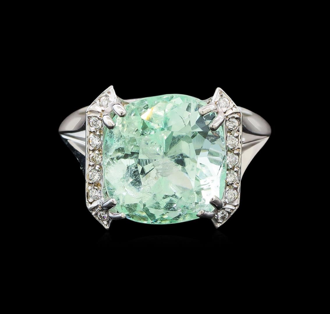 One electronically tested 14KT white gold ladies cast emerald and diamond ring with a bright polish finish. The featured emerald is set between mirroring diamond ribbons supported by a diamond ribbon under gallery and split shoulders, completed by a three millimeter wide band. Identified with markings of '14K'. Condition is new, good workmanship. Containing: One prong set cushion modified brilliant cut natural emerald, measuring 12.18 x 11.44 x 9.51mm, exact weight 7.57ct., clarity is slightly included, type III, light, very slightly grayish, green color, (GIA G 3/3), cut is good. Transmitting light with a minimum of distortion, transparent. Naturally occurring internal & external characteristics are present. Clarity enhanced. GIA Gemological Report attached. Graded loose prior to setting in the GIA Laboratory, Report #2171665056. Thirty-Two prong set round brilliant cut diamonds, measuring 1.30 - 1.20 x 0.75mm (depth est.) approximate total weight of 32 Stones = 0.30ct. The color and clarity grades reflect the entire ranges of color and clarity for this group. Graded in the setting. Clarity SI-1 to I-2. Color: F - I. Total Weight of Colored Stones 7.57ct.. Total Weight of Diamonds 0.30ct.. Total Weight of Ring 7.12gm. AIG Appraised at $13,080.00.