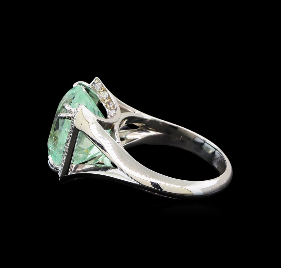 One electronically tested 14KT white gold ladies cast emerald and diamond ring with a bright polish finish. The featured emerald is set between mirroring diamond ribbons supported by a diamond ribbon under gallery and split shoulders, completed by a three millimeter wide band. Identified with markings of '14K'. Condition is new, good workmanship. Containing: One prong set cushion modified brilliant cut natural emerald, measuring 12.18 x 11.44 x 9.51mm, exact weight 7.57ct., clarity is slightly included, type III, light, very slightly grayish, green color, (GIA G 3/3), cut is good. Transmitting light with a minimum of distortion, transparent. Naturally occurring internal & external characteristics are present. Clarity enhanced. GIA Gemological Report attached. Graded loose prior to setting in the GIA Laboratory, Report #2171665056. Thirty-Two prong set round brilliant cut diamonds, measuring 1.30 - 1.20 x 0.75mm (depth est.) approximate total weight of 32 Stones = 0.30ct. The color and clarity grades reflect the entire ranges of color and clarity for this group. Graded in the setting. Clarity SI-1 to I-2. Color: F - I. Total Weight of Colored Stones 7.57ct.. Total Weight of Diamonds 0.30ct.. Total Weight of Ring 7.12gm. AIG Appraised at $13,080.00.
