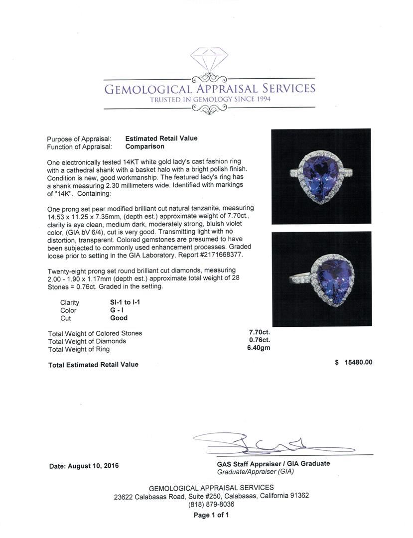 One electronically tested 14KT white gold lady's cast fashion ring with a cathedral shank with a basket halo with a bright polish finish. The featured lady's ring has a shank measuring 2.30 millimeters wide. Identified with markings of '14K'. Condition is new, good workmanship. Containing: One prong set pear modified brilliant cut natural tanzanite, measuring 14.53 x 11.25 x 7.35mm, (depth est.) approximate weight of 7.70ct., clarity is eye clean, medium dark, moderately strong, bluish violet color, (GIA bV 6/4), cut is very good. Transmitting light with no distortion, transparent. Colored gemstones are presumed to have been subjected to commonly used enhancement processes. Graded loose prior to setting in the GIA Laboratory, Report #2171668377. Twenty-Eight prong set round brilliant cut diamonds, measuring 2.00 - 1.90 x 1.17mm (depth est.) approximate total weight of 28 Stones = 0.76ct. Graded in the setting. Clarity SI-1 to I-1. Color: G - I Cut Good. Total Weight of Colored Stones 7.70ct.. Total Weight of Diamonds 0.76ct.. Total Weight of Ring 6.40gm. GAS Appraised at $15,480.00.