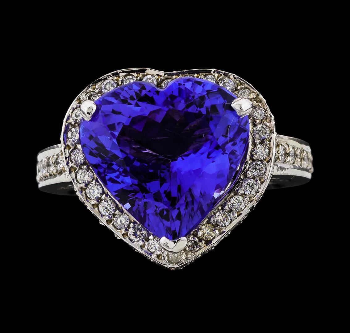 One electronically tested 14KT white gold lady's cast fashion heart shape ring with a cathedral shank with a basket halo with a bright polish finish. The featured lady's ring has a shank measuring 2.55 millimeters wide. Identified with markings of 'K14'. Condition is new, good workmanship. Containing: One prong set heart modified brilliant cut natural tanzanite, measuring 13.05 x 13.30 x 7.38mm, (depth est.) approximate weight of 7.72ct., clarity is eye clean, medium, moderately strong, bluish violet color, (GIA bV 5/4), cut is very good. Transmitting light with no distortion, transparent. Colored gemstones are presumed to have been subjected to commonly used enhancement processes. Graded loose prior to setting in the GIA Laboratory, Report #6177847958. Seventy-Eight prong set round brilliant cut diamonds, measuring 1.40 - 1.25 x 0.81mm (depth est.) approximate total weight of 78 Stones = 0.69ct. Graded in the setting. Clarity SI-1 to I-1. Color: G - I Cut Good. Total Weight of Colored Stones 7.72ct.. Total Weight of Diamonds 0.69ct.. Total Weight of Ring 9.20gm. GAS Appraised at $13,120.00.