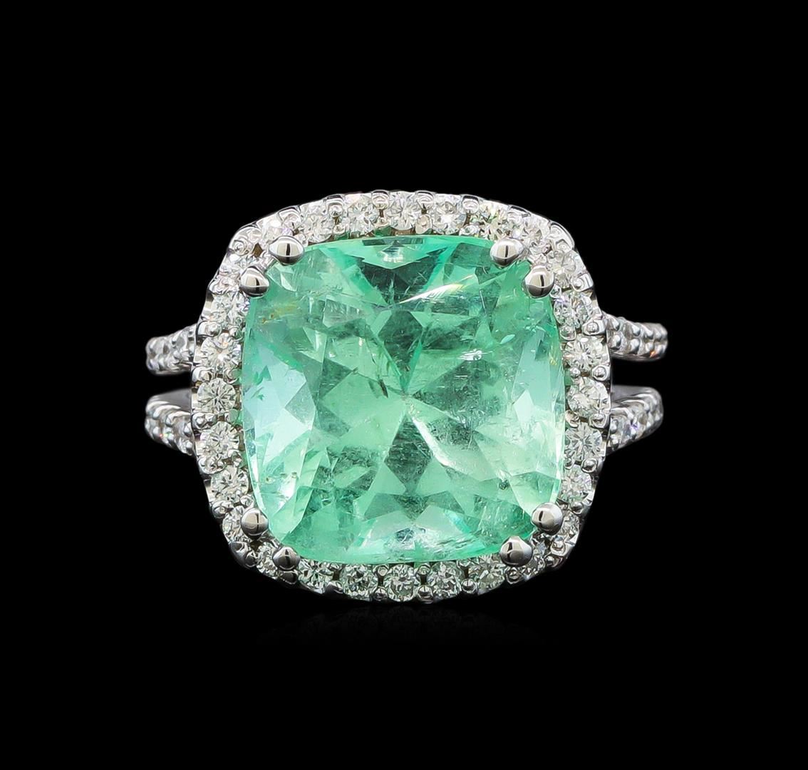 One electronically tested 14KT white gold lady's cast fashion ring with a split shank basket halo with a bright polish finish. The featured lady's ring has a shank measuring 3.70 millimeters wide. Identified with markings of '14K'. Condition is new, good workmanship. Containing: One prong set square cushion modified brilliant cut natural emerald, measuring 12.50 x 12.35 x 8.80mm, (depth est.) approximate weight of 7.73ct., clarity is slightly included, medium light, moderately strong, green color, (GIA G 4/4), cut is good. Transmitting light with a minimum of distortion, transparent. Clarity enhanced. Colored gemstones are presumed to have been subjected to commonly used enhancement processes. Graded loose prior to setting in the GIA Laboratory, Report #5171664641. Ninety-Six prong set round brilliant cut diamonds, measuring 1.50 - 1.40 x 0.87mm (depth est.) approximate total weight of 96 Stones = 1.08ct. Graded in the setting. Clarity SI-1 to I-1. Color: G - I Cut Good. Total Weight of Colored Stones 7.73ct.. Total Weight of Diamonds 1.08ct.. Total Weight of Ring 7.80gm. GAS Appraised at $15,065.00.