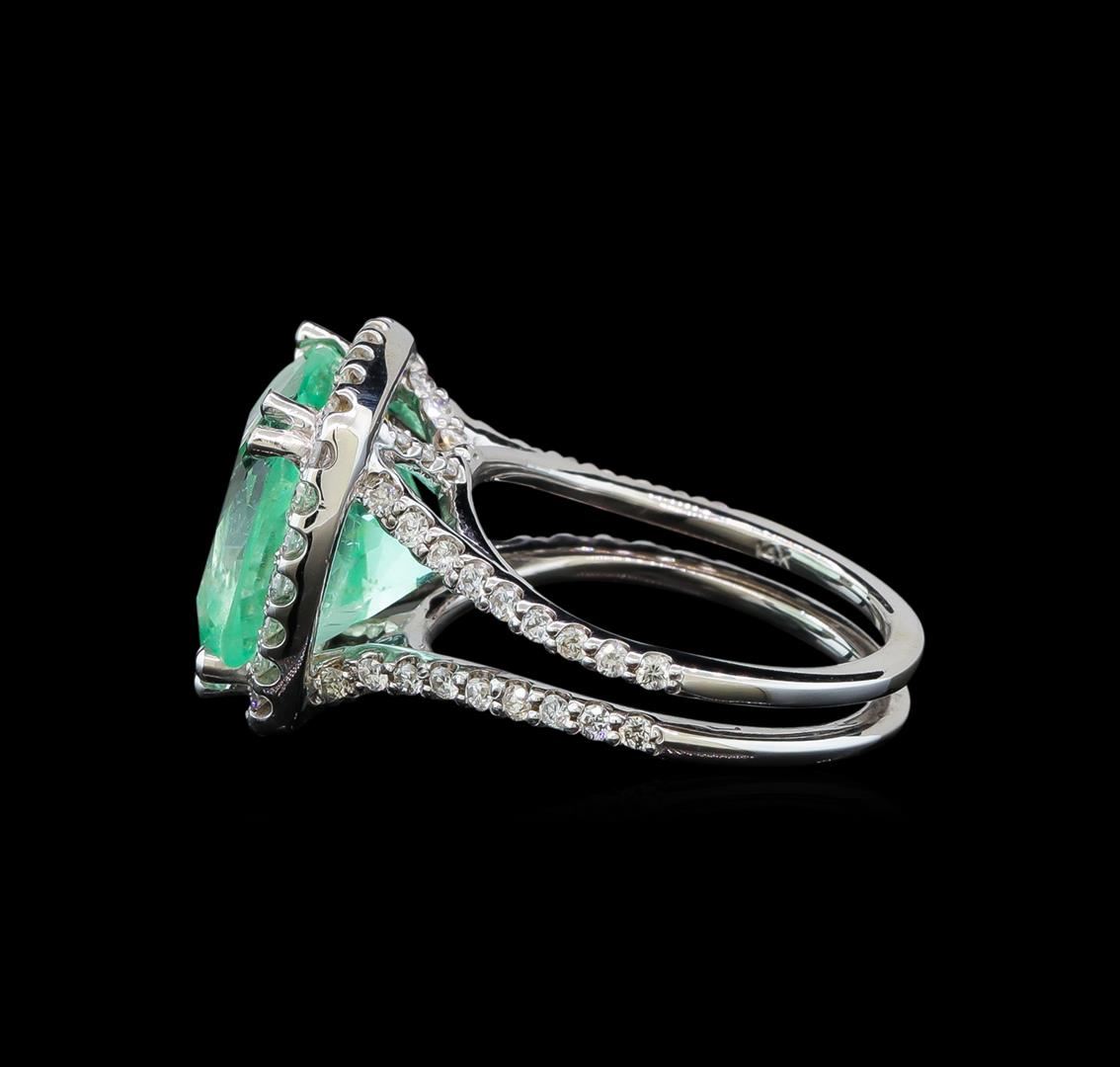 One electronically tested 14KT white gold lady's cast fashion ring with a split shank basket halo with a bright polish finish. The featured lady's ring has a shank measuring 3.70 millimeters wide. Identified with markings of '14K'. Condition is new, good workmanship. Containing: One prong set square cushion modified brilliant cut natural emerald, measuring 12.50 x 12.35 x 8.80mm, (depth est.) approximate weight of 7.73ct., clarity is slightly included, medium light, moderately strong, green color, (GIA G 4/4), cut is good. Transmitting light with a minimum of distortion, transparent. Clarity enhanced. Colored gemstones are presumed to have been subjected to commonly used enhancement processes. Graded loose prior to setting in the GIA Laboratory, Report #5171664641. Ninety-Six prong set round brilliant cut diamonds, measuring 1.50 - 1.40 x 0.87mm (depth est.) approximate total weight of 96 Stones = 1.08ct. Graded in the setting. Clarity SI-1 to I-1. Color: G - I Cut Good. Total Weight of Colored Stones 7.73ct.. Total Weight of Diamonds 1.08ct.. Total Weight of Ring 7.80gm. GAS Appraised at $15,065.00.