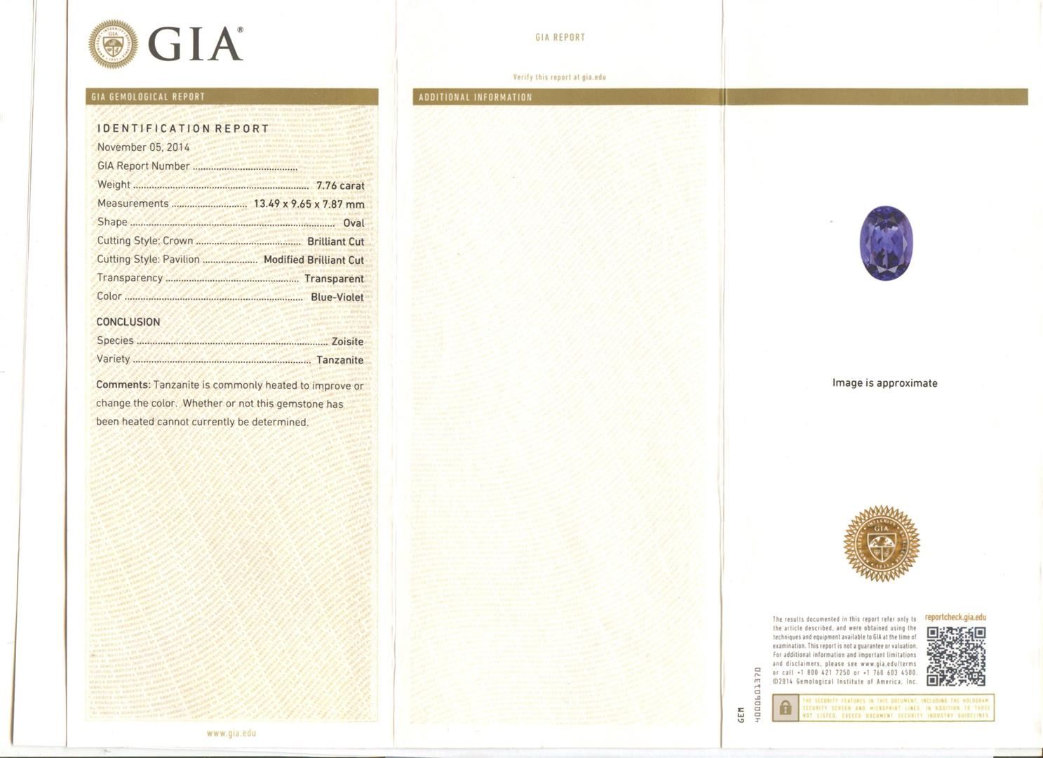One electronically tested 18KT white gold ladies cast tanzanite and diamond ring with a bright polish finish. The featured tanzanite is set within a diamond bezel supported by diamond set shoulders, completed by a one and one-half millimeter wide band. Trademark is Orianne. Identified with markings of "18K". Condition is new, good workmanship. Containing: One prong set oval modified brilliant cut natural tanzanite, measuring 13.49 x 9.65 x 7.87mm, exact weight 7.76ct., type I Clarity is eye clean, dark, moderately strong, blue-violet color, (GIA BV), cut is good. Transmitting light with no distortion, transparent. GIA Gemological Report attached. Graded loose prior to setting in the GIA Laboratory, Report #1166724862.Tanzanite is a very rare gemstone that is only found in the country of Tanzania. Originally discovered in 1967. Tiffany & Company, named the stone Tanzanite. It is found in the Usumburu Mountains that border the Umba Valley of northern Tanzania. Tanzanite occurs in gray, brown, violet, blue, reddish-purple, & green. The gem is interesting because of its exceptional pleochroism. Rotated in different directions a tanzanite will exhibit multiple changes of color. Tanzanite has a low tolerance to ultrasonic cleaning, and should not be cleaned using this method. Thirty-Six prong set round brilliant cut diamonds, measuring 1.60 - 1.50 x 0.93mm (depth est.) approximate total weight of 36 Stones = 0.56ct. Graded in the setting. Clarity: SI-1 to I-1. Color: G - I. Total Weight of Colored Stones 7.76ct. Total Weight of Diamonds 0.56ct. AIG Appraised at $22,290.00.
