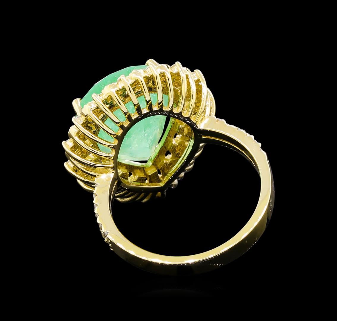 One electronically tested 14KT yellow gold lady's cast fashion ring with a basket halo with a bright polish with milgrain detailing finish. The featured lady's ring has a shank measuring 2.82 millimeters wide. Identified with markings of "K14". Condition is new, good workmanship. Containing: One prong set pear modified brilliant cut natural emerald, measuring 16.24 x 11.78 x 7.98mm, exact weight 7.89ct., clarity is heavily included, type III, medium light, very slightly grayish, green color, (GIA G 4/3), cut is good. Transmitting light somewhat diffusely, semi-transparent to translucent. Naturally occurring internal & external characteristics are present. Clarity enhanced. Graded loose prior to setting in the GIA Laboratory, Report #2175501596.Forty-One prong set round brilliant cut diamonds, measuring 1.30 - 1.25 x 0.79mm (depth est.) approximate total weight of 41 Stones = 0.33ct. Graded in the setting. Clarity: SI-1 to SI-2. Color: H - I. Cut Good Seventeen prong set round brilliant cut diamonds, measuring 1.10 - 1.00 x 0.65mm (depth est.) approximate total weight of 17 Stones = 0.08ct. Graded in the setting. Clarity: SI-1 to SI-2. Color: H - I. Cut Good. Total Weight of Colored Stones 7.89ct. Total Weight of Diamonds 0.41ct. Total Weight of Ring 7.40gm. GAS Appraised at $7,945.00.