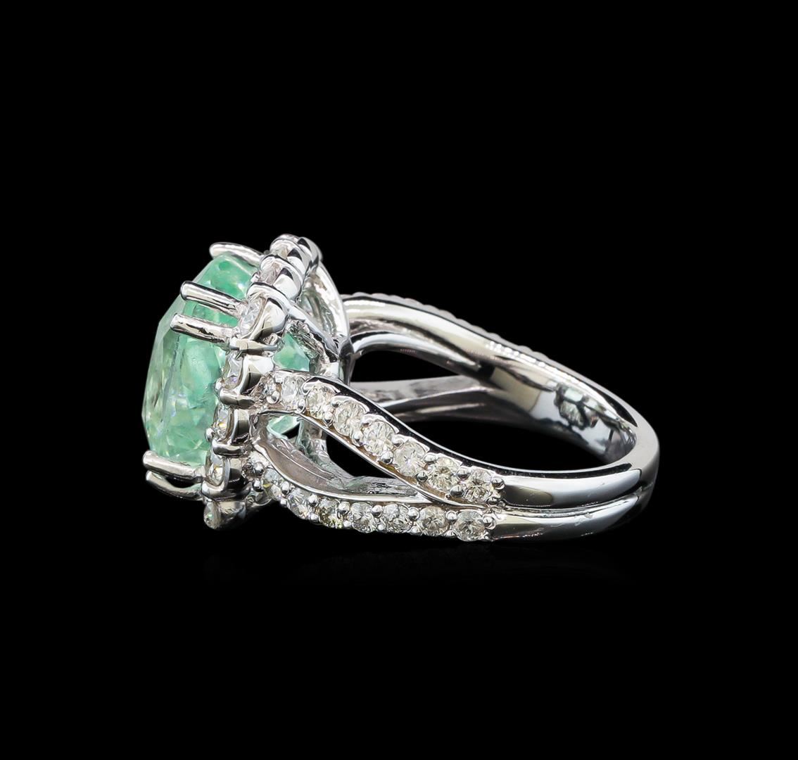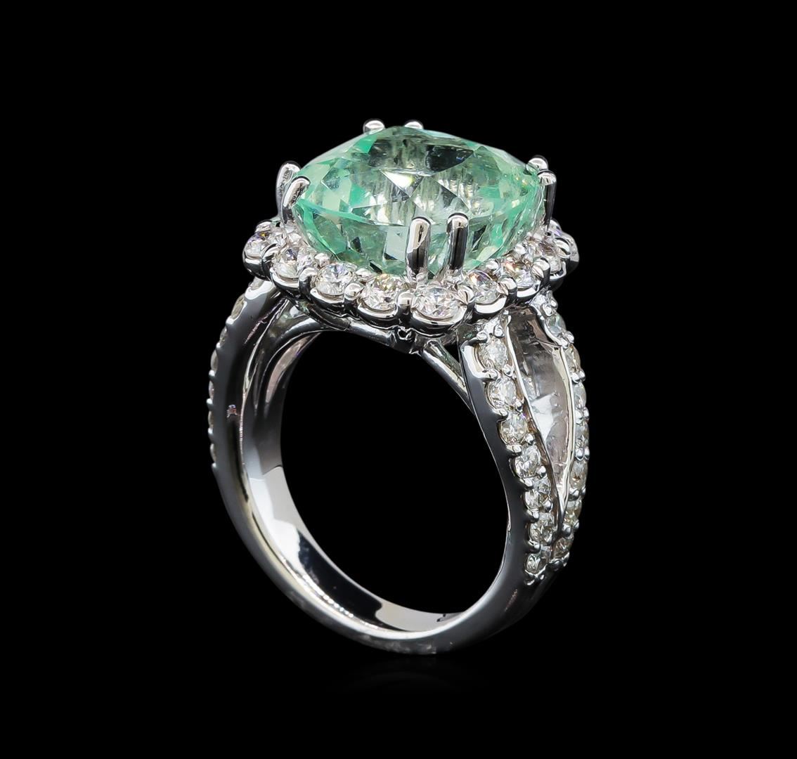 One electronically tested 14KT white gold lady's cast fashion ring with a split shank basket halo with a bright polish finish. The featured lady's ring has a double shank measuring 3.65 millimeters wide. Identified with markings of '14K'. Condition is new, good workmanship. Containing: One prong set square cushion modified brilliant cut natural emerald, measuring 12.14 x 12.02 x 9.80mm, (depth est.) approximate weight of 8.39ct., clarity is moderately included, light, moderately strong, green color, (GIA G 3/4), cut is good. Transmitting light somewhat diffusely, transparent to translucent. Naturally occurring internal & external characteristics are present. Clarity enhanced. Colored gemstones are presumed to have been subjected to commonly used enhancement processes. Graded loose prior to setting in the GIA Laboratory, Report #5172664536. Sixteen prong set round brilliant cut diamonds, measuring 2.60 - 2.50 x 1.58mm (depth est.) approximate total weight of 16 Stones = 1.06ct. Graded in the setting. Clarity SI-1 to I-1. Color: H - I Cut Good Twenty-Eight prong set round brilliant cut diamonds, measuring 1.70 - 1.60 x 1.02mm (depth est.) approximate total weight of 28 Stones = 0.49ct. Graded in the setting. Clarity SI-1 to SI-2. Color: H - I Cut Good. Total Weight of Colored Stones 8.39ct.. Total Weight of Diamonds 1.55ct.. Total Weight of Ring 10.60gm. GAS Appraised at $15,030.00.