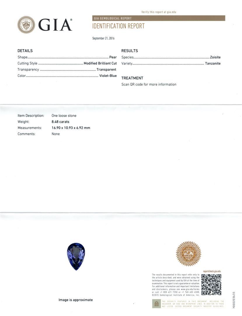 One electronically tested 14KT white gold lady's cast fashion ring with a triple basket halo with a bright polish finish. The featured lady's ring has a shank measuring 3.26 millimeters wide. Identified with markings of 'K14'. Condition is new, good workmanship. Containing: One prong set pear modified brilliant cut natural tanzanite, measuring 16.90 x 10.93 x 6.92mm, (depth est.) approximate weight of 8.48ct., clarity is eye clean, medium, moderately strong, violetish blue color, (GIA vB 5/4), cut is very good. Transmitting light with no distortion, transparent. Colored gemstones are presumed to have been subjected to commonly used enhancement processes. Graded loose prior to setting in the GIA Laboratory, Report #1172847783. Nineteen prong set round brilliant cut diamonds, measuring 2.00 - 1.90 x 1.21mm (depth est.) approximate total weight of 19 Stones = 0.53ct. Graded in the setting. Clarity SI-1 to SI-2. Color: H - I Cut Good Thirty-Two prong set round brilliant cut diamonds, measuring 1.70 - 1.60 x 1.02mm (depth est.) approximate total weight of 32 Stones = 0.54ct. Graded in the setting. Clarity SI-1 to SI-2. Color: H - I Cut Good Sixty-Four prong set round brilliant cut diamonds, measuring 1.25 - 1.15 x 0.72mm (depth est.) approximate total weight of 64 Stones = 0.40ct. Graded in the setting. Clarity SI-1 to I-1. Color: H - I Cut Good. Total Weight of Colored Stones 8.48ct.. Total Weight of Diamonds 1.47ct.. Total Weight of Ring 12.90gm. GAS Appraised at $16,550.00.